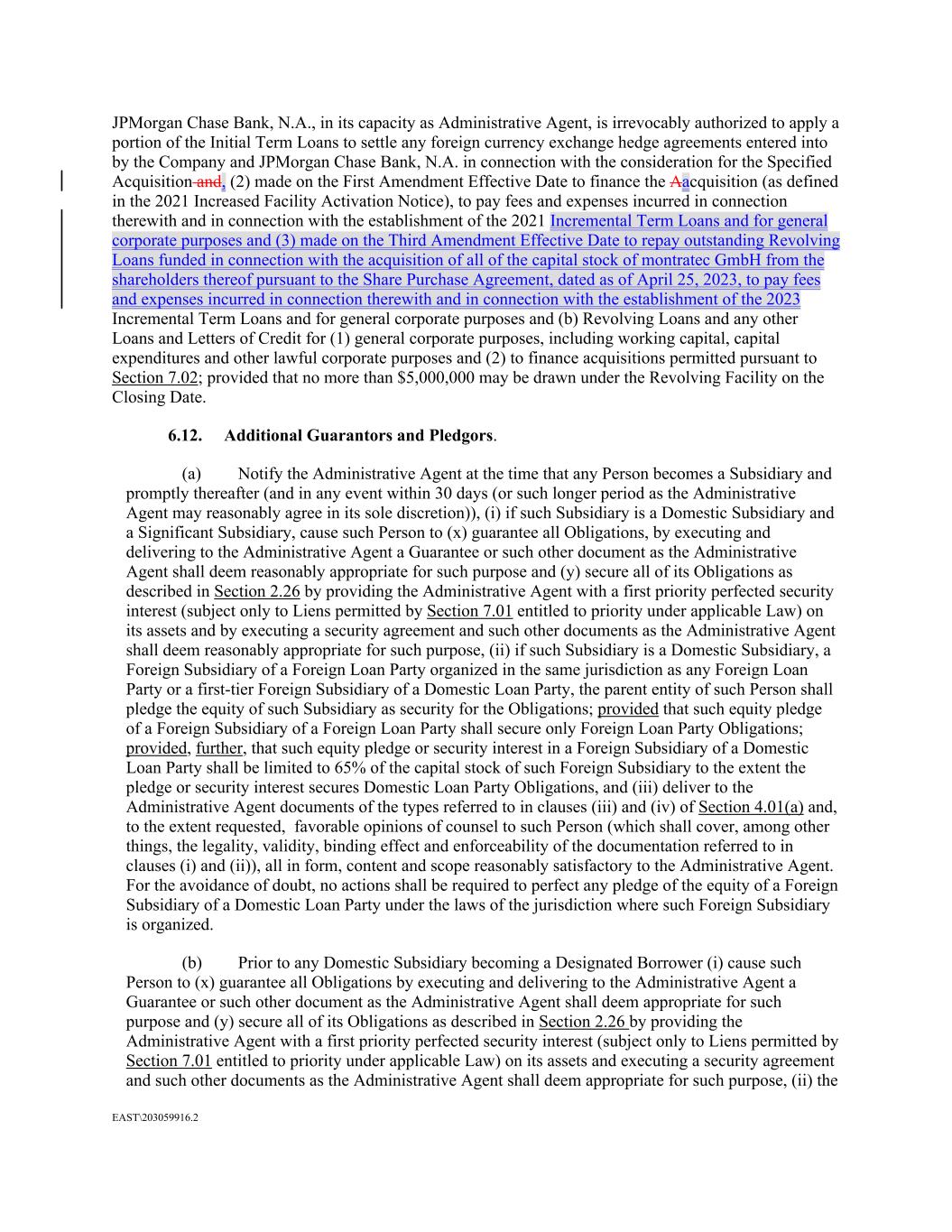 JPMorgan Chase Bank, N.A., in its capacity as Administrative Agent, is irrevocably authorized to apply a portion of the Initial Term Loans to settle any foreign currency exchange hedge agreements entered into by the Company and JPMorgan Chase Bank, N.A. in connection with the consideration for the Specified Acquisition and, (2) made on the First Amendment Effective Date to finance the Aacquisition (as defined in the 2021 Increased Facility Activation Notice), to pay fees and expenses incurred in connection therewith and in connection with the establishment of the 2021 Incremental Term Loans and for general corporate purposes and (3) made on the Third Amendment Effective Date to repay outstanding Revolving Loans funded in connection with the acquisition of all of the capital stock of montratec GmbH from the shareholders thereof pursuant to the Share Purchase Agreement, dated as of April 25, 2023, to pay fees and expenses incurred in connection therewith and in connection with the establishment of the 2023 Incremental Term Loans and for general corporate purposes and (b) Revolving Loans and any other Loans and Letters of Credit for (1) general corporate purposes, including working capital, capital expenditures and other lawful corporate purposes and (2) to finance acquisitions permitted pursuant to Section 7.02; provided that no more than $5,000,000 may be drawn under the Revolving Facility on the Closing Date. 6.12. Additional Guarantors and Pledgors. (a) Notify the Administrative Agent at the time that any Person becomes a Subsidiary and promptly thereafter (and in any event within 30 days (or such longer period as the Administrative Agent may reasonably agree in its sole discretion)), (i) if such Subsidiary is a Domestic Subsidiary and a Significant Subsidiary, cause such Person to (x) guarantee all Obligations, by executing and delivering to the Administrative Agent a Guarantee or such other document as the Administrative Agent shall deem reasonably appropriate for such purpose and (y) secure all of its Obligations as described in Section 2.26 by providing the Administrative Agent with a first priority perfected security interest (subject only to Liens permitted by Section 7.01 entitled to priority under applicable Law) on its assets and by executing a security agreement and such other documents as the Administrative Agent shall deem reasonably appropriate for such purpose, (ii) if such Subsidiary is a Domestic Subsidiary, a Foreign Subsidiary of a Foreign Loan Party organized in the same jurisdiction as any Foreign Loan Party or a first-tier Foreign Subsidiary of a Domestic Loan Party, the parent entity of such Person shall pledge the equity of such Subsidiary as security for the Obligations; provided that such equity pledge of a Foreign Subsidiary of a Foreign Loan Party shall secure only Foreign Loan Party Obligations; provided, further, that such equity pledge or security interest in a Foreign Subsidiary of a Domestic Loan Party shall be limited to 65% of the capital stock of such Foreign Subsidiary to the extent the pledge or security interest secures Domestic Loan Party Obligations, and (iii) deliver to the Administrative Agent documents of the types referred to in clauses (iii) and (iv) of Section 4.01(a) and, to the extent requested, favorable opinions of counsel to such Person (which shall cover, among other things, the legality, validity, binding effect and enforceability of the documentation referred to in clauses (i) and (ii)), all in form, content and scope reasonably satisfactory to the Administrative Agent. For the avoidance of doubt, no actions shall be required to perfect any pledge of the equity of a Foreign Subsidiary of a Domestic Loan Party under the laws of the jurisdiction where such Foreign Subsidiary is organized. (b) Prior to any Domestic Subsidiary becoming a Designated Borrower (i) cause such Person to (x) guarantee all Obligations by executing and delivering to the Administrative Agent a Guarantee or such other document as the Administrative Agent shall deem appropriate for such purpose and (y) secure all of its Obligations as described in Section 2.26 by providing the Administrative Agent with a first priority perfected security interest (subject only to Liens permitted by Section 7.01 entitled to priority under applicable Law) on its assets and executing a security agreement and such other documents as the Administrative Agent shall deem appropriate for such purpose, (ii) the EAST\203059916.2