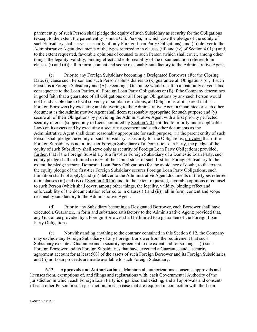 parent entity of such Person shall pledge the equity of such Subsidiary as security for the Obligations (except to the extent the parent entity is not a U.S. Person, in which case the pledge of the equity of such Subsidiary shall serve as security of only Foreign Loan Party Obligations), and (iii) deliver to the Administrative Agent documents of the types referred to in clauses (iii) and (iv) of Section 4.01(a) and, to the extent requested, favorable opinions of counsel to such Person (which shall cover, among other things, the legality, validity, binding effect and enforceability of the documentation referred to in clauses (i) and (ii)), all in form, content and scope reasonably satisfactory to the Administrative Agent. (c) Prior to any Foreign Subsidiary becoming a Designated Borrower after the Closing Date, (i) cause such Person and such Person’s Subsidiaries to (x) guarantee all Obligations (or, if such Person is a Foreign Subsidiary and (A) executing a Guarantee would result in a materially adverse tax consequence to the Loan Parties, all Foreign Loan Party Obligations or (B) if the Company determines in good faith that a guarantee of all Obligations or all Foreign Obligations by any such Person would not be advisable due to local solvency or similar restrictions, all Obligations of its parent that is a Foreign Borrower) by executing and delivering to the Administrative Agent a Guarantee or such other document as the Administrative Agent shall deem reasonably appropriate for such purpose and (y) secure all of their Obligations by providing the Administrative Agent with a first priority perfected security interest (subject only to Liens permitted by Section 7.01 entitled to priority under applicable Law) on its assets and by executing a security agreement and such other documents as the Administrative Agent shall deem reasonably appropriate for such purpose, (ii) the parent entity of such Person shall pledge the equity of such Subsidiary as security for the Obligations; provided that if the Foreign Subsidiary is not a first-tier Foreign Subsidiary of a Domestic Loan Party, the pledge of the equity of such Subsidiary shall serve only as security of Foreign Loan Party Obligations; provided, further, that if the Foreign Subsidiary is a first-tier Foreign Subsidiary of a Domestic Loan Party, such equity pledge shall be limited to 65% of the capital stock of such first-tier Foreign Subsidiary to the extent the pledge secures Domestic Loan Party Obligations (for the avoidance of doubt, to the extent the equity pledge of the first-tier Foreign Subsidiary secures Foreign Loan Party Obligations, such limitation shall not apply), and (iii) deliver to the Administrative Agent documents of the types referred to in clauses (iii) and (iv) of Section 4.01(a) and, to the extent requested, favorable opinions of counsel to such Person (which shall cover, among other things, the legality, validity, binding effect and enforceability of the documentation referred to in clauses (i) and (ii)), all in form, content and scope reasonably satisfactory to the Administrative Agent. (d) Prior to any Subsidiary becoming a Designated Borrower, each Borrower shall have executed a Guarantee, in form and substance satisfactory to the Administrative Agent; provided that, any Guarantee provided by a Foreign Borrower shall be limited to a guarantee of the Foreign Loan Party Obligations. (e) Notwithstanding anything to the contrary contained in this Section 6.12, the Company may exclude any Foreign Subsidiary of any Foreign Borrower from the requirement that such Subsidiary execute a Guarantee and a security agreement to the extent and for so long as (i) such Foreign Borrower and its Foreign Subsidiaries that have executed a Guarantee and a security agreement account for at least 50% of the assets of such Foreign Borrower and its Foreign Subsidiaries and (ii) no Loan proceeds are made available to such Foreign Subsidiary. 6.13. Approvals and Authorizations. Maintain all authorizations, consents, approvals and licenses from, exemptions of, and filings and registrations with, each Governmental Authority of the jurisdiction in which each Foreign Loan Party is organized and existing, and all approvals and consents of each other Person in such jurisdiction, in each case that are required in connection with the Loan EAST\203059916.2