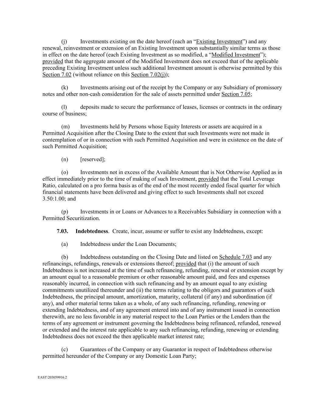 (j) Investments existing on the date hereof (each an “Existing Investment”) and any renewal, reinvestment or extension of an Existing Investment upon substantially similar terms as those in effect on the date hereof (each Existing Investment as so modified, a “Modified Investment”); provided that the aggregate amount of the Modified Investment does not exceed that of the applicable preceding Existing Investment unless such additional Investment amount is otherwise permitted by this Section 7.02 (without reliance on this Section 7.02(j)); (k) Investments arising out of the receipt by the Company or any Subsidiary of promissory notes and other non-cash consideration for the sale of assets permitted under Section 7.05; (l) deposits made to secure the performance of leases, licenses or contracts in the ordinary course of business; (m) Investments held by Persons whose Equity Interests or assets are acquired in a Permitted Acquisition after the Closing Date to the extent that such Investments were not made in contemplation of or in connection with such Permitted Acquisition and were in existence on the date of such Permitted Acquisition; (n) [reserved]; (o) Investments not in excess of the Available Amount that is Not Otherwise Applied as in effect immediately prior to the time of making of such Investment, provided that the Total Leverage Ratio, calculated on a pro forma basis as of the end of the most recently ended fiscal quarter for which financial statements have been delivered and giving effect to such Investments shall not exceed 3.50:1.00; and (p) Investments in or Loans or Advances to a Receivables Subsidiary in connection with a Permitted Securitization. 7.03. Indebtedness. Create, incur, assume or suffer to exist any Indebtedness, except: (a) Indebtedness under the Loan Documents; (b) Indebtedness outstanding on the Closing Date and listed on Schedule 7.03 and any refinancings, refundings, renewals or extensions thereof; provided that (i) the amount of such Indebtedness is not increased at the time of such refinancing, refunding, renewal or extension except by an amount equal to a reasonable premium or other reasonable amount paid, and fees and expenses reasonably incurred, in connection with such refinancing and by an amount equal to any existing commitments unutilized thereunder and (ii) the terms relating to the obligors and guarantors of such Indebtedness, the principal amount, amortization, maturity, collateral (if any) and subordination (if any), and other material terms taken as a whole, of any such refinancing, refunding, renewing or extending Indebtedness, and of any agreement entered into and of any instrument issued in connection therewith, are no less favorable in any material respect to the Loan Parties or the Lenders than the terms of any agreement or instrument governing the Indebtedness being refinanced, refunded, renewed or extended and the interest rate applicable to any such refinancing, refunding, renewing or extending Indebtedness does not exceed the then applicable market interest rate; (c) Guarantees of the Company or any Guarantor in respect of Indebtedness otherwise permitted hereunder of the Company or any Domestic Loan Party; EAST\203059916.2