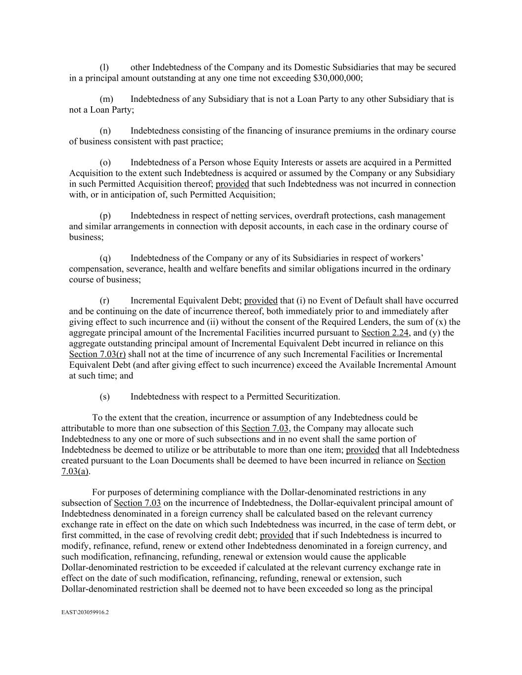 (l) other Indebtedness of the Company and its Domestic Subsidiaries that may be secured in a principal amount outstanding at any one time not exceeding $30,000,000; (m) Indebtedness of any Subsidiary that is not a Loan Party to any other Subsidiary that is not a Loan Party; (n) Indebtedness consisting of the financing of insurance premiums in the ordinary course of business consistent with past practice; (o) Indebtedness of a Person whose Equity Interests or assets are acquired in a Permitted Acquisition to the extent such Indebtedness is acquired or assumed by the Company or any Subsidiary in such Permitted Acquisition thereof; provided that such Indebtedness was not incurred in connection with, or in anticipation of, such Permitted Acquisition; (p) Indebtedness in respect of netting services, overdraft protections, cash management and similar arrangements in connection with deposit accounts, in each case in the ordinary course of business; (q) Indebtedness of the Company or any of its Subsidiaries in respect of workers’ compensation, severance, health and welfare benefits and similar obligations incurred in the ordinary course of business; (r) Incremental Equivalent Debt; provided that (i) no Event of Default shall have occurred and be continuing on the date of incurrence thereof, both immediately prior to and immediately after giving effect to such incurrence and (ii) without the consent of the Required Lenders, the sum of (x) the aggregate principal amount of the Incremental Facilities incurred pursuant to Section 2.24, and (y) the aggregate outstanding principal amount of Incremental Equivalent Debt incurred in reliance on this Section 7.03(r) shall not at the time of incurrence of any such Incremental Facilities or Incremental Equivalent Debt (and after giving effect to such incurrence) exceed the Available Incremental Amount at such time; and (s) Indebtedness with respect to a Permitted Securitization. To the extent that the creation, incurrence or assumption of any Indebtedness could be attributable to more than one subsection of this Section 7.03, the Company may allocate such Indebtedness to any one or more of such subsections and in no event shall the same portion of Indebtedness be deemed to utilize or be attributable to more than one item; provided that all Indebtedness created pursuant to the Loan Documents shall be deemed to have been incurred in reliance on Section 7.03(a). For purposes of determining compliance with the Dollar-denominated restrictions in any subsection of Section 7.03 on the incurrence of Indebtedness, the Dollar-equivalent principal amount of Indebtedness denominated in a foreign currency shall be calculated based on the relevant currency exchange rate in effect on the date on which such Indebtedness was incurred, in the case of term debt, or first committed, in the case of revolving credit debt; provided that if such Indebtedness is incurred to modify, refinance, refund, renew or extend other Indebtedness denominated in a foreign currency, and such modification, refinancing, refunding, renewal or extension would cause the applicable Dollar-denominated restriction to be exceeded if calculated at the relevant currency exchange rate in effect on the date of such modification, refinancing, refunding, renewal or extension, such Dollar-denominated restriction shall be deemed not to have been exceeded so long as the principal EAST\203059916.2