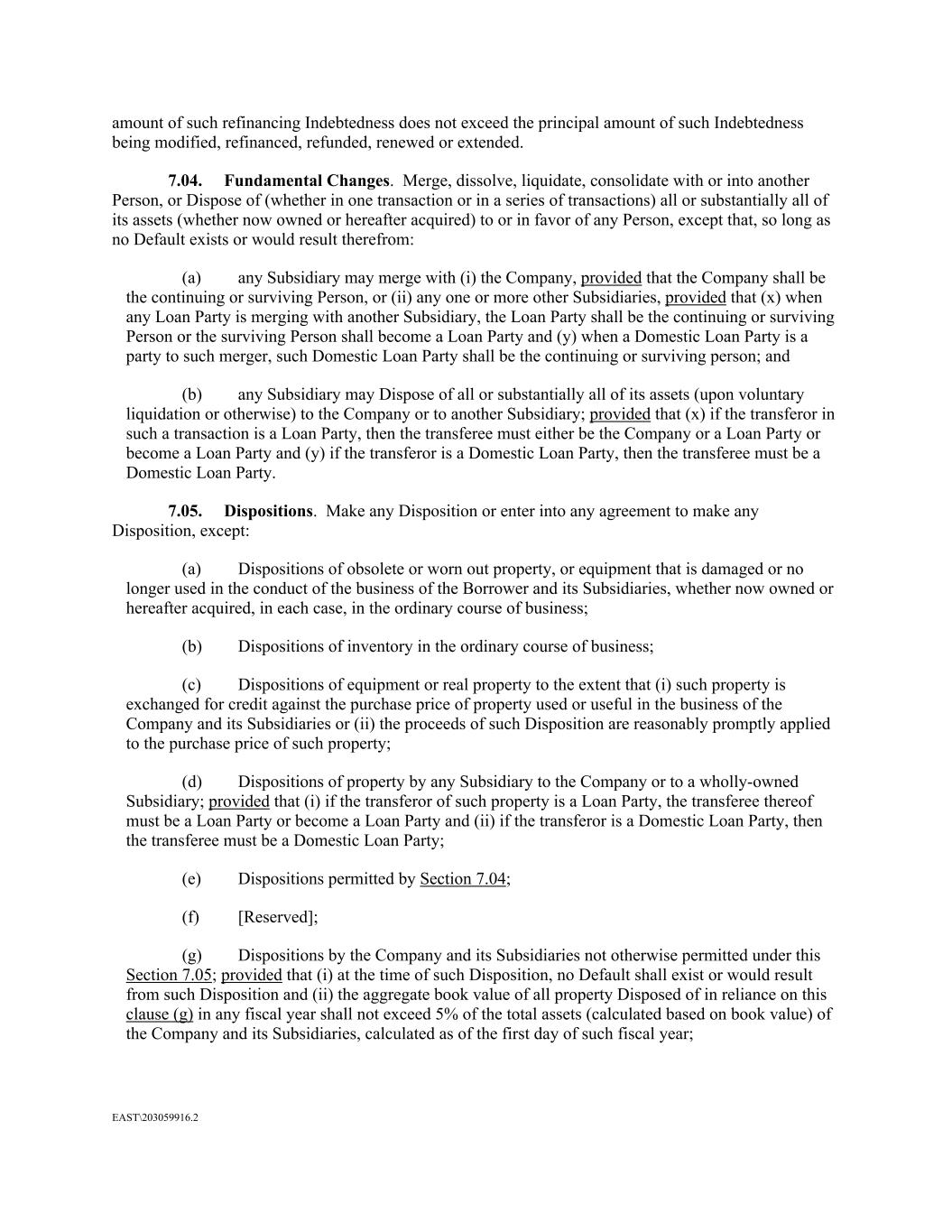 amount of such refinancing Indebtedness does not exceed the principal amount of such Indebtedness being modified, refinanced, refunded, renewed or extended. 7.04. Fundamental Changes. Merge, dissolve, liquidate, consolidate with or into another Person, or Dispose of (whether in one transaction or in a series of transactions) all or substantially all of its assets (whether now owned or hereafter acquired) to or in favor of any Person, except that, so long as no Default exists or would result therefrom: (a) any Subsidiary may merge with (i) the Company, provided that the Company shall be the continuing or surviving Person, or (ii) any one or more other Subsidiaries, provided that (x) when any Loan Party is merging with another Subsidiary, the Loan Party shall be the continuing or surviving Person or the surviving Person shall become a Loan Party and (y) when a Domestic Loan Party is a party to such merger, such Domestic Loan Party shall be the continuing or surviving person; and (b) any Subsidiary may Dispose of all or substantially all of its assets (upon voluntary liquidation or otherwise) to the Company or to another Subsidiary; provided that (x) if the transferor in such a transaction is a Loan Party, then the transferee must either be the Company or a Loan Party or become a Loan Party and (y) if the transferor is a Domestic Loan Party, then the transferee must be a Domestic Loan Party. 7.05. Dispositions. Make any Disposition or enter into any agreement to make any Disposition, except: (a) Dispositions of obsolete or worn out property, or equipment that is damaged or no longer used in the conduct of the business of the Borrower and its Subsidiaries, whether now owned or hereafter acquired, in each case, in the ordinary course of business; (b) Dispositions of inventory in the ordinary course of business; (c) Dispositions of equipment or real property to the extent that (i) such property is exchanged for credit against the purchase price of property used or useful in the business of the Company and its Subsidiaries or (ii) the proceeds of such Disposition are reasonably promptly applied to the purchase price of such property; (d) Dispositions of property by any Subsidiary to the Company or to a wholly-owned Subsidiary; provided that (i) if the transferor of such property is a Loan Party, the transferee thereof must be a Loan Party or become a Loan Party and (ii) if the transferor is a Domestic Loan Party, then the transferee must be a Domestic Loan Party; (e) Dispositions permitted by Section 7.04; (f) [Reserved]; (g) Dispositions by the Company and its Subsidiaries not otherwise permitted under this Section 7.05; provided that (i) at the time of such Disposition, no Default shall exist or would result from such Disposition and (ii) the aggregate book value of all property Disposed of in reliance on this clause (g) in any fiscal year shall not exceed 5% of the total assets (calculated based on book value) of the Company and its Subsidiaries, calculated as of the first day of such fiscal year; EAST\203059916.2