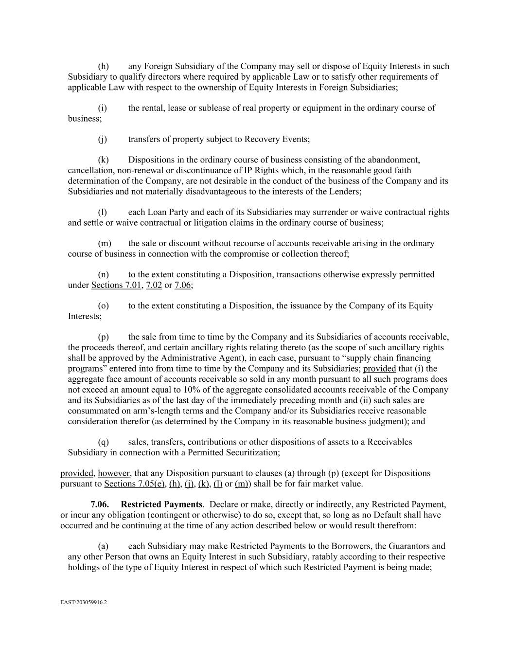 (h) any Foreign Subsidiary of the Company may sell or dispose of Equity Interests in such Subsidiary to qualify directors where required by applicable Law or to satisfy other requirements of applicable Law with respect to the ownership of Equity Interests in Foreign Subsidiaries; (i) the rental, lease or sublease of real property or equipment in the ordinary course of business; (j) transfers of property subject to Recovery Events; (k) Dispositions in the ordinary course of business consisting of the abandonment, cancellation, non-renewal or discontinuance of IP Rights which, in the reasonable good faith determination of the Company, are not desirable in the conduct of the business of the Company and its Subsidiaries and not materially disadvantageous to the interests of the Lenders; (l) each Loan Party and each of its Subsidiaries may surrender or waive contractual rights and settle or waive contractual or litigation claims in the ordinary course of business; (m) the sale or discount without recourse of accounts receivable arising in the ordinary course of business in connection with the compromise or collection thereof; (n) to the extent constituting a Disposition, transactions otherwise expressly permitted under Sections 7.01, 7.02 or 7.06; (o) to the extent constituting a Disposition, the issuance by the Company of its Equity Interests; (p) the sale from time to time by the Company and its Subsidiaries of accounts receivable, the proceeds thereof, and certain ancillary rights relating thereto (as the scope of such ancillary rights shall be approved by the Administrative Agent), in each case, pursuant to “supply chain financing programs” entered into from time to time by the Company and its Subsidiaries; provided that (i) the aggregate face amount of accounts receivable so sold in any month pursuant to all such programs does not exceed an amount equal to 10% of the aggregate consolidated accounts receivable of the Company and its Subsidiaries as of the last day of the immediately preceding month and (ii) such sales are consummated on arm’s-length terms and the Company and/or its Subsidiaries receive reasonable consideration therefor (as determined by the Company in its reasonable business judgment); and (q) sales, transfers, contributions or other dispositions of assets to a Receivables Subsidiary in connection with a Permitted Securitization; provided, however, that any Disposition pursuant to clauses (a) through (p) (except for Dispositions pursuant to Sections 7.05(e), (h), (j), (k), (l) or (m)) shall be for fair market value. 7.06. Restricted Payments. Declare or make, directly or indirectly, any Restricted Payment, or incur any obligation (contingent or otherwise) to do so, except that, so long as no Default shall have occurred and be continuing at the time of any action described below or would result therefrom: (a) each Subsidiary may make Restricted Payments to the Borrowers, the Guarantors and any other Person that owns an Equity Interest in such Subsidiary, ratably according to their respective holdings of the type of Equity Interest in respect of which such Restricted Payment is being made; EAST\203059916.2