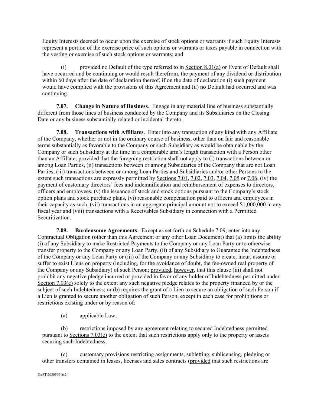 Equity Interests deemed to occur upon the exercise of stock options or warrants if such Equity Interests represent a portion of the exercise price of such options or warrants or taxes payable in connection with the vesting or exercise of such stock options or warrants; and (i) provided no Default of the type referred to in Section 8.01(a) or Event of Default shall have occurred and be continuing or would result therefrom, the payment of any dividend or distribution within 60 days after the date of declaration thereof, if on the date of declaration (i) such payment would have complied with the provisions of this Agreement and (ii) no Default had occurred and was continuing. 7.07. Change in Nature of Business. Engage in any material line of business substantially different from those lines of business conducted by the Company and its Subsidiaries on the Closing Date or any business substantially related or incidental thereto. 7.08. Transactions with Affiliates. Enter into any transaction of any kind with any Affiliate of the Company, whether or not in the ordinary course of business, other than on fair and reasonable terms substantially as favorable to the Company or such Subsidiary as would be obtainable by the Company or such Subsidiary at the time in a comparable arm’s length transaction with a Person other than an Affiliate; provided that the foregoing restriction shall not apply to (i) transactions between or among Loan Parties, (ii) transactions between or among Subsidiaries of the Company that are not Loan Parties, (iii) transactions between or among Loan Parties and Subsidiaries and/or other Persons to the extent such transactions are expressly permitted by Sections 7.01, 7.02, 7.03, 7.04, 7.05 or 7.06, (iv) the payment of customary directors’ fees and indemnification and reimbursement of expenses to directors, officers and employees, (v) the issuance of stock and stock options pursuant to the Company’s stock option plans and stock purchase plans, (vi) reasonable compensation paid to officers and employees in their capacity as such, (vii) transactions in an aggregate principal amount not to exceed $1,000,000 in any fiscal year and (viii) transactions with a Receivables Subsidiary in connection with a Permitted Securitization. 7.09. Burdensome Agreements. Except as set forth on Schedule 7.09, enter into any Contractual Obligation (other than this Agreement or any other Loan Document) that (a) limits the ability (i) of any Subsidiary to make Restricted Payments to the Company or any Loan Party or to otherwise transfer property to the Company or any Loan Party, (ii) of any Subsidiary to Guarantee the Indebtedness of the Company or any Loan Party or (iii) of the Company or any Subsidiary to create, incur, assume or suffer to exist Liens on property (including, for the avoidance of doubt, the fee-owned real property of the Company or any Subsidiary) of such Person; provided, however, that this clause (iii) shall not prohibit any negative pledge incurred or provided in favor of any holder of Indebtedness permitted under Section 7.03(e) solely to the extent any such negative pledge relates to the property financed by or the subject of such Indebtedness; or (b) requires the grant of a Lien to secure an obligation of such Person if a Lien is granted to secure another obligation of such Person, except in each case for prohibitions or restrictions existing under or by reason of: (a) applicable Law; (b) restrictions imposed by any agreement relating to secured Indebtedness permitted pursuant to Sections 7.03(e) to the extent that such restrictions apply only to the property or assets securing such Indebtedness; (c) customary provisions restricting assignments, subletting, sublicensing, pledging or other transfers contained in leases, licenses and sales contracts (provided that such restrictions are EAST\203059916.2