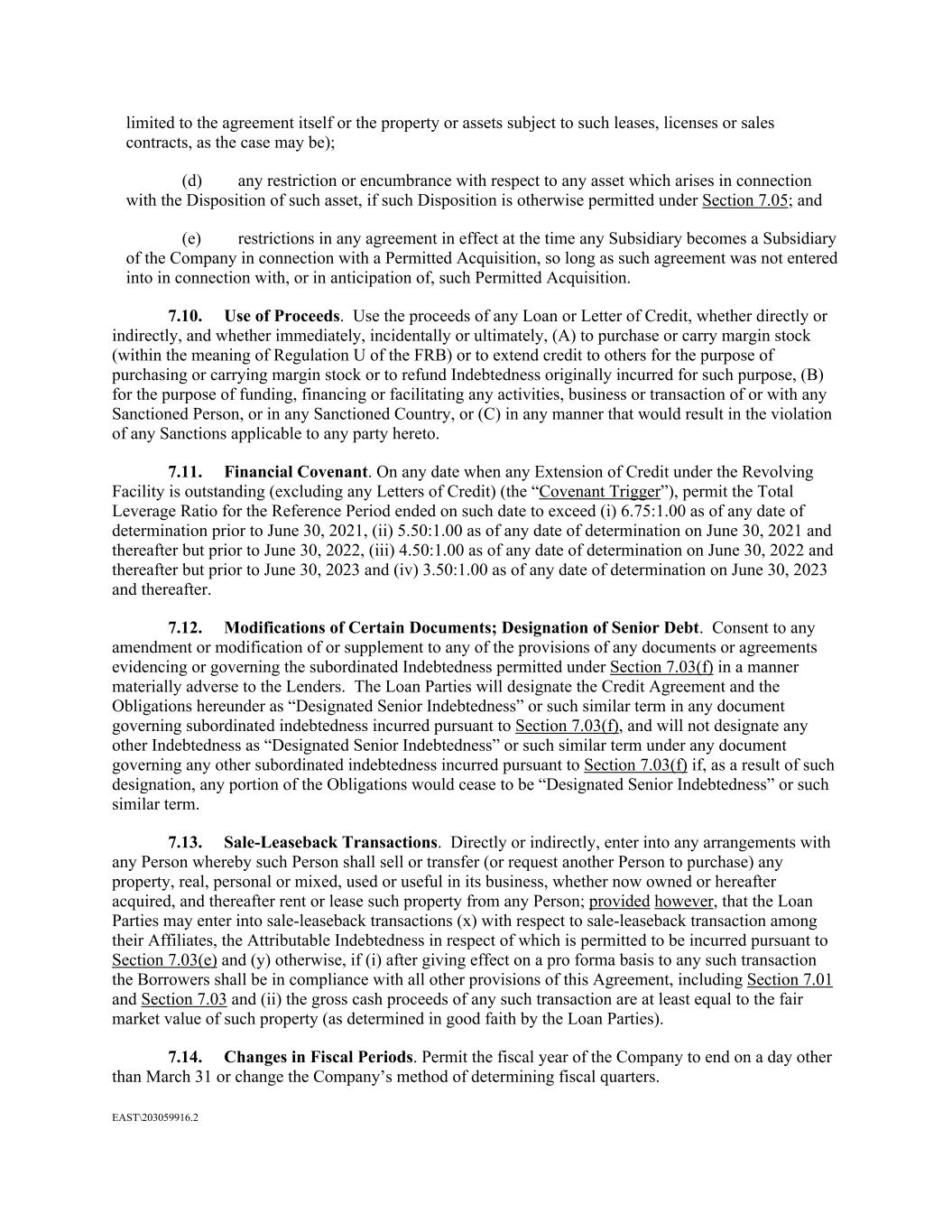 limited to the agreement itself or the property or assets subject to such leases, licenses or sales contracts, as the case may be); (d) any restriction or encumbrance with respect to any asset which arises in connection with the Disposition of such asset, if such Disposition is otherwise permitted under Section 7.05; and (e) restrictions in any agreement in effect at the time any Subsidiary becomes a Subsidiary of the Company in connection with a Permitted Acquisition, so long as such agreement was not entered into in connection with, or in anticipation of, such Permitted Acquisition. 7.10. Use of Proceeds. Use the proceeds of any Loan or Letter of Credit, whether directly or indirectly, and whether immediately, incidentally or ultimately, (A) to purchase or carry margin stock (within the meaning of Regulation U of the FRB) or to extend credit to others for the purpose of purchasing or carrying margin stock or to refund Indebtedness originally incurred for such purpose, (B) for the purpose of funding, financing or facilitating any activities, business or transaction of or with any Sanctioned Person, or in any Sanctioned Country, or (C) in any manner that would result in the violation of any Sanctions applicable to any party hereto. 7.11. Financial Covenant. On any date when any Extension of Credit under the Revolving Facility is outstanding (excluding any Letters of Credit) (the “Covenant Trigger”), permit the Total Leverage Ratio for the Reference Period ended on such date to exceed (i) 6.75:1.00 as of any date of determination prior to June 30, 2021, (ii) 5.50:1.00 as of any date of determination on June 30, 2021 and thereafter but prior to June 30, 2022, (iii) 4.50:1.00 as of any date of determination on June 30, 2022 and thereafter but prior to June 30, 2023 and (iv) 3.50:1.00 as of any date of determination on June 30, 2023 and thereafter. 7.12. Modifications of Certain Documents; Designation of Senior Debt. Consent to any amendment or modification of or supplement to any of the provisions of any documents or agreements evidencing or governing the subordinated Indebtedness permitted under Section 7.03(f) in a manner materially adverse to the Lenders. The Loan Parties will designate the Credit Agreement and the Obligations hereunder as “Designated Senior Indebtedness” or such similar term in any document governing subordinated indebtedness incurred pursuant to Section 7.03(f), and will not designate any other Indebtedness as “Designated Senior Indebtedness” or such similar term under any document governing any other subordinated indebtedness incurred pursuant to Section 7.03(f) if, as a result of such designation, any portion of the Obligations would cease to be “Designated Senior Indebtedness” or such similar term. 7.13. Sale-Leaseback Transactions. Directly or indirectly, enter into any arrangements with any Person whereby such Person shall sell or transfer (or request another Person to purchase) any property, real, personal or mixed, used or useful in its business, whether now owned or hereafter acquired, and thereafter rent or lease such property from any Person; provided however, that the Loan Parties may enter into sale-leaseback transactions (x) with respect to sale-leaseback transaction among their Affiliates, the Attributable Indebtedness in respect of which is permitted to be incurred pursuant to Section 7.03(e) and (y) otherwise, if (i) after giving effect on a pro forma basis to any such transaction the Borrowers shall be in compliance with all other provisions of this Agreement, including Section 7.01 and Section 7.03 and (ii) the gross cash proceeds of any such transaction are at least equal to the fair market value of such property (as determined in good faith by the Loan Parties). 7.14. Changes in Fiscal Periods. Permit the fiscal year of the Company to end on a day other than March 31 or change the Company’s method of determining fiscal quarters. EAST\203059916.2