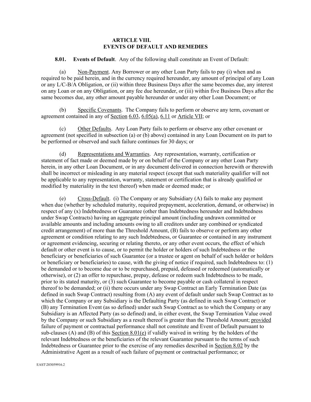 ARTICLE VIII. EVENTS OF DEFAULT AND REMEDIES 8.01. Events of Default. Any of the following shall constitute an Event of Default: (a) Non-Payment. Any Borrower or any other Loan Party fails to pay (i) when and as required to be paid herein, and in the currency required hereunder, any amount of principal of any Loan or any L/C-B/A Obligation, or (ii) within three Business Days after the same becomes due, any interest on any Loan or on any Obligation, or any fee due hereunder, or (iii) within five Business Days after the same becomes due, any other amount payable hereunder or under any other Loan Document; or (b) Specific Covenants. The Company fails to perform or observe any term, covenant or agreement contained in any of Section 6.03, 6.05(a), 6.11 or Article VII; or (c) Other Defaults. Any Loan Party fails to perform or observe any other covenant or agreement (not specified in subsection (a) or (b) above) contained in any Loan Document on its part to be performed or observed and such failure continues for 30 days; or (d) Representations and Warranties. Any representation, warranty, certification or statement of fact made or deemed made by or on behalf of the Company or any other Loan Party herein, in any other Loan Document, or in any document delivered in connection herewith or therewith shall be incorrect or misleading in any material respect (except that such materiality qualifier will not be applicable to any representation, warranty, statement or certification that is already qualified or modified by materiality in the text thereof) when made or deemed made; or (e) Cross-Default. (i) The Company or any Subsidiary (A) fails to make any payment when due (whether by scheduled maturity, required prepayment, acceleration, demand, or otherwise) in respect of any (x) Indebtedness or Guarantee (other than Indebtedness hereunder and Indebtedness under Swap Contracts) having an aggregate principal amount (including undrawn committed or available amounts and including amounts owing to all creditors under any combined or syndicated credit arrangement) of more than the Threshold Amount, (B) fails to observe or perform any other agreement or condition relating to any such Indebtedness, or Guarantee or contained in any instrument or agreement evidencing, securing or relating thereto, or any other event occurs, the effect of which default or other event is to cause, or to permit the holder or holders of such Indebtedness or the beneficiary or beneficiaries of such Guarantee (or a trustee or agent on behalf of such holder or holders or beneficiary or beneficiaries) to cause, with the giving of notice if required, such Indebtedness to: (1) be demanded or to become due or to be repurchased, prepaid, defeased or redeemed (automatically or otherwise), or (2) an offer to repurchase, prepay, defease or redeem such Indebtedness to be made, prior to its stated maturity, or (3) such Guarantee to become payable or cash collateral in respect thereof to be demanded; or (ii) there occurs under any Swap Contract an Early Termination Date (as defined in such Swap Contract) resulting from (A) any event of default under such Swap Contract as to which the Company or any Subsidiary is the Defaulting Party (as defined in such Swap Contract) or (B) any Termination Event (as so defined) under such Swap Contract as to which the Company or any Subsidiary is an Affected Party (as so defined) and, in either event, the Swap Termination Value owed by the Company or such Subsidiary as a result thereof is greater than the Threshold Amount; provided failure of payment or contractual performance shall not constitute and Event of Default pursuant to sub-clauses (A) and (B) of this Section 8.01(e) if validly waived in writing by the holders of the relevant Indebtedness or the beneficiaries of the relevant Guarantee pursuant to the terms of such Indebtedness or Guarantee prior to the exercise of any remedies described in Section 8.02 by the Administrative Agent as a result of such failure of payment or contractual performance; or EAST\203059916.2