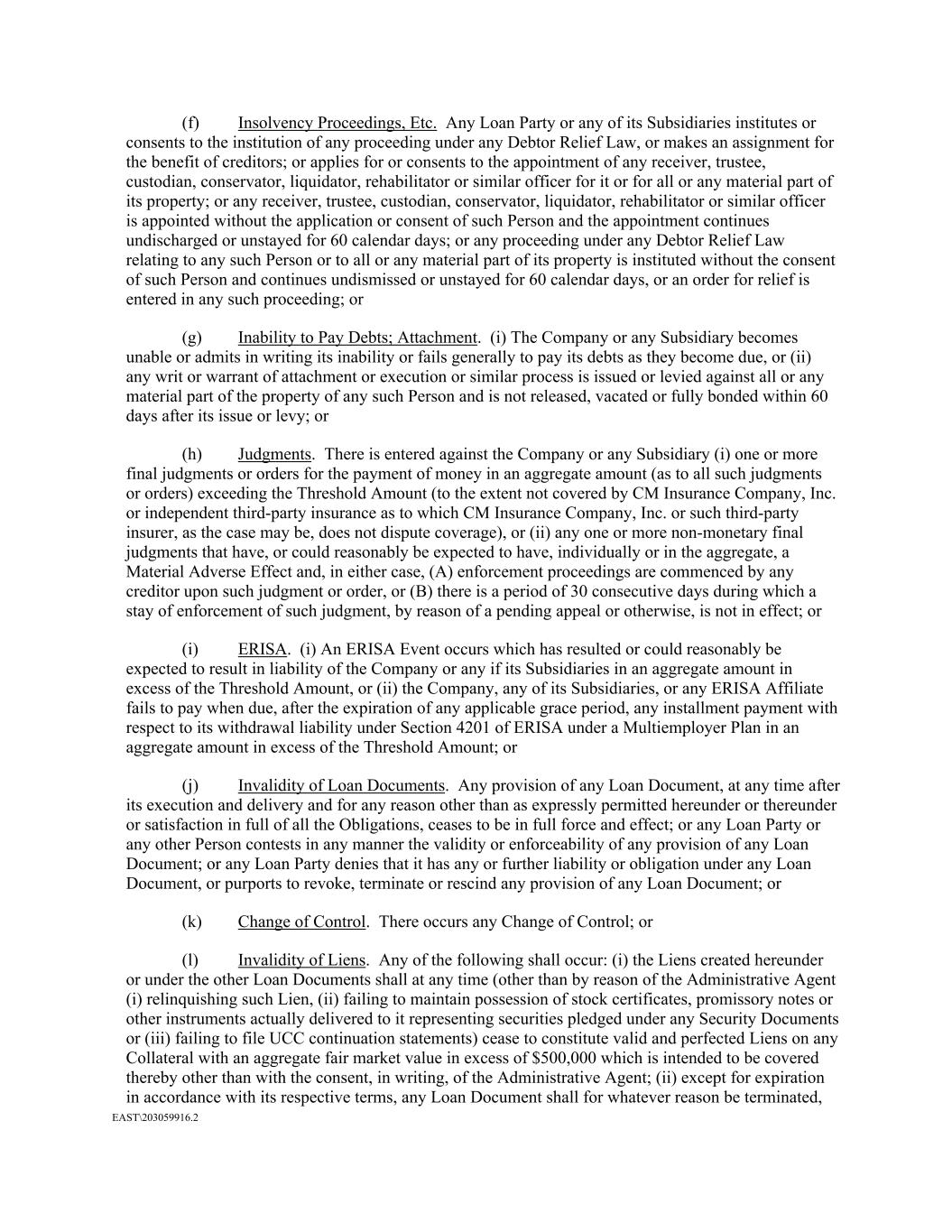 (f) Insolvency Proceedings, Etc. Any Loan Party or any of its Subsidiaries institutes or consents to the institution of any proceeding under any Debtor Relief Law, or makes an assignment for the benefit of creditors; or applies for or consents to the appointment of any receiver, trustee, custodian, conservator, liquidator, rehabilitator or similar officer for it or for all or any material part of its property; or any receiver, trustee, custodian, conservator, liquidator, rehabilitator or similar officer is appointed without the application or consent of such Person and the appointment continues undischarged or unstayed for 60 calendar days; or any proceeding under any Debtor Relief Law relating to any such Person or to all or any material part of its property is instituted without the consent of such Person and continues undismissed or unstayed for 60 calendar days, or an order for relief is entered in any such proceeding; or (g) Inability to Pay Debts; Attachment. (i) The Company or any Subsidiary becomes unable or admits in writing its inability or fails generally to pay its debts as they become due, or (ii) any writ or warrant of attachment or execution or similar process is issued or levied against all or any material part of the property of any such Person and is not released, vacated or fully bonded within 60 days after its issue or levy; or (h) Judgments. There is entered against the Company or any Subsidiary (i) one or more final judgments or orders for the payment of money in an aggregate amount (as to all such judgments or orders) exceeding the Threshold Amount (to the extent not covered by CM Insurance Company, Inc. or independent third-party insurance as to which CM Insurance Company, Inc. or such third-party insurer, as the case may be, does not dispute coverage), or (ii) any one or more non-monetary final judgments that have, or could reasonably be expected to have, individually or in the aggregate, a Material Adverse Effect and, in either case, (A) enforcement proceedings are commenced by any creditor upon such judgment or order, or (B) there is a period of 30 consecutive days during which a stay of enforcement of such judgment, by reason of a pending appeal or otherwise, is not in effect; or (i) ERISA. (i) An ERISA Event occurs which has resulted or could reasonably be expected to result in liability of the Company or any if its Subsidiaries in an aggregate amount in excess of the Threshold Amount, or (ii) the Company, any of its Subsidiaries, or any ERISA Affiliate fails to pay when due, after the expiration of any applicable grace period, any installment payment with respect to its withdrawal liability under Section 4201 of ERISA under a Multiemployer Plan in an aggregate amount in excess of the Threshold Amount; or (j) Invalidity of Loan Documents. Any provision of any Loan Document, at any time after its execution and delivery and for any reason other than as expressly permitted hereunder or thereunder or satisfaction in full of all the Obligations, ceases to be in full force and effect; or any Loan Party or any other Person contests in any manner the validity or enforceability of any provision of any Loan Document; or any Loan Party denies that it has any or further liability or obligation under any Loan Document, or purports to revoke, terminate or rescind any provision of any Loan Document; or (k) Change of Control. There occurs any Change of Control; or (l) Invalidity of Liens. Any of the following shall occur: (i) the Liens created hereunder or under the other Loan Documents shall at any time (other than by reason of the Administrative Agent (i) relinquishing such Lien, (ii) failing to maintain possession of stock certificates, promissory notes or other instruments actually delivered to it representing securities pledged under any Security Documents or (iii) failing to file UCC continuation statements) cease to constitute valid and perfected Liens on any Collateral with an aggregate fair market value in excess of $500,000 which is intended to be covered thereby other than with the consent, in writing, of the Administrative Agent; (ii) except for expiration in accordance with its respective terms, any Loan Document shall for whatever reason be terminated, EAST\203059916.2