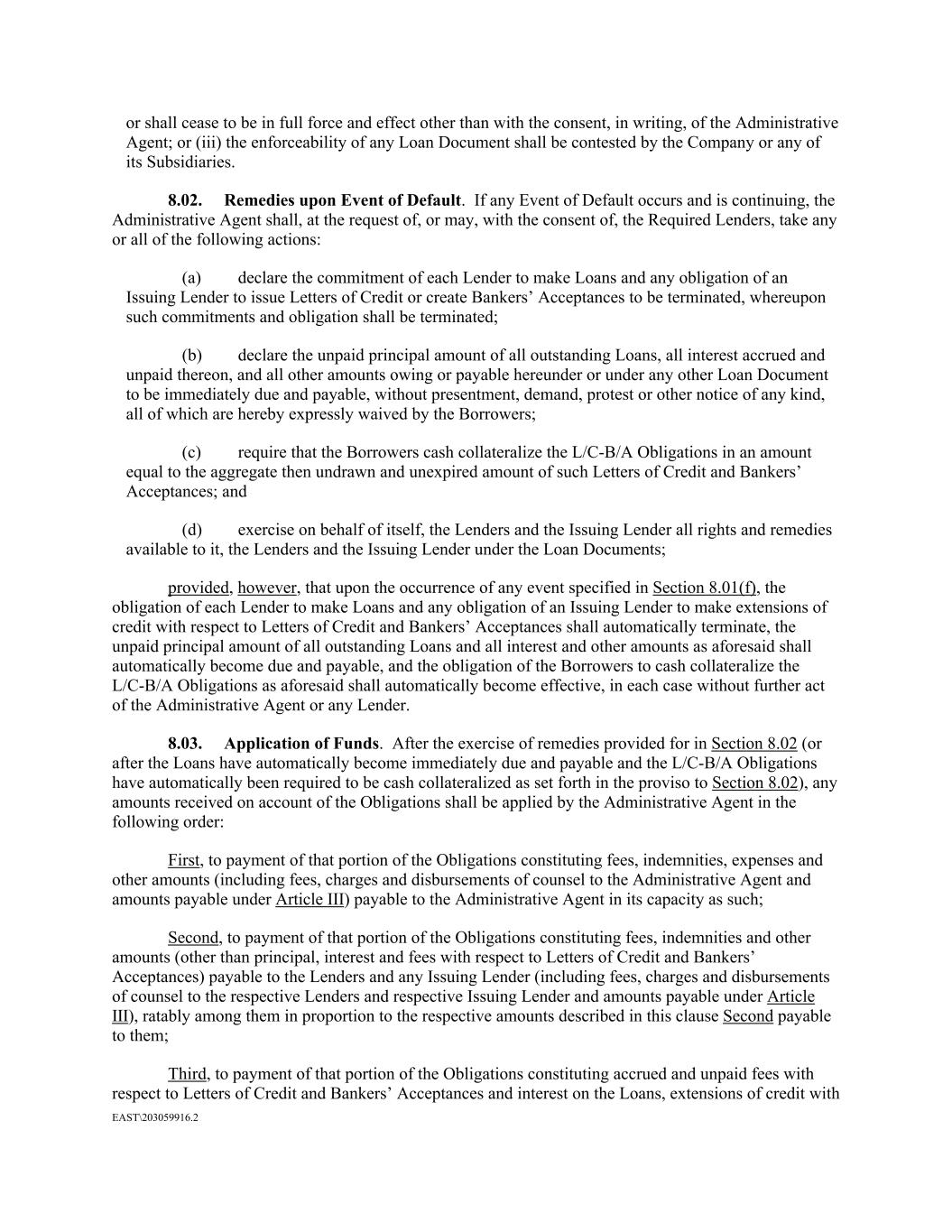 or shall cease to be in full force and effect other than with the consent, in writing, of the Administrative Agent; or (iii) the enforceability of any Loan Document shall be contested by the Company or any of its Subsidiaries. 8.02. Remedies upon Event of Default. If any Event of Default occurs and is continuing, the Administrative Agent shall, at the request of, or may, with the consent of, the Required Lenders, take any or all of the following actions: (a) declare the commitment of each Lender to make Loans and any obligation of an Issuing Lender to issue Letters of Credit or create Bankers’ Acceptances to be terminated, whereupon such commitments and obligation shall be terminated; (b) declare the unpaid principal amount of all outstanding Loans, all interest accrued and unpaid thereon, and all other amounts owing or payable hereunder or under any other Loan Document to be immediately due and payable, without presentment, demand, protest or other notice of any kind, all of which are hereby expressly waived by the Borrowers; (c) require that the Borrowers cash collateralize the L/C-B/A Obligations in an amount equal to the aggregate then undrawn and unexpired amount of such Letters of Credit and Bankers’ Acceptances; and (d) exercise on behalf of itself, the Lenders and the Issuing Lender all rights and remedies available to it, the Lenders and the Issuing Lender under the Loan Documents; provided, however, that upon the occurrence of any event specified in Section 8.01(f), the obligation of each Lender to make Loans and any obligation of an Issuing Lender to make extensions of credit with respect to Letters of Credit and Bankers’ Acceptances shall automatically terminate, the unpaid principal amount of all outstanding Loans and all interest and other amounts as aforesaid shall automatically become due and payable, and the obligation of the Borrowers to cash collateralize the L/C-B/A Obligations as aforesaid shall automatically become effective, in each case without further act of the Administrative Agent or any Lender. 8.03. Application of Funds. After the exercise of remedies provided for in Section 8.02 (or after the Loans have automatically become immediately due and payable and the L/C-B/A Obligations have automatically been required to be cash collateralized as set forth in the proviso to Section 8.02), any amounts received on account of the Obligations shall be applied by the Administrative Agent in the following order: First, to payment of that portion of the Obligations constituting fees, indemnities, expenses and other amounts (including fees, charges and disbursements of counsel to the Administrative Agent and amounts payable under Article III) payable to the Administrative Agent in its capacity as such; Second, to payment of that portion of the Obligations constituting fees, indemnities and other amounts (other than principal, interest and fees with respect to Letters of Credit and Bankers’ Acceptances) payable to the Lenders and any Issuing Lender (including fees, charges and disbursements of counsel to the respective Lenders and respective Issuing Lender and amounts payable under Article III), ratably among them in proportion to the respective amounts described in this clause Second payable to them; Third, to payment of that portion of the Obligations constituting accrued and unpaid fees with respect to Letters of Credit and Bankers’ Acceptances and interest on the Loans, extensions of credit with EAST\203059916.2