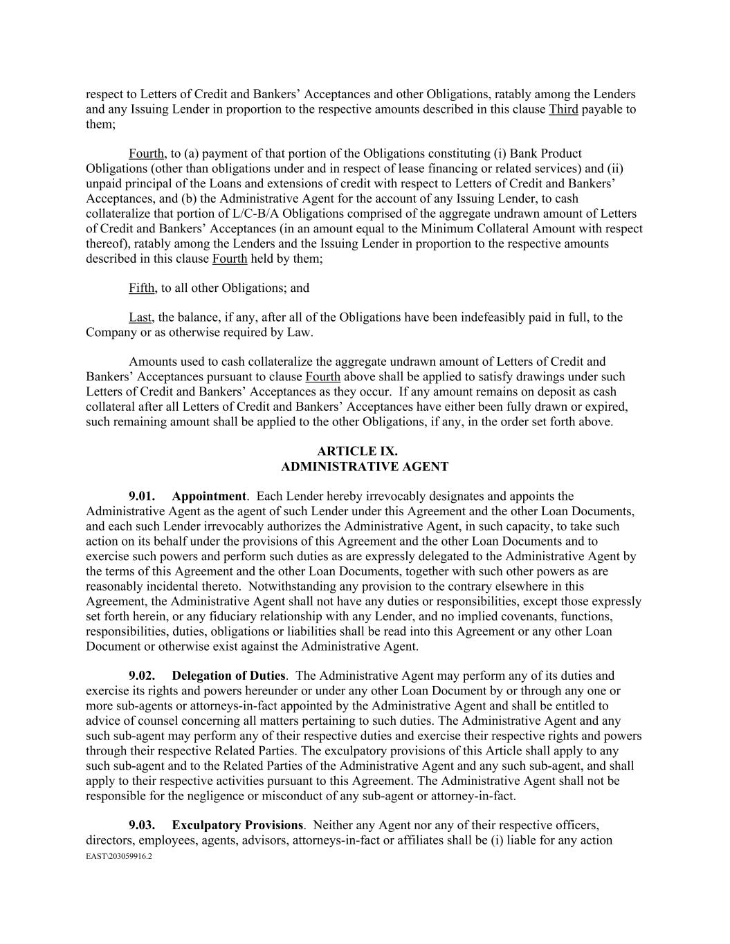 respect to Letters of Credit and Bankers’ Acceptances and other Obligations, ratably among the Lenders and any Issuing Lender in proportion to the respective amounts described in this clause Third payable to them; Fourth, to (a) payment of that portion of the Obligations constituting (i) Bank Product Obligations (other than obligations under and in respect of lease financing or related services) and (ii) unpaid principal of the Loans and extensions of credit with respect to Letters of Credit and Bankers’ Acceptances, and (b) the Administrative Agent for the account of any Issuing Lender, to cash collateralize that portion of L/C-B/A Obligations comprised of the aggregate undrawn amount of Letters of Credit and Bankers’ Acceptances (in an amount equal to the Minimum Collateral Amount with respect thereof), ratably among the Lenders and the Issuing Lender in proportion to the respective amounts described in this clause Fourth held by them; Fifth, to all other Obligations; and Last, the balance, if any, after all of the Obligations have been indefeasibly paid in full, to the Company or as otherwise required by Law. Amounts used to cash collateralize the aggregate undrawn amount of Letters of Credit and Bankers’ Acceptances pursuant to clause Fourth above shall be applied to satisfy drawings under such Letters of Credit and Bankers’ Acceptances as they occur. If any amount remains on deposit as cash collateral after all Letters of Credit and Bankers’ Acceptances have either been fully drawn or expired, such remaining amount shall be applied to the other Obligations, if any, in the order set forth above. ARTICLE IX. ADMINISTRATIVE AGENT 9.01. Appointment. Each Lender hereby irrevocably designates and appoints the Administrative Agent as the agent of such Lender under this Agreement and the other Loan Documents, and each such Lender irrevocably authorizes the Administrative Agent, in such capacity, to take such action on its behalf under the provisions of this Agreement and the other Loan Documents and to exercise such powers and perform such duties as are expressly delegated to the Administrative Agent by the terms of this Agreement and the other Loan Documents, together with such other powers as are reasonably incidental thereto. Notwithstanding any provision to the contrary elsewhere in this Agreement, the Administrative Agent shall not have any duties or responsibilities, except those expressly set forth herein, or any fiduciary relationship with any Lender, and no implied covenants, functions, responsibilities, duties, obligations or liabilities shall be read into this Agreement or any other Loan Document or otherwise exist against the Administrative Agent. 9.02. Delegation of Duties. The Administrative Agent may perform any of its duties and exercise its rights and powers hereunder or under any other Loan Document by or through any one or more sub-agents or attorneys-in-fact appointed by the Administrative Agent and shall be entitled to advice of counsel concerning all matters pertaining to such duties. The Administrative Agent and any such sub-agent may perform any of their respective duties and exercise their respective rights and powers through their respective Related Parties. The exculpatory provisions of this Article shall apply to any such sub-agent and to the Related Parties of the Administrative Agent and any such sub-agent, and shall apply to their respective activities pursuant to this Agreement. The Administrative Agent shall not be responsible for the negligence or misconduct of any sub-agent or attorney-in-fact. 9.03. Exculpatory Provisions. Neither any Agent nor any of their respective officers, directors, employees, agents, advisors, attorneys-in-fact or affiliates shall be (i) liable for any action EAST\203059916.2