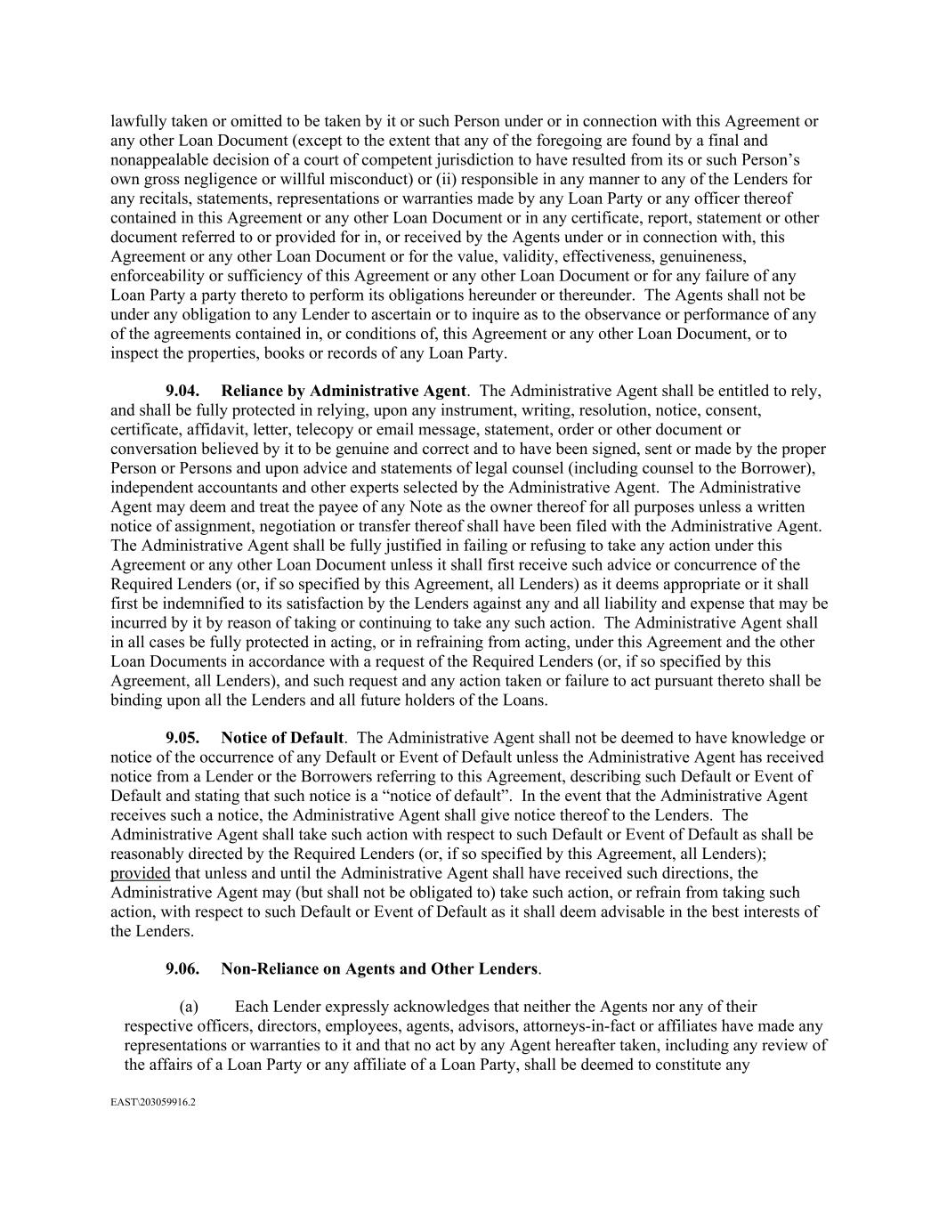 lawfully taken or omitted to be taken by it or such Person under or in connection with this Agreement or any other Loan Document (except to the extent that any of the foregoing are found by a final and nonappealable decision of a court of competent jurisdiction to have resulted from its or such Person’s own gross negligence or willful misconduct) or (ii) responsible in any manner to any of the Lenders for any recitals, statements, representations or warranties made by any Loan Party or any officer thereof contained in this Agreement or any other Loan Document or in any certificate, report, statement or other document referred to or provided for in, or received by the Agents under or in connection with, this Agreement or any other Loan Document or for the value, validity, effectiveness, genuineness, enforceability or sufficiency of this Agreement or any other Loan Document or for any failure of any Loan Party a party thereto to perform its obligations hereunder or thereunder. The Agents shall not be under any obligation to any Lender to ascertain or to inquire as to the observance or performance of any of the agreements contained in, or conditions of, this Agreement or any other Loan Document, or to inspect the properties, books or records of any Loan Party. 9.04. Reliance by Administrative Agent. The Administrative Agent shall be entitled to rely, and shall be fully protected in relying, upon any instrument, writing, resolution, notice, consent, certificate, affidavit, letter, telecopy or email message, statement, order or other document or conversation believed by it to be genuine and correct and to have been signed, sent or made by the proper Person or Persons and upon advice and statements of legal counsel (including counsel to the Borrower), independent accountants and other experts selected by the Administrative Agent. The Administrative Agent may deem and treat the payee of any Note as the owner thereof for all purposes unless a written notice of assignment, negotiation or transfer thereof shall have been filed with the Administrative Agent. The Administrative Agent shall be fully justified in failing or refusing to take any action under this Agreement or any other Loan Document unless it shall first receive such advice or concurrence of the Required Lenders (or, if so specified by this Agreement, all Lenders) as it deems appropriate or it shall first be indemnified to its satisfaction by the Lenders against any and all liability and expense that may be incurred by it by reason of taking or continuing to take any such action. The Administrative Agent shall in all cases be fully protected in acting, or in refraining from acting, under this Agreement and the other Loan Documents in accordance with a request of the Required Lenders (or, if so specified by this Agreement, all Lenders), and such request and any action taken or failure to act pursuant thereto shall be binding upon all the Lenders and all future holders of the Loans. 9.05. Notice of Default. The Administrative Agent shall not be deemed to have knowledge or notice of the occurrence of any Default or Event of Default unless the Administrative Agent has received notice from a Lender or the Borrowers referring to this Agreement, describing such Default or Event of Default and stating that such notice is a “notice of default”. In the event that the Administrative Agent receives such a notice, the Administrative Agent shall give notice thereof to the Lenders. The Administrative Agent shall take such action with respect to such Default or Event of Default as shall be reasonably directed by the Required Lenders (or, if so specified by this Agreement, all Lenders); provided that unless and until the Administrative Agent shall have received such directions, the Administrative Agent may (but shall not be obligated to) take such action, or refrain from taking such action, with respect to such Default or Event of Default as it shall deem advisable in the best interests of the Lenders. 9.06. Non-Reliance on Agents and Other Lenders. (a) Each Lender expressly acknowledges that neither the Agents nor any of their respective officers, directors, employees, agents, advisors, attorneys-in-fact or affiliates have made any representations or warranties to it and that no act by any Agent hereafter taken, including any review of the affairs of a Loan Party or any affiliate of a Loan Party, shall be deemed to constitute any EAST\203059916.2