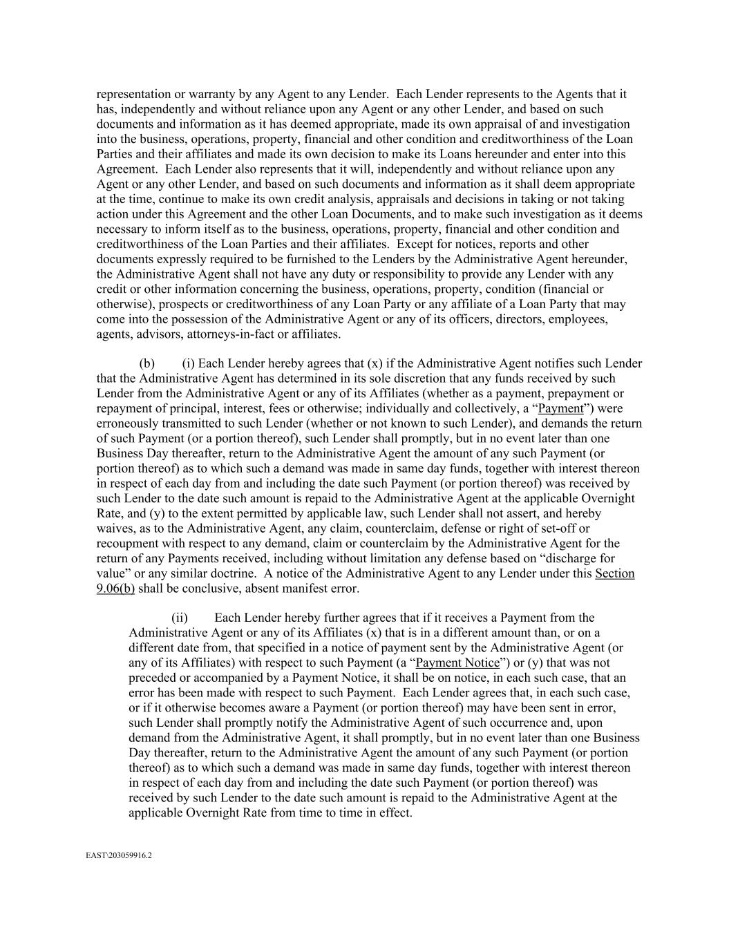 representation or warranty by any Agent to any Lender. Each Lender represents to the Agents that it has, independently and without reliance upon any Agent or any other Lender, and based on such documents and information as it has deemed appropriate, made its own appraisal of and investigation into the business, operations, property, financial and other condition and creditworthiness of the Loan Parties and their affiliates and made its own decision to make its Loans hereunder and enter into this Agreement. Each Lender also represents that it will, independently and without reliance upon any Agent or any other Lender, and based on such documents and information as it shall deem appropriate at the time, continue to make its own credit analysis, appraisals and decisions in taking or not taking action under this Agreement and the other Loan Documents, and to make such investigation as it deems necessary to inform itself as to the business, operations, property, financial and other condition and creditworthiness of the Loan Parties and their affiliates. Except for notices, reports and other documents expressly required to be furnished to the Lenders by the Administrative Agent hereunder, the Administrative Agent shall not have any duty or responsibility to provide any Lender with any credit or other information concerning the business, operations, property, condition (financial or otherwise), prospects or creditworthiness of any Loan Party or any affiliate of a Loan Party that may come into the possession of the Administrative Agent or any of its officers, directors, employees, agents, advisors, attorneys-in-fact or affiliates. (b) (i) Each Lender hereby agrees that (x) if the Administrative Agent notifies such Lender that the Administrative Agent has determined in its sole discretion that any funds received by such Lender from the Administrative Agent or any of its Affiliates (whether as a payment, prepayment or repayment of principal, interest, fees or otherwise; individually and collectively, a “Payment”) were erroneously transmitted to such Lender (whether or not known to such Lender), and demands the return of such Payment (or a portion thereof), such Lender shall promptly, but in no event later than one Business Day thereafter, return to the Administrative Agent the amount of any such Payment (or portion thereof) as to which such a demand was made in same day funds, together with interest thereon in respect of each day from and including the date such Payment (or portion thereof) was received by such Lender to the date such amount is repaid to the Administrative Agent at the applicable Overnight Rate, and (y) to the extent permitted by applicable law, such Lender shall not assert, and hereby waives, as to the Administrative Agent, any claim, counterclaim, defense or right of set-off or recoupment with respect to any demand, claim or counterclaim by the Administrative Agent for the return of any Payments received, including without limitation any defense based on “discharge for value” or any similar doctrine. A notice of the Administrative Agent to any Lender under this Section 9.06(b) shall be conclusive, absent manifest error. (ii) Each Lender hereby further agrees that if it receives a Payment from the Administrative Agent or any of its Affiliates (x) that is in a different amount than, or on a different date from, that specified in a notice of payment sent by the Administrative Agent (or any of its Affiliates) with respect to such Payment (a “Payment Notice”) or (y) that was not preceded or accompanied by a Payment Notice, it shall be on notice, in each such case, that an error has been made with respect to such Payment. Each Lender agrees that, in each such case, or if it otherwise becomes aware a Payment (or portion thereof) may have been sent in error, such Lender shall promptly notify the Administrative Agent of such occurrence and, upon demand from the Administrative Agent, it shall promptly, but in no event later than one Business Day thereafter, return to the Administrative Agent the amount of any such Payment (or portion thereof) as to which such a demand was made in same day funds, together with interest thereon in respect of each day from and including the date such Payment (or portion thereof) was received by such Lender to the date such amount is repaid to the Administrative Agent at the applicable Overnight Rate from time to time in effect. EAST\203059916.2