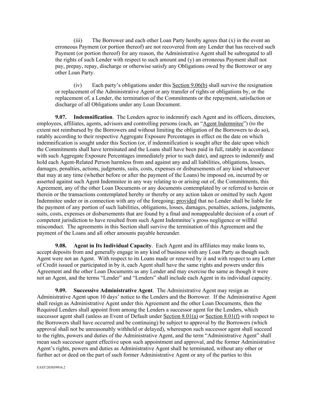 (iii) The Borrower and each other Loan Party hereby agrees that (x) in the event an erroneous Payment (or portion thereof) are not recovered from any Lender that has received such Payment (or portion thereof) for any reason, the Administrative Agent shall be subrogated to all the rights of such Lender with respect to such amount and (y) an erroneous Payment shall not pay, prepay, repay, discharge or otherwise satisfy any Obligations owed by the Borrower or any other Loan Party. (iv) Each party’s obligations under this Section 9.06(b) shall survive the resignation or replacement of the Administrative Agent or any transfer of rights or obligations by, or the replacement of, a Lender, the termination of the Commitments or the repayment, satisfaction or discharge of all Obligations under any Loan Document. 9.07. Indemnification. The Lenders agree to indemnify each Agent and its officers, directors, employees, affiliates, agents, advisors and controlling persons (each, an “Agent Indemnitee”) (to the extent not reimbursed by the Borrowers and without limiting the obligation of the Borrowers to do so), ratably according to their respective Aggregate Exposure Percentages in effect on the date on which indemnification is sought under this Section (or, if indemnification is sought after the date upon which the Commitments shall have terminated and the Loans shall have been paid in full, ratably in accordance with such Aggregate Exposure Percentages immediately prior to such date), and agrees to indemnify and hold each Agent-Related Person harmless from and against any and all liabilities, obligations, losses, damages, penalties, actions, judgments, suits, costs, expenses or disbursements of any kind whatsoever that may at any time (whether before or after the payment of the Loans) be imposed on, incurred by or asserted against such Agent Indemnitee in any way relating to or arising out of, the Commitments, this Agreement, any of the other Loan Documents or any documents contemplated by or referred to herein or therein or the transactions contemplated hereby or thereby or any action taken or omitted by such Agent Indemnitee under or in connection with any of the foregoing; provided that no Lender shall be liable for the payment of any portion of such liabilities, obligations, losses, damages, penalties, actions, judgments, suits, costs, expenses or disbursements that are found by a final and nonappealable decision of a court of competent jurisdiction to have resulted from such Agent Indemnitee’s gross negligence or willful misconduct. The agreements in this Section shall survive the termination of this Agreement and the payment of the Loans and all other amounts payable hereunder. 9.08. Agent in Its Individual Capacity. Each Agent and its affiliates may make loans to, accept deposits from and generally engage in any kind of business with any Loan Party as though such Agent were not an Agent. With respect to its Loans made or renewed by it and with respect to any Letter of Credit issued or participated in by it, each Agent shall have the same rights and powers under this Agreement and the other Loan Documents as any Lender and may exercise the same as though it were not an Agent, and the terms “Lender” and “Lenders” shall include each Agent in its individual capacity. 9.09. Successive Administrative Agent. The Administrative Agent may resign as Administrative Agent upon 10 days’ notice to the Lenders and the Borrower. If the Administrative Agent shall resign as Administrative Agent under this Agreement and the other Loan Documents, then the Required Lenders shall appoint from among the Lenders a successor agent for the Lenders, which successor agent shall (unless an Event of Default under Section 8.01(a) or Section 8.01(f) with respect to the Borrowers shall have occurred and be continuing) be subject to approval by the Borrowers (which approval shall not be unreasonably withheld or delayed), whereupon such successor agent shall succeed to the rights, powers and duties of the Administrative Agent, and the term “Administrative Agent” shall mean such successor agent effective upon such appointment and approval, and the former Administrative Agent’s rights, powers and duties as Administrative Agent shall be terminated, without any other or further act or deed on the part of such former Administrative Agent or any of the parties to this EAST\203059916.2