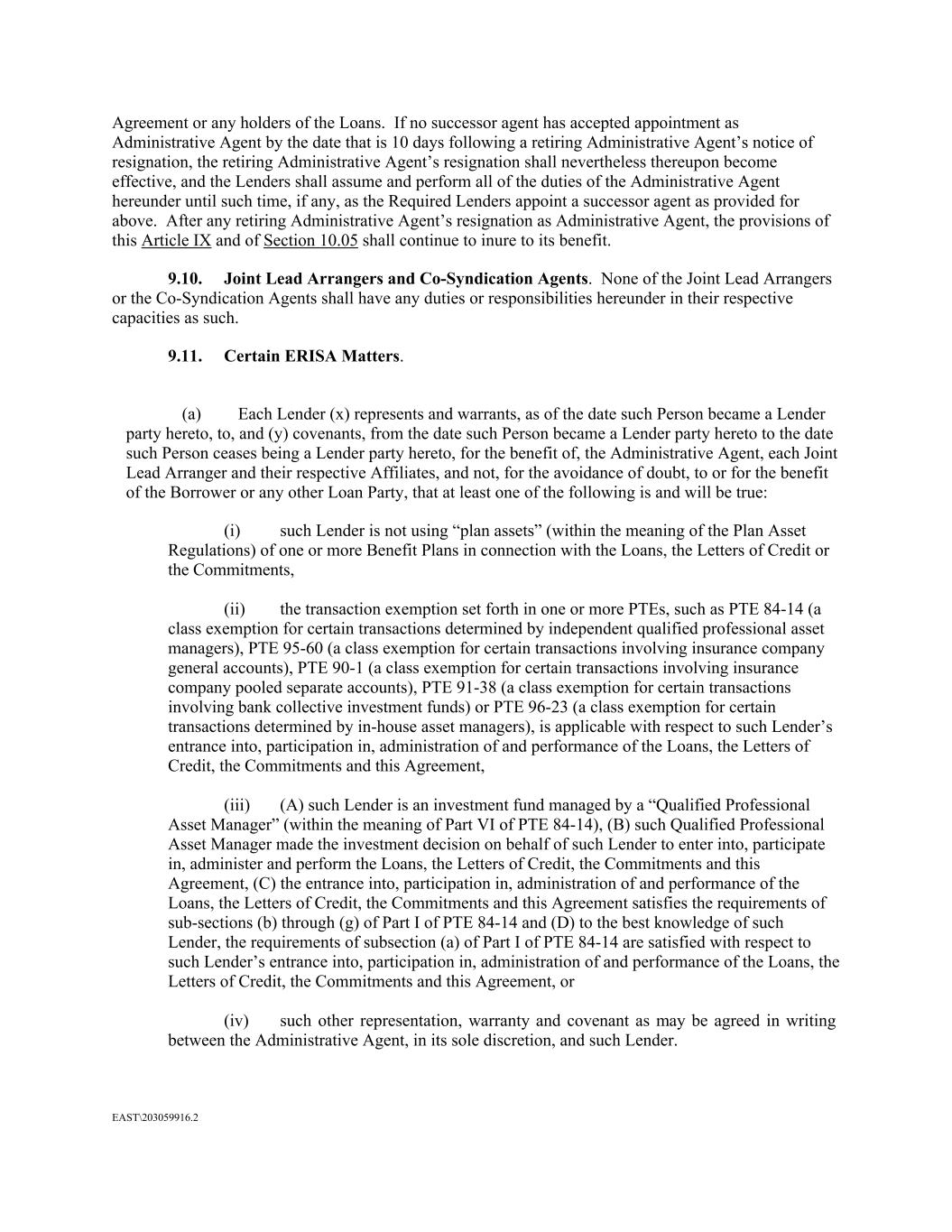 Agreement or any holders of the Loans. If no successor agent has accepted appointment as Administrative Agent by the date that is 10 days following a retiring Administrative Agent’s notice of resignation, the retiring Administrative Agent’s resignation shall nevertheless thereupon become effective, and the Lenders shall assume and perform all of the duties of the Administrative Agent hereunder until such time, if any, as the Required Lenders appoint a successor agent as provided for above. After any retiring Administrative Agent’s resignation as Administrative Agent, the provisions of this Article IX and of Section 10.05 shall continue to inure to its benefit. 9.10. Joint Lead Arrangers and Co-Syndication Agents. None of the Joint Lead Arrangers or the Co-Syndication Agents shall have any duties or responsibilities hereunder in their respective capacities as such. 9.11. Certain ERISA Matters. (a) Each Lender (x) represents and warrants, as of the date such Person became a Lender party hereto, to, and (y) covenants, from the date such Person became a Lender party hereto to the date such Person ceases being a Lender party hereto, for the benefit of, the Administrative Agent, each Joint Lead Arranger and their respective Affiliates, and not, for the avoidance of doubt, to or for the benefit of the Borrower or any other Loan Party, that at least one of the following is and will be true: (i) such Lender is not using “plan assets” (within the meaning of the Plan Asset Regulations) of one or more Benefit Plans in connection with the Loans, the Letters of Credit or the Commitments, (ii) the transaction exemption set forth in one or more PTEs, such as PTE 84-14 (a class exemption for certain transactions determined by independent qualified professional asset managers), PTE 95-60 (a class exemption for certain transactions involving insurance company general accounts), PTE 90-1 (a class exemption for certain transactions involving insurance company pooled separate accounts), PTE 91-38 (a class exemption for certain transactions involving bank collective investment funds) or PTE 96-23 (a class exemption for certain transactions determined by in-house asset managers), is applicable with respect to such Lender’s entrance into, participation in, administration of and performance of the Loans, the Letters of Credit, the Commitments and this Agreement, (iii) (A) such Lender is an investment fund managed by a “Qualified Professional Asset Manager” (within the meaning of Part VI of PTE 84-14), (B) such Qualified Professional Asset Manager made the investment decision on behalf of such Lender to enter into, participate in, administer and perform the Loans, the Letters of Credit, the Commitments and this Agreement, (C) the entrance into, participation in, administration of and performance of the Loans, the Letters of Credit, the Commitments and this Agreement satisfies the requirements of sub-sections (b) through (g) of Part I of PTE 84-14 and (D) to the best knowledge of such Lender, the requirements of subsection (a) of Part I of PTE 84-14 are satisfied with respect to such Lender’s entrance into, participation in, administration of and performance of the Loans, the Letters of Credit, the Commitments and this Agreement, or (iv) such other representation, warranty and covenant as may be agreed in writing between the Administrative Agent, in its sole discretion, and such Lender. EAST\203059916.2