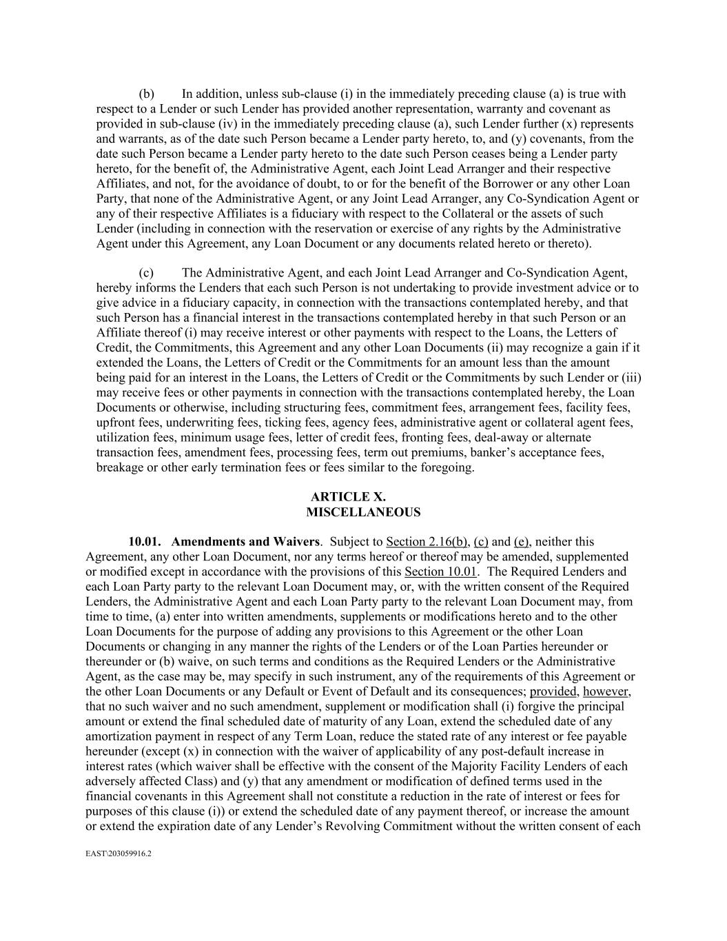 (b) In addition, unless sub-clause (i) in the immediately preceding clause (a) is true with respect to a Lender or such Lender has provided another representation, warranty and covenant as provided in sub-clause (iv) in the immediately preceding clause (a), such Lender further (x) represents and warrants, as of the date such Person became a Lender party hereto, to, and (y) covenants, from the date such Person became a Lender party hereto to the date such Person ceases being a Lender party hereto, for the benefit of, the Administrative Agent, each Joint Lead Arranger and their respective Affiliates, and not, for the avoidance of doubt, to or for the benefit of the Borrower or any other Loan Party, that none of the Administrative Agent, or any Joint Lead Arranger, any Co-Syndication Agent or any of their respective Affiliates is a fiduciary with respect to the Collateral or the assets of such Lender (including in connection with the reservation or exercise of any rights by the Administrative Agent under this Agreement, any Loan Document or any documents related hereto or thereto). (c) The Administrative Agent, and each Joint Lead Arranger and Co-Syndication Agent, hereby informs the Lenders that each such Person is not undertaking to provide investment advice or to give advice in a fiduciary capacity, in connection with the transactions contemplated hereby, and that such Person has a financial interest in the transactions contemplated hereby in that such Person or an Affiliate thereof (i) may receive interest or other payments with respect to the Loans, the Letters of Credit, the Commitments, this Agreement and any other Loan Documents (ii) may recognize a gain if it extended the Loans, the Letters of Credit or the Commitments for an amount less than the amount being paid for an interest in the Loans, the Letters of Credit or the Commitments by such Lender or (iii) may receive fees or other payments in connection with the transactions contemplated hereby, the Loan Documents or otherwise, including structuring fees, commitment fees, arrangement fees, facility fees, upfront fees, underwriting fees, ticking fees, agency fees, administrative agent or collateral agent fees, utilization fees, minimum usage fees, letter of credit fees, fronting fees, deal-away or alternate transaction fees, amendment fees, processing fees, term out premiums, banker’s acceptance fees, breakage or other early termination fees or fees similar to the foregoing. ARTICLE X. MISCELLANEOUS 10.01. Amendments and Waivers. Subject to Section 2.16(b), (c) and (e), neither this Agreement, any other Loan Document, nor any terms hereof or thereof may be amended, supplemented or modified except in accordance with the provisions of this Section 10.01. The Required Lenders and each Loan Party party to the relevant Loan Document may, or, with the written consent of the Required Lenders, the Administrative Agent and each Loan Party party to the relevant Loan Document may, from time to time, (a) enter into written amendments, supplements or modifications hereto and to the other Loan Documents for the purpose of adding any provisions to this Agreement or the other Loan Documents or changing in any manner the rights of the Lenders or of the Loan Parties hereunder or thereunder or (b) waive, on such terms and conditions as the Required Lenders or the Administrative Agent, as the case may be, may specify in such instrument, any of the requirements of this Agreement or the other Loan Documents or any Default or Event of Default and its consequences; provided, however, that no such waiver and no such amendment, supplement or modification shall (i) forgive the principal amount or extend the final scheduled date of maturity of any Loan, extend the scheduled date of any amortization payment in respect of any Term Loan, reduce the stated rate of any interest or fee payable hereunder (except (x) in connection with the waiver of applicability of any post-default increase in interest rates (which waiver shall be effective with the consent of the Majority Facility Lenders of each adversely affected Class) and (y) that any amendment or modification of defined terms used in the financial covenants in this Agreement shall not constitute a reduction in the rate of interest or fees for purposes of this clause (i)) or extend the scheduled date of any payment thereof, or increase the amount or extend the expiration date of any Lender’s Revolving Commitment without the written consent of each EAST\203059916.2