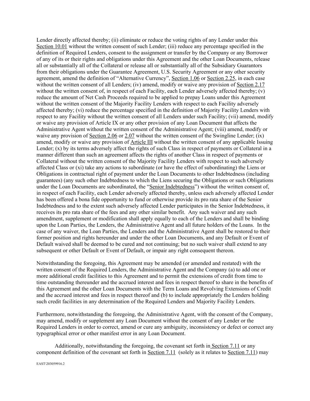 Lender directly affected thereby; (ii) eliminate or reduce the voting rights of any Lender under this Section 10.01 without the written consent of such Lender; (iii) reduce any percentage specified in the definition of Required Lenders, consent to the assignment or transfer by the Company or any Borrower of any of its or their rights and obligations under this Agreement and the other Loan Documents, release all or substantially all of the Collateral or release all or substantially all of the Subsidiary Guarantors from their obligations under the Guarantee Agreement, U.S. Security Agreement or any other security agreement, amend the definition of “Alternative Currency”, Section 1.06 or Section 2.25, in each case without the written consent of all Lenders; (iv) amend, modify or waive any provision of Section 2.17 without the written consent of, in respect of each Facility, each Lender adversely affected thereby; (v) reduce the amount of Net Cash Proceeds required to be applied to prepay Loans under this Agreement without the written consent of the Majority Facility Lenders with respect to each Facility adversely affected thereby; (vi) reduce the percentage specified in the definition of Majority Facility Lenders with respect to any Facility without the written consent of all Lenders under such Facility; (vii) amend, modify or waive any provision of Article IX or any other provision of any Loan Document that affects the Administrative Agent without the written consent of the Administrative Agent; (viii) amend, modify or waive any provision of Section 2.06 or 2.07 without the written consent of the Swingline Lender; (ix) amend, modify or waive any provision of Article III without the written consent of any applicable Issuing Lender; (x) by its terms adversely affect the rights of such Class in respect of payments or Collateral in a manner different than such an agreement affects the rights of another Class in respect of payments or Collateral without the written consent of the Majority Facility Lenders with respect to such adversely affected Class or (xi) take any actions to subordinate (or have the effect of subordinating) the Liens or Obligations in contractual right of payment under the Loan Documents to other Indebtedness (including guarantees) (any such other Indebtedness to which the Liens securing the Obligations or such Obligations under the Loan Documents are subordinated, the “Senior Indebtedness”) without the written consent of, in respect of each Facility, each Lender adversely affected thereby, unless each adversely affected Lender has been offered a bona fide opportunity to fund or otherwise provide its pro rata share of the Senior Indebtedness and to the extent such adversely affected Lender participates in the Senior Indebtedness, it receives its pro rata share of the fees and any other similar benefit. Any such waiver and any such amendment, supplement or modification shall apply equally to each of the Lenders and shall be binding upon the Loan Parties, the Lenders, the Administrative Agent and all future holders of the Loans. In the case of any waiver, the Loan Parties, the Lenders and the Administrative Agent shall be restored to their former position and rights hereunder and under the other Loan Documents, and any Default or Event of Default waived shall be deemed to be cured and not continuing; but no such waiver shall extend to any subsequent or other Default or Event of Default, or impair any right consequent thereon. Notwithstanding the foregoing, this Agreement may be amended (or amended and restated) with the written consent of the Required Lenders, the Administrative Agent and the Company (a) to add one or more additional credit facilities to this Agreement and to permit the extensions of credit from time to time outstanding thereunder and the accrued interest and fees in respect thereof to share in the benefits of this Agreement and the other Loan Documents with the Term Loans and Revolving Extensions of Credit and the accrued interest and fees in respect thereof and (b) to include appropriately the Lenders holding such credit facilities in any determination of the Required Lenders and Majority Facility Lenders. Furthermore, notwithstanding the foregoing, the Administrative Agent, with the consent of the Company, may amend, modify or supplement any Loan Document without the consent of any Lender or the Required Lenders in order to correct, amend or cure any ambiguity, inconsistency or defect or correct any typographical error or other manifest error in any Loan Document. Additionally, notwithstanding the foregoing, the covenant set forth in Section 7.11 or any component definition of the covenant set forth in Section 7.11 (solely as it relates to Section 7.11) may EAST\203059916.2