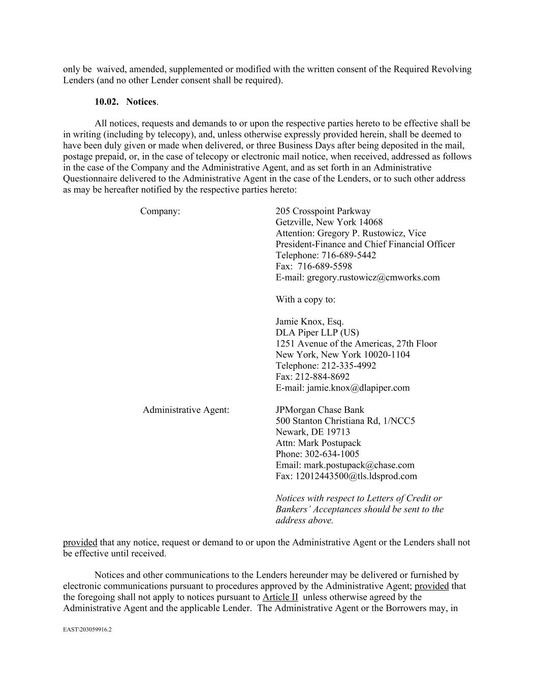 EAST\203059916.2 Telephone: 716-689-5442 Fax: 716-689-5598 E-mail: gregory.rustowicz@cmworks.com With a copy to: Jamie Knox, Esq. DLA Piper LLP (US) 1251 Avenue of the Americas, 27th Floor New York, New York 10020-1104 Telephone: 212-335-4992 Fax: 212-884-8692 E-mail: jamie.knox@dlapiper.com only be waived, amended, supplemented or modified with the written consent of the Required Revolving Lenders (and no other Lender consent shall be required). 10.02. Notices. All notices, requests and demands to or upon the respective parties hereto to be effective shall be in writing (including by telecopy), and, unless otherwise expressly provided herein, shall be deemed to have been duly given or made when delivered, or three Business Days after being deposited in the mail, postage prepaid, or, in the case of telecopy or electronic mail notice, when received, addressed as follows in the case of the Company and the Administrative Agent, and as set forth in an Administrative Questionnaire delivered to the Administrative Agent in the case of the Lenders, or to such other address as may be hereafter notified by the respective parties hereto: Administrative Agent: Attention: Gregory P. Rustowicz, Vice President-Finance and Chief Financial Officer JPMorgan Chase Bank 500 Stanton Christiana Rd, 1/NCC5 Newark, DE 19713 Attn: Mark Postupack Phone: 302-634-1005 Email: mark.postupack@chase.com Fax: 12012443500@tls.ldsprod.com Company: Notices with respect to Letters of Credit or Bankers’ Acceptances should be sent to the address above. provided that any notice, request or demand to or upon the Administrative Agent or the Lenders shall not be effective until received. Notices and other communications to the Lenders hereunder may be delivered or furnished by electronic communications pursuant to procedures approved by the Administrative Agent; provided that the foregoing shall not apply to notices pursuant to Article II unless otherwise agreed by the Administrative Agent and the applicable Lender. The Administrative Agent or the Borrowers may, in 205 Crosspoint Parkway Getzville, New York 14068