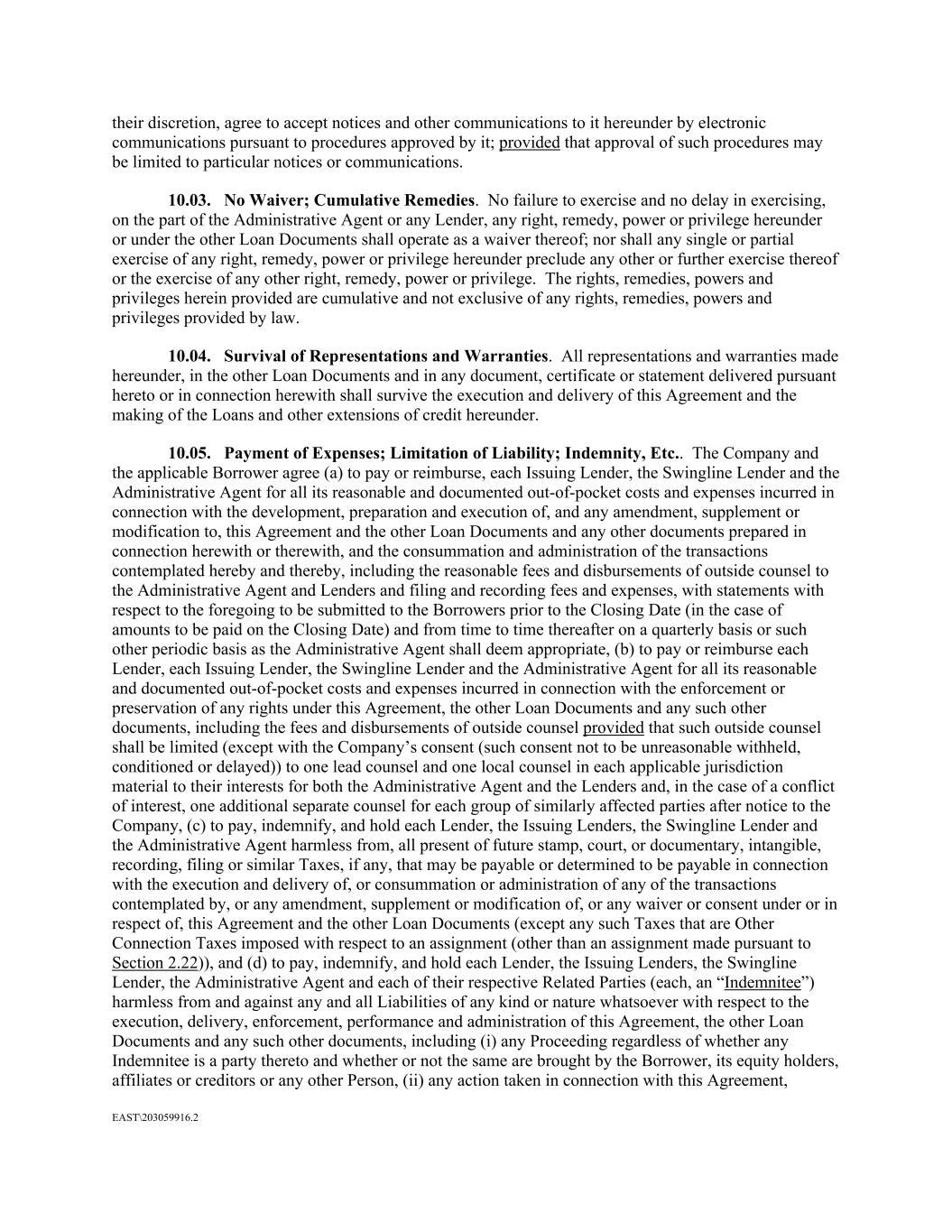 their discretion, agree to accept notices and other communications to it hereunder by electronic communications pursuant to procedures approved by it; provided that approval of such procedures may be limited to particular notices or communications. 10.03. No Waiver; Cumulative Remedies. No failure to exercise and no delay in exercising, on the part of the Administrative Agent or any Lender, any right, remedy, power or privilege hereunder or under the other Loan Documents shall operate as a waiver thereof; nor shall any single or partial exercise of any right, remedy, power or privilege hereunder preclude any other or further exercise thereof or the exercise of any other right, remedy, power or privilege. The rights, remedies, powers and privileges herein provided are cumulative and not exclusive of any rights, remedies, powers and privileges provided by law. 10.04. Survival of Representations and Warranties. All representations and warranties made hereunder, in the other Loan Documents and in any document, certificate or statement delivered pursuant hereto or in connection herewith shall survive the execution and delivery of this Agreement and the making of the Loans and other extensions of credit hereunder. 10.05. Payment of Expenses; Limitation of Liability; Indemnity, Etc.. The Company and the applicable Borrower agree (a) to pay or reimburse, each Issuing Lender, the Swingline Lender and the Administrative Agent for all its reasonable and documented out-of-pocket costs and expenses incurred in connection with the development, preparation and execution of, and any amendment, supplement or modification to, this Agreement and the other Loan Documents and any other documents prepared in connection herewith or therewith, and the consummation and administration of the transactions contemplated hereby and thereby, including the reasonable fees and disbursements of outside counsel to the Administrative Agent and Lenders and filing and recording fees and expenses, with statements with respect to the foregoing to be submitted to the Borrowers prior to the Closing Date (in the case of amounts to be paid on the Closing Date) and from time to time thereafter on a quarterly basis or such other periodic basis as the Administrative Agent shall deem appropriate, (b) to pay or reimburse each Lender, each Issuing Lender, the Swingline Lender and the Administrative Agent for all its reasonable and documented out-of-pocket costs and expenses incurred in connection with the enforcement or preservation of any rights under this Agreement, the other Loan Documents and any such other documents, including the fees and disbursements of outside counsel provided that such outside counsel shall be limited (except with the Company’s consent (such consent not to be unreasonable withheld, conditioned or delayed)) to one lead counsel and one local counsel in each applicable jurisdiction material to their interests for both the Administrative Agent and the Lenders and, in the case of a conflict of interest, one additional separate counsel for each group of similarly affected parties after notice to the Company, (c) to pay, indemnify, and hold each Lender, the Issuing Lenders, the Swingline Lender and the Administrative Agent harmless from, all present of future stamp, court, or documentary, intangible, recording, filing or similar Taxes, if any, that may be payable or determined to be payable in connection with the execution and delivery of, or consummation or administration of any of the transactions contemplated by, or any amendment, supplement or modification of, or any waiver or consent under or in respect of, this Agreement and the other Loan Documents (except any such Taxes that are Other Connection Taxes imposed with respect to an assignment (other than an assignment made pursuant to Section 2.22)), and (d) to pay, indemnify, and hold each Lender, the Issuing Lenders, the Swingline Lender, the Administrative Agent and each of their respective Related Parties (each, an “Indemnitee”) harmless from and against any and all Liabilities of any kind or nature whatsoever with respect to the execution, delivery, enforcement, performance and administration of this Agreement, the other Loan Documents and any such other documents, including (i) any Proceeding regardless of whether any Indemnitee is a party thereto and whether or not the same are brought by the Borrower, its equity holders, affiliates or creditors or any other Person, (ii) any action taken in connection with this Agreement, EAST\203059916.2