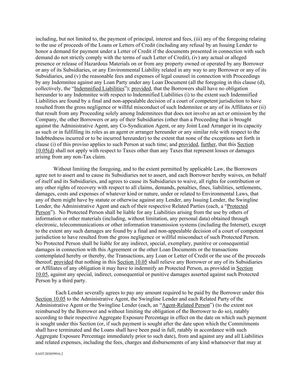 including, but not limited to, the payment of principal, interest and fees, (iii) any of the foregoing relating to the use of proceeds of the Loans or Letters of Credit (including any refusal by an Issuing Lender to honor a demand for payment under a Letter of Credit if the documents presented in connection with such demand do not strictly comply with the terms of such Letter of Credit), (iv) any actual or alleged presence or release of Hazardous Materials on or from any property owned or operated by any Borrower or any of its Subsidiaries, or any Environmental Liability related in any way to any Borrower or any of its Subsidiaries, and (v) the reasonable fees and expenses of legal counsel in connection with Proceedings by any Indemnitee against any Loan Party under any Loan Document (all the foregoing in this clause (d), collectively, the “Indemnified Liabilities”); provided, that the Borrowers shall have no obligation hereunder to any Indemnitee with respect to Indemnified Liabilities (i) to the extent such Indemnified Liabilities are found by a final and non-appealable decision of a court of competent jurisdiction to have resulted from the gross negligence or willful misconduct of such Indemnitee or any of its Affiliates or (ii) that result from any Proceeding solely among Indemnitees that does not involve an act or omission by the Company, the other Borrowers or any of their Subsidiaries (other than a Proceeding that is brought against the Administrative Agent, any Co-Syndication Agent, or any Joint Lead Arranger in its capacity as such or in fulfilling its roles as an agent or arranger hereunder or any similar role with respect to the Indebtedness incurred or to be incurred hereunder) to the extent that none of the exceptions set forth in clause (i) of this proviso applies to such Person at such time; and provided, further, that this Section 10.05(d) shall not apply with respect to Taxes other than any Taxes that represent losses or damages arising from any non-Tax claim. Without limiting the foregoing, and to the extent permitted by applicable Law, the Borrowers agree not to assert and to cause its Subsidiaries not to assert, and each Borrower hereby waives, on behalf of itself and its Subsidiaries, and agrees to cause its Subsidiaries to waive, all rights for contribution or any other rights of recovery with respect to all claims, demands, penalties, fines, liabilities, settlements, damages, costs and expenses of whatever kind or nature, under or related to Environmental Laws, that any of them might have by statute or otherwise against any Lender, any Issuing Lender, the Swingline Lender, the Administrative Agent and each of their respective Related Parties (each, a “Protected Person”). No Protected Person shall be liable for any Liabilities arising from the use by others of information or other materials (including, without limitation, any personal data) obtained through electronic, telecommunications or other information transmission systems (including the Internet), except to the extent any such damages are found by a final and non-appealable decision of a court of competent jurisdiction to have resulted from the gross negligence or willful misconduct of such Protected Person. No Protected Person shall be liable for any indirect, special, exemplary, punitive or consequential damages in connection with this Agreement or the other Loan Documents or the transactions contemplated hereby or thereby, the Transactions, any Loan or Letter of Credit or the use of the proceeds thereof; provided that nothing in this Section 10.05 shall relieve any Borrower or any of its Subsidiaries or Affiliates of any obligation it may have to indemnify an Protected Person, as provided in Section 10.05, against any special, indirect, consequential or punitive damages asserted against such Protected Person by a third party. Each Lender severally agrees to pay any amount required to be paid by the Borrower under this Section 10.05 to the Administrative Agent, the Swingline Lender and each Related Party of the Administrative Agent or the Swingline Lender (each, an “Agent-Related Person”) (to the extent not reimbursed by the Borrower and without limiting the obligation of the Borrower to do so), ratably according to their respective Aggregate Exposure Percentage in effect on the date on which such payment is sought under this Section (or, if such payment is sought after the date upon which the Commitments shall have terminated and the Loans shall have been paid in full, ratably in accordance with such Aggregate Exposure Percentage immediately prior to such date), from and against any and all Liabilities and related expenses, including the fees, charges and disbursements of any kind whatsoever that may at EAST\203059916.2