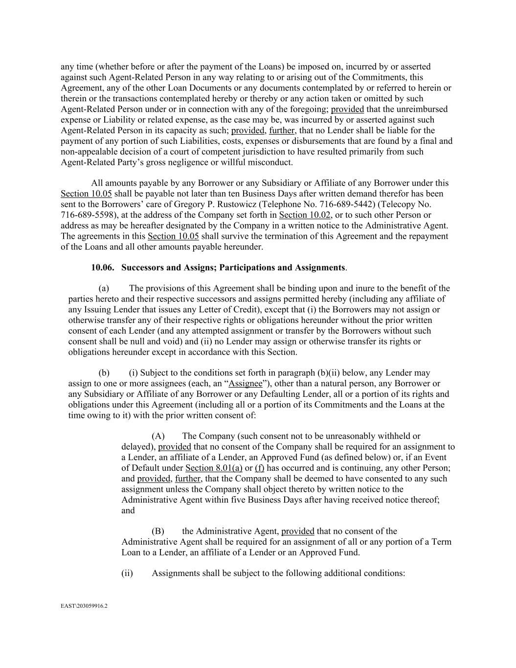 any time (whether before or after the payment of the Loans) be imposed on, incurred by or asserted against such Agent-Related Person in any way relating to or arising out of the Commitments, this Agreement, any of the other Loan Documents or any documents contemplated by or referred to herein or therein or the transactions contemplated hereby or thereby or any action taken or omitted by such Agent-Related Person under or in connection with any of the foregoing; provided that the unreimbursed expense or Liability or related expense, as the case may be, was incurred by or asserted against such Agent-Related Person in its capacity as such; provided, further, that no Lender shall be liable for the payment of any portion of such Liabilities, costs, expenses or disbursements that are found by a final and non-appealable decision of a court of competent jurisdiction to have resulted primarily from such Agent-Related Party’s gross negligence or willful misconduct. All amounts payable by any Borrower or any Subsidiary or Affiliate of any Borrower under this Section 10.05 shall be payable not later than ten Business Days after written demand therefor has been sent to the Borrowers’ care of Gregory P. Rustowicz (Telephone No. 716-689-5442) (Telecopy No. 716-689-5598), at the address of the Company set forth in Section 10.02, or to such other Person or address as may be hereafter designated by the Company in a written notice to the Administrative Agent. The agreements in this Section 10.05 shall survive the termination of this Agreement and the repayment of the Loans and all other amounts payable hereunder. 10.06. Successors and Assigns; Participations and Assignments. (a) The provisions of this Agreement shall be binding upon and inure to the benefit of the parties hereto and their respective successors and assigns permitted hereby (including any affiliate of any Issuing Lender that issues any Letter of Credit), except that (i) the Borrowers may not assign or otherwise transfer any of their respective rights or obligations hereunder without the prior written consent of each Lender (and any attempted assignment or transfer by the Borrowers without such consent shall be null and void) and (ii) no Lender may assign or otherwise transfer its rights or obligations hereunder except in accordance with this Section. (b) (i) Subject to the conditions set forth in paragraph (b)(ii) below, any Lender may assign to one or more assignees (each, an “Assignee”), other than a natural person, any Borrower or any Subsidiary or Affiliate of any Borrower or any Defaulting Lender, all or a portion of its rights and obligations under this Agreement (including all or a portion of its Commitments and the Loans at the time owing to it) with the prior written consent of: (A) The Company (such consent not to be unreasonably withheld or delayed), provided that no consent of the Company shall be required for an assignment to a Lender, an affiliate of a Lender, an Approved Fund (as defined below) or, if an Event of Default under Section 8.01(a) or (f) has occurred and is continuing, any other Person; and provided, further, that the Company shall be deemed to have consented to any such assignment unless the Company shall object thereto by written notice to the Administrative Agent within five Business Days after having received notice thereof; and (B) the Administrative Agent, provided that no consent of the Administrative Agent shall be required for an assignment of all or any portion of a Term Loan to a Lender, an affiliate of a Lender or an Approved Fund. (ii) Assignments shall be subject to the following additional conditions: EAST\203059916.2