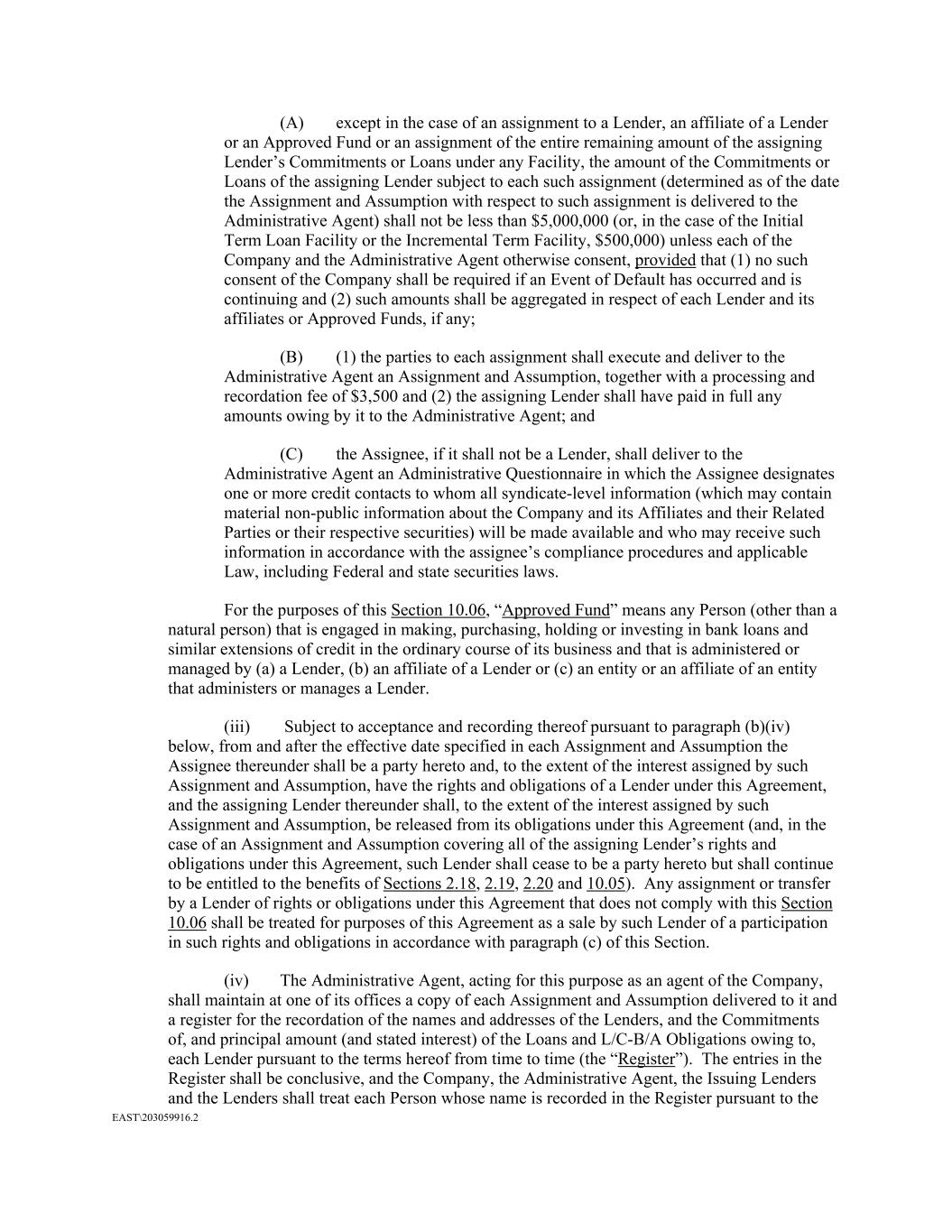 (A) except in the case of an assignment to a Lender, an affiliate of a Lender or an Approved Fund or an assignment of the entire remaining amount of the assigning Lender’s Commitments or Loans under any Facility, the amount of the Commitments or Loans of the assigning Lender subject to each such assignment (determined as of the date the Assignment and Assumption with respect to such assignment is delivered to the Administrative Agent) shall not be less than $5,000,000 (or, in the case of the Initial Term Loan Facility or the Incremental Term Facility, $500,000) unless each of the Company and the Administrative Agent otherwise consent, provided that (1) no such consent of the Company shall be required if an Event of Default has occurred and is continuing and (2) such amounts shall be aggregated in respect of each Lender and its affiliates or Approved Funds, if any; (B) (1) the parties to each assignment shall execute and deliver to the Administrative Agent an Assignment and Assumption, together with a processing and recordation fee of $3,500 and (2) the assigning Lender shall have paid in full any amounts owing by it to the Administrative Agent; and (C) the Assignee, if it shall not be a Lender, shall deliver to the Administrative Agent an Administrative Questionnaire in which the Assignee designates one or more credit contacts to whom all syndicate-level information (which may contain material non-public information about the Company and its Affiliates and their Related Parties or their respective securities) will be made available and who may receive such information in accordance with the assignee’s compliance procedures and applicable Law, including Federal and state securities laws. For the purposes of this Section 10.06, “Approved Fund” means any Person (other than a natural person) that is engaged in making, purchasing, holding or investing in bank loans and similar extensions of credit in the ordinary course of its business and that is administered or managed by (a) a Lender, (b) an affiliate of a Lender or (c) an entity or an affiliate of an entity that administers or manages a Lender. (iii) Subject to acceptance and recording thereof pursuant to paragraph (b)(iv) below, from and after the effective date specified in each Assignment and Assumption the Assignee thereunder shall be a party hereto and, to the extent of the interest assigned by such Assignment and Assumption, have the rights and obligations of a Lender under this Agreement, and the assigning Lender thereunder shall, to the extent of the interest assigned by such Assignment and Assumption, be released from its obligations under this Agreement (and, in the case of an Assignment and Assumption covering all of the assigning Lender’s rights and obligations under this Agreement, such Lender shall cease to be a party hereto but shall continue to be entitled to the benefits of Sections 2.18, 2.19, 2.20 and 10.05). Any assignment or transfer by a Lender of rights or obligations under this Agreement that does not comply with this Section 10.06 shall be treated for purposes of this Agreement as a sale by such Lender of a participation in such rights and obligations in accordance with paragraph (c) of this Section. (iv) The Administrative Agent, acting for this purpose as an agent of the Company, shall maintain at one of its offices a copy of each Assignment and Assumption delivered to it and a register for the recordation of the names and addresses of the Lenders, and the Commitments of, and principal amount (and stated interest) of the Loans and L/C-B/A Obligations owing to, each Lender pursuant to the terms hereof from time to time (the “Register”). The entries in the Register shall be conclusive, and the Company, the Administrative Agent, the Issuing Lenders and the Lenders shall treat each Person whose name is recorded in the Register pursuant to the EAST\203059916.2