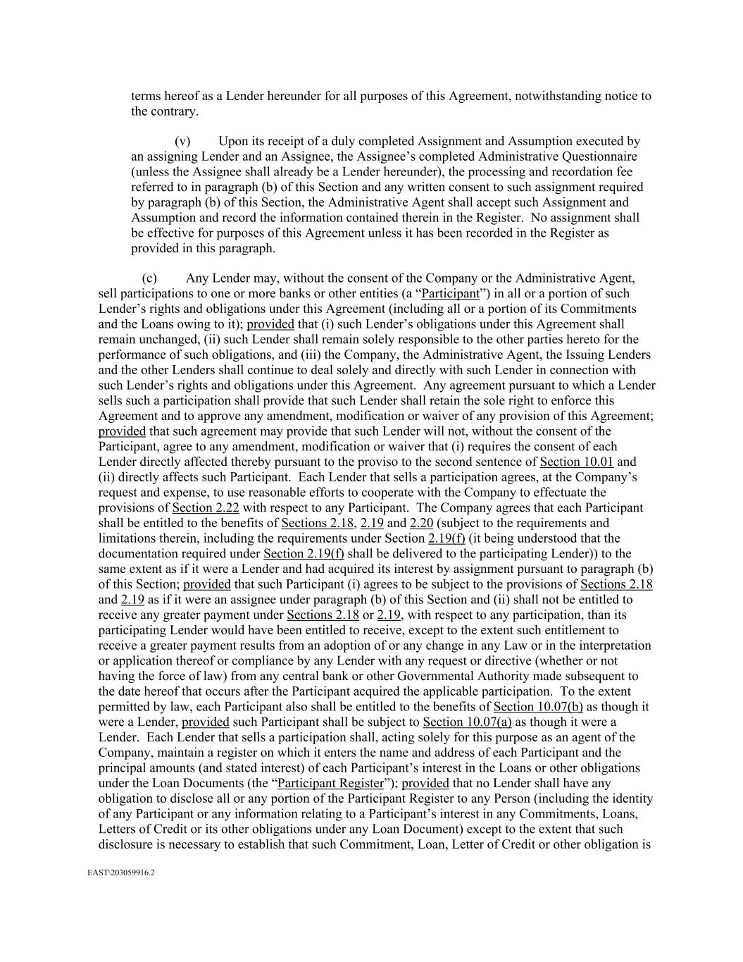 terms hereof as a Lender hereunder for all purposes of this Agreement, notwithstanding notice to the contrary. (v) Upon its receipt of a duly completed Assignment and Assumption executed by an assigning Lender and an Assignee, the Assignee’s completed Administrative Questionnaire (unless the Assignee shall already be a Lender hereunder), the processing and recordation fee referred to in paragraph (b) of this Section and any written consent to such assignment required by paragraph (b) of this Section, the Administrative Agent shall accept such Assignment and Assumption and record the information contained therein in the Register. No assignment shall be effective for purposes of this Agreement unless it has been recorded in the Register as provided in this paragraph. (c) Any Lender may, without the consent of the Company or the Administrative Agent, sell participations to one or more banks or other entities (a “Participant”) in all or a portion of such Lender’s rights and obligations under this Agreement (including all or a portion of its Commitments and the Loans owing to it); provided that (i) such Lender’s obligations under this Agreement shall remain unchanged, (ii) such Lender shall remain solely responsible to the other parties hereto for the performance of such obligations, and (iii) the Company, the Administrative Agent, the Issuing Lenders and the other Lenders shall continue to deal solely and directly with such Lender in connection with such Lender’s rights and obligations under this Agreement. Any agreement pursuant to which a Lender sells such a participation shall provide that such Lender shall retain the sole right to enforce this Agreement and to approve any amendment, modification or waiver of any provision of this Agreement; provided that such agreement may provide that such Lender will not, without the consent of the Participant, agree to any amendment, modification or waiver that (i) requires the consent of each Lender directly affected thereby pursuant to the proviso to the second sentence of Section 10.01 and (ii) directly affects such Participant. Each Lender that sells a participation agrees, at the Company’s request and expense, to use reasonable efforts to cooperate with the Company to effectuate the provisions of Section 2.22 with respect to any Participant. The Company agrees that each Participant shall be entitled to the benefits of Sections 2.18, 2.19 and 2.20 (subject to the requirements and limitations therein, including the requirements under Section 2.19(f) (it being understood that the documentation required under Section 2.19(f) shall be delivered to the participating Lender)) to the same extent as if it were a Lender and had acquired its interest by assignment pursuant to paragraph (b) of this Section; provided that such Participant (i) agrees to be subject to the provisions of Sections 2.18 and 2.19 as if it were an assignee under paragraph (b) of this Section and (ii) shall not be entitled to receive any greater payment under Sections 2.18 or 2.19, with respect to any participation, than its participating Lender would have been entitled to receive, except to the extent such entitlement to receive a greater payment results from an adoption of or any change in any Law or in the interpretation or application thereof or compliance by any Lender with any request or directive (whether or not having the force of law) from any central bank or other Governmental Authority made subsequent to the date hereof that occurs after the Participant acquired the applicable participation. To the extent permitted by law, each Participant also shall be entitled to the benefits of Section 10.07(b) as though it were a Lender, provided such Participant shall be subject to Section 10.07(a) as though it were a Lender. Each Lender that sells a participation shall, acting solely for this purpose as an agent of the Company, maintain a register on which it enters the name and address of each Participant and the principal amounts (and stated interest) of each Participant’s interest in the Loans or other obligations under the Loan Documents (the “Participant Register”); provided that no Lender shall have any obligation to disclose all or any portion of the Participant Register to any Person (including the identity of any Participant or any information relating to a Participant’s interest in any Commitments, Loans, Letters of Credit or its other obligations under any Loan Document) except to the extent that such disclosure is necessary to establish that such Commitment, Loan, Letter of Credit or other obligation is EAST\203059916.2