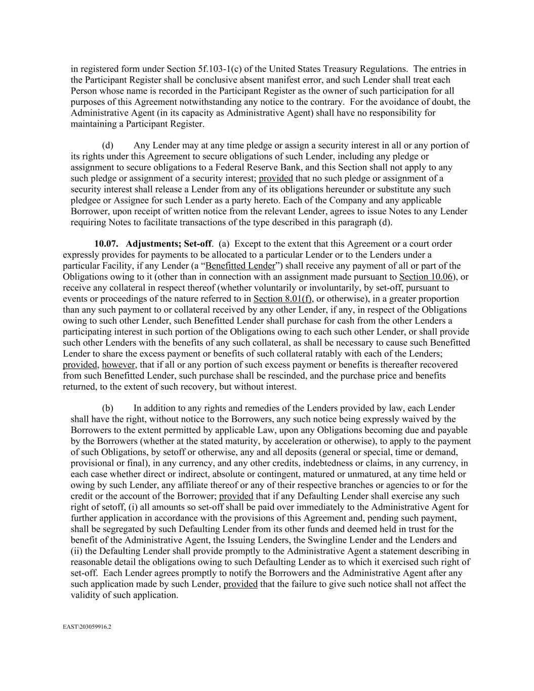 in registered form under Section 5f.103-1(c) of the United States Treasury Regulations. The entries in the Participant Register shall be conclusive absent manifest error, and such Lender shall treat each Person whose name is recorded in the Participant Register as the owner of such participation for all purposes of this Agreement notwithstanding any notice to the contrary. For the avoidance of doubt, the Administrative Agent (in its capacity as Administrative Agent) shall have no responsibility for maintaining a Participant Register. (d) Any Lender may at any time pledge or assign a security interest in all or any portion of its rights under this Agreement to secure obligations of such Lender, including any pledge or assignment to secure obligations to a Federal Reserve Bank, and this Section shall not apply to any such pledge or assignment of a security interest; provided that no such pledge or assignment of a security interest shall release a Lender from any of its obligations hereunder or substitute any such pledgee or Assignee for such Lender as a party hereto. Each of the Company and any applicable Borrower, upon receipt of written notice from the relevant Lender, agrees to issue Notes to any Lender requiring Notes to facilitate transactions of the type described in this paragraph (d). 10.07. Adjustments; Set-off. (a) Except to the extent that this Agreement or a court order expressly provides for payments to be allocated to a particular Lender or to the Lenders under a particular Facility, if any Lender (a “Benefitted Lender”) shall receive any payment of all or part of the Obligations owing to it (other than in connection with an assignment made pursuant to Section 10.06), or receive any collateral in respect thereof (whether voluntarily or involuntarily, by set-off, pursuant to events or proceedings of the nature referred to in Section 8.01(f), or otherwise), in a greater proportion than any such payment to or collateral received by any other Lender, if any, in respect of the Obligations owing to such other Lender, such Benefitted Lender shall purchase for cash from the other Lenders a participating interest in such portion of the Obligations owing to each such other Lender, or shall provide such other Lenders with the benefits of any such collateral, as shall be necessary to cause such Benefitted Lender to share the excess payment or benefits of such collateral ratably with each of the Lenders; provided, however, that if all or any portion of such excess payment or benefits is thereafter recovered from such Benefitted Lender, such purchase shall be rescinded, and the purchase price and benefits returned, to the extent of such recovery, but without interest. (b) In addition to any rights and remedies of the Lenders provided by law, each Lender shall have the right, without notice to the Borrowers, any such notice being expressly waived by the Borrowers to the extent permitted by applicable Law, upon any Obligations becoming due and payable by the Borrowers (whether at the stated maturity, by acceleration or otherwise), to apply to the payment of such Obligations, by setoff or otherwise, any and all deposits (general or special, time or demand, provisional or final), in any currency, and any other credits, indebtedness or claims, in any currency, in each case whether direct or indirect, absolute or contingent, matured or unmatured, at any time held or owing by such Lender, any affiliate thereof or any of their respective branches or agencies to or for the credit or the account of the Borrower; provided that if any Defaulting Lender shall exercise any such right of setoff, (i) all amounts so set-off shall be paid over immediately to the Administrative Agent for further application in accordance with the provisions of this Agreement and, pending such payment, shall be segregated by such Defaulting Lender from its other funds and deemed held in trust for the benefit of the Administrative Agent, the Issuing Lenders, the Swingline Lender and the Lenders and (ii) the Defaulting Lender shall provide promptly to the Administrative Agent a statement describing in reasonable detail the obligations owing to such Defaulting Lender as to which it exercised such right of set-off. Each Lender agrees promptly to notify the Borrowers and the Administrative Agent after any such application made by such Lender, provided that the failure to give such notice shall not affect the validity of such application. EAST\203059916.2