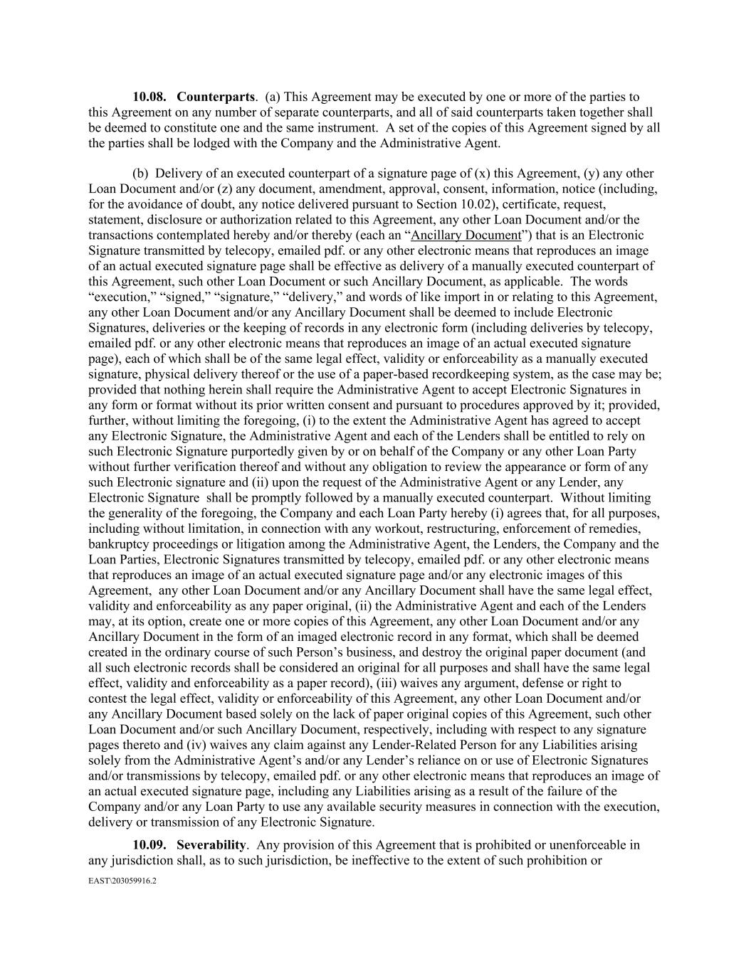 10.08. Counterparts. (a) This Agreement may be executed by one or more of the parties to this Agreement on any number of separate counterparts, and all of said counterparts taken together shall be deemed to constitute one and the same instrument. A set of the copies of this Agreement signed by all the parties shall be lodged with the Company and the Administrative Agent. (b) Delivery of an executed counterpart of a signature page of (x) this Agreement, (y) any other Loan Document and/or (z) any document, amendment, approval, consent, information, notice (including, for the avoidance of doubt, any notice delivered pursuant to Section 10.02), certificate, request, statement, disclosure or authorization related to this Agreement, any other Loan Document and/or the transactions contemplated hereby and/or thereby (each an “Ancillary Document”) that is an Electronic Signature transmitted by telecopy, emailed pdf. or any other electronic means that reproduces an image of an actual executed signature page shall be effective as delivery of a manually executed counterpart of this Agreement, such other Loan Document or such Ancillary Document, as applicable. The words “execution,” “signed,” “signature,” “delivery,” and words of like import in or relating to this Agreement, any other Loan Document and/or any Ancillary Document shall be deemed to include Electronic Signatures, deliveries or the keeping of records in any electronic form (including deliveries by telecopy, emailed pdf. or any other electronic means that reproduces an image of an actual executed signature page), each of which shall be of the same legal effect, validity or enforceability as a manually executed signature, physical delivery thereof or the use of a paper-based recordkeeping system, as the case may be; provided that nothing herein shall require the Administrative Agent to accept Electronic Signatures in any form or format without its prior written consent and pursuant to procedures approved by it; provided, further, without limiting the foregoing, (i) to the extent the Administrative Agent has agreed to accept any Electronic Signature, the Administrative Agent and each of the Lenders shall be entitled to rely on such Electronic Signature purportedly given by or on behalf of the Company or any other Loan Party without further verification thereof and without any obligation to review the appearance or form of any such Electronic signature and (ii) upon the request of the Administrative Agent or any Lender, any Electronic Signature shall be promptly followed by a manually executed counterpart. Without limiting the generality of the foregoing, the Company and each Loan Party hereby (i) agrees that, for all purposes, including without limitation, in connection with any workout, restructuring, enforcement of remedies, bankruptcy proceedings or litigation among the Administrative Agent, the Lenders, the Company and the Loan Parties, Electronic Signatures transmitted by telecopy, emailed pdf. or any other electronic means that reproduces an image of an actual executed signature page and/or any electronic images of this Agreement, any other Loan Document and/or any Ancillary Document shall have the same legal effect, validity and enforceability as any paper original, (ii) the Administrative Agent and each of the Lenders may, at its option, create one or more copies of this Agreement, any other Loan Document and/or any Ancillary Document in the form of an imaged electronic record in any format, which shall be deemed created in the ordinary course of such Person’s business, and destroy the original paper document (and all such electronic records shall be considered an original for all purposes and shall have the same legal effect, validity and enforceability as a paper record), (iii) waives any argument, defense or right to contest the legal effect, validity or enforceability of this Agreement, any other Loan Document and/or any Ancillary Document based solely on the lack of paper original copies of this Agreement, such other Loan Document and/or such Ancillary Document, respectively, including with respect to any signature pages thereto and (iv) waives any claim against any Lender-Related Person for any Liabilities arising solely from the Administrative Agent’s and/or any Lender’s reliance on or use of Electronic Signatures and/or transmissions by telecopy, emailed pdf. or any other electronic means that reproduces an image of an actual executed signature page, including any Liabilities arising as a result of the failure of the Company and/or any Loan Party to use any available security measures in connection with the execution, delivery or transmission of any Electronic Signature. 10.09. Severability. Any provision of this Agreement that is prohibited or unenforceable in any jurisdiction shall, as to such jurisdiction, be ineffective to the extent of such prohibition or EAST\203059916.2