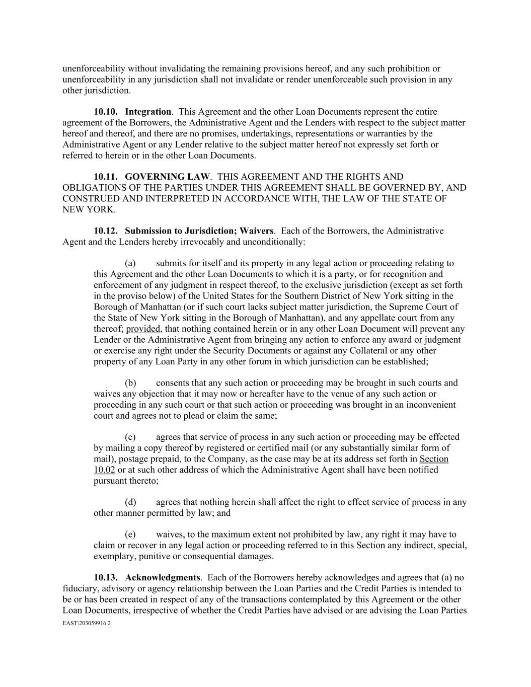 unenforceability without invalidating the remaining provisions hereof, and any such prohibition or unenforceability in any jurisdiction shall not invalidate or render unenforceable such provision in any other jurisdiction. 10.10. Integration. This Agreement and the other Loan Documents represent the entire agreement of the Borrowers, the Administrative Agent and the Lenders with respect to the subject matter hereof and thereof, and there are no promises, undertakings, representations or warranties by the Administrative Agent or any Lender relative to the subject matter hereof not expressly set forth or referred to herein or in the other Loan Documents. 10.11. GOVERNING LAW. THIS AGREEMENT AND THE RIGHTS AND OBLIGATIONS OF THE PARTIES UNDER THIS AGREEMENT SHALL BE GOVERNED BY, AND CONSTRUED AND INTERPRETED IN ACCORDANCE WITH, THE LAW OF THE STATE OF NEW YORK. 10.12. Submission to Jurisdiction; Waivers. Each of the Borrowers, the Administrative Agent and the Lenders hereby irrevocably and unconditionally: (a) submits for itself and its property in any legal action or proceeding relating to this Agreement and the other Loan Documents to which it is a party, or for recognition and enforcement of any judgment in respect thereof, to the exclusive jurisdiction (except as set forth in the proviso below) of the United States for the Southern District of New York sitting in the Borough of Manhattan (or if such court lacks subject matter jurisdiction, the Supreme Court of the State of New York sitting in the Borough of Manhattan), and any appellate court from any thereof; provided, that nothing contained herein or in any other Loan Document will prevent any Lender or the Administrative Agent from bringing any action to enforce any award or judgment or exercise any right under the Security Documents or against any Collateral or any other property of any Loan Party in any other forum in which jurisdiction can be established; (b) consents that any such action or proceeding may be brought in such courts and waives any objection that it may now or hereafter have to the venue of any such action or proceeding in any such court or that such action or proceeding was brought in an inconvenient court and agrees not to plead or claim the same; (c) agrees that service of process in any such action or proceeding may be effected by mailing a copy thereof by registered or certified mail (or any substantially similar form of mail), postage prepaid, to the Company, as the case may be at its address set forth in Section 10.02 or at such other address of which the Administrative Agent shall have been notified pursuant thereto; (d) agrees that nothing herein shall affect the right to effect service of process in any other manner permitted by law; and (e) waives, to the maximum extent not prohibited by law, any right it may have to claim or recover in any legal action or proceeding referred to in this Section any indirect, special, exemplary, punitive or consequential damages. 10.13. Acknowledgments. Each of the Borrowers hereby acknowledges and agrees that (a) no fiduciary, advisory or agency relationship between the Loan Parties and the Credit Parties is intended to be or has been created in respect of any of the transactions contemplated by this Agreement or the other Loan Documents, irrespective of whether the Credit Parties have advised or are advising the Loan Parties EAST\203059916.2