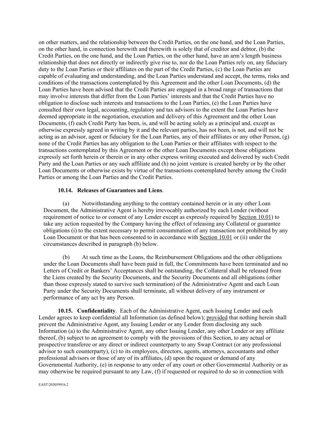on other matters, and the relationship between the Credit Parties, on the one hand, and the Loan Parties, on the other hand, in connection herewith and therewith is solely that of creditor and debtor, (b) the Credit Parties, on the one hand, and the Loan Parties, on the other hand, have an arm’s length business relationship that does not directly or indirectly give rise to, nor do the Loan Parties rely on, any fiduciary duty to the Loan Parties or their affiliates on the part of the Credit Parties, (c) the Loan Parties are capable of evaluating and understanding, and the Loan Parties understand and accept, the terms, risks and conditions of the transactions contemplated by this Agreement and the other Loan Documents, (d) the Loan Parties have been advised that the Credit Parties are engaged in a broad range of transactions that may involve interests that differ from the Loan Parties’ interests and that the Credit Parties have no obligation to disclose such interests and transactions to the Loan Parties, (e) the Loan Parties have consulted their own legal, accounting, regulatory and tax advisors to the extent the Loan Parties have deemed appropriate in the negotiation, execution and delivery of this Agreement and the other Loan Documents, (f) each Credit Party has been, is, and will be acting solely as a principal and, except as otherwise expressly agreed in writing by it and the relevant parties, has not been, is not, and will not be acting as an advisor, agent or fiduciary for the Loan Parties, any of their affiliates or any other Person, (g) none of the Credit Parties has any obligation to the Loan Parties or their affiliates with respect to the transactions contemplated by this Agreement or the other Loan Documents except those obligations expressly set forth herein or therein or in any other express writing executed and delivered by such Credit Party and the Loan Parties or any such affiliate and (h) no joint venture is created hereby or by the other Loan Documents or otherwise exists by virtue of the transactions contemplated hereby among the Credit Parties or among the Loan Parties and the Credit Parties. 10.14. Releases of Guarantees and Liens. (a) Notwithstanding anything to the contrary contained herein or in any other Loan Document, the Administrative Agent is hereby irrevocably authorized by each Lender (without requirement of notice to or consent of any Lender except as expressly required by Section 10.01) to take any action requested by the Company having the effect of releasing any Collateral or guarantee obligations (i) to the extent necessary to permit consummation of any transaction not prohibited by any Loan Document or that has been consented to in accordance with Section 10.01 or (ii) under the circumstances described in paragraph (b) below. (b) At such time as the Loans, the Reimbursement Obligations and the other obligations under the Loan Documents shall have been paid in full, the Commitments have been terminated and no Letters of Credit or Bankers’ Acceptances shall be outstanding, the Collateral shall be released from the Liens created by the Security Documents, and the Security Documents and all obligations (other than those expressly stated to survive such termination) of the Administrative Agent and each Loan Party under the Security Documents shall terminate, all without delivery of any instrument or performance of any act by any Person. 10.15. Confidentiality. Each of the Administrative Agent, each Issuing Lender and each Lender agrees to keep confidential all Information (as defined below); provided that nothing herein shall prevent the Administrative Agent, any Issuing Lender or any Lender from disclosing any such Information (a) to the Administrative Agent, any other Issuing Lender, any other Lender or any affiliate thereof, (b) subject to an agreement to comply with the provisions of this Section, to any actual or prospective transferee or any direct or indirect counterparty to any Swap Contract (or any professional advisor to such counterparty), (c) to its employees, directors, agents, attorneys, accountants and other professional advisors or those of any of its affiliates, (d) upon the request or demand of any Governmental Authority, (e) in response to any order of any court or other Governmental Authority or as may otherwise be required pursuant to any Law, (f) if requested or required to do so in connection with EAST\203059916.2