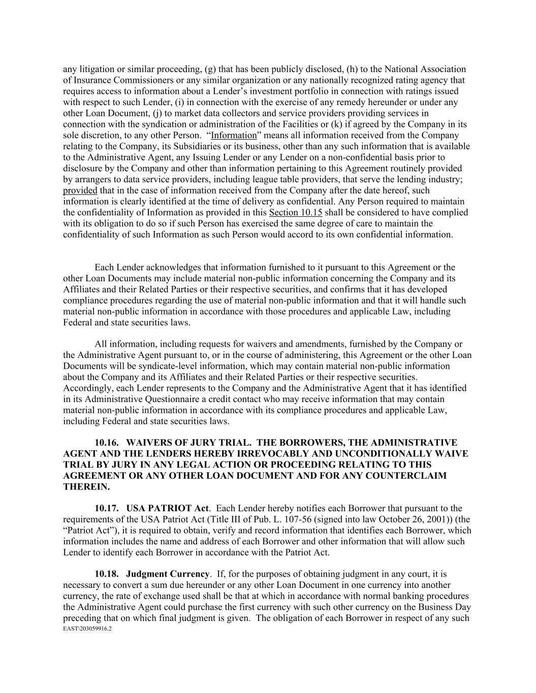 any litigation or similar proceeding, (g) that has been publicly disclosed, (h) to the National Association of Insurance Commissioners or any similar organization or any nationally recognized rating agency that requires access to information about a Lender’s investment portfolio in connection with ratings issued with respect to such Lender, (i) in connection with the exercise of any remedy hereunder or under any other Loan Document, (j) to market data collectors and service providers providing services in connection with the syndication or administration of the Facilities or (k) if agreed by the Company in its sole discretion, to any other Person. “Information” means all information received from the Company relating to the Company, its Subsidiaries or its business, other than any such information that is available to the Administrative Agent, any Issuing Lender or any Lender on a non-confidential basis prior to disclosure by the Company and other than information pertaining to this Agreement routinely provided by arrangers to data service providers, including league table providers, that serve the lending industry; provided that in the case of information received from the Company after the date hereof, such information is clearly identified at the time of delivery as confidential. Any Person required to maintain the confidentiality of Information as provided in this Section 10.15 shall be considered to have complied with its obligation to do so if such Person has exercised the same degree of care to maintain the confidentiality of such Information as such Person would accord to its own confidential information. Each Lender acknowledges that information furnished to it pursuant to this Agreement or the other Loan Documents may include material non-public information concerning the Company and its Affiliates and their Related Parties or their respective securities, and confirms that it has developed compliance procedures regarding the use of material non-public information and that it will handle such material non-public information in accordance with those procedures and applicable Law, including Federal and state securities laws. All information, including requests for waivers and amendments, furnished by the Company or the Administrative Agent pursuant to, or in the course of administering, this Agreement or the other Loan Documents will be syndicate-level information, which may contain material non-public information about the Company and its Affiliates and their Related Parties or their respective securities. Accordingly, each Lender represents to the Company and the Administrative Agent that it has identified in its Administrative Questionnaire a credit contact who may receive information that may contain material non-public information in accordance with its compliance procedures and applicable Law, including Federal and state securities laws. 10.16. WAIVERS OF JURY TRIAL. THE BORROWERS, THE ADMINISTRATIVE AGENT AND THE LENDERS HEREBY IRREVOCABLY AND UNCONDITIONALLY WAIVE TRIAL BY JURY IN ANY LEGAL ACTION OR PROCEEDING RELATING TO THIS AGREEMENT OR ANY OTHER LOAN DOCUMENT AND FOR ANY COUNTERCLAIM THEREIN. 10.17. USA PATRIOT Act. Each Lender hereby notifies each Borrower that pursuant to the requirements of the USA Patriot Act (Title III of Pub. L. 107-56 (signed into law October 26, 2001)) (the “Patriot Act”), it is required to obtain, verify and record information that identifies each Borrower, which information includes the name and address of each Borrower and other information that will allow such Lender to identify each Borrower in accordance with the Patriot Act. 10.18. Judgment Currency. If, for the purposes of obtaining judgment in any court, it is necessary to convert a sum due hereunder or any other Loan Document in one currency into another currency, the rate of exchange used shall be that at which in accordance with normal banking procedures the Administrative Agent could purchase the first currency with such other currency on the Business Day preceding that on which final judgment is given. The obligation of each Borrower in respect of any such EAST\203059916.2