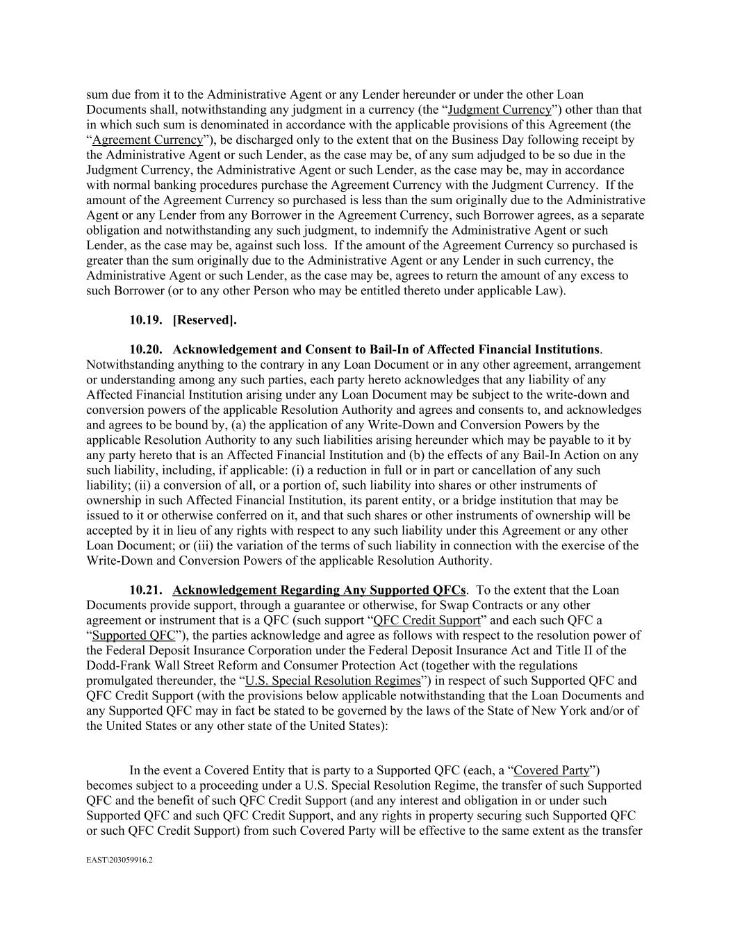 sum due from it to the Administrative Agent or any Lender hereunder or under the other Loan Documents shall, notwithstanding any judgment in a currency (the “Judgment Currency”) other than that in which such sum is denominated in accordance with the applicable provisions of this Agreement (the “Agreement Currency”), be discharged only to the extent that on the Business Day following receipt by the Administrative Agent or such Lender, as the case may be, of any sum adjudged to be so due in the Judgment Currency, the Administrative Agent or such Lender, as the case may be, may in accordance with normal banking procedures purchase the Agreement Currency with the Judgment Currency. If the amount of the Agreement Currency so purchased is less than the sum originally due to the Administrative Agent or any Lender from any Borrower in the Agreement Currency, such Borrower agrees, as a separate obligation and notwithstanding any such judgment, to indemnify the Administrative Agent or such Lender, as the case may be, against such loss. If the amount of the Agreement Currency so purchased is greater than the sum originally due to the Administrative Agent or any Lender in such currency, the Administrative Agent or such Lender, as the case may be, agrees to return the amount of any excess to such Borrower (or to any other Person who may be entitled thereto under applicable Law). 10.19. [Reserved]. 10.20. Acknowledgement and Consent to Bail-In of Affected Financial Institutions. Notwithstanding anything to the contrary in any Loan Document or in any other agreement, arrangement or understanding among any such parties, each party hereto acknowledges that any liability of any Affected Financial Institution arising under any Loan Document may be subject to the write-down and conversion powers of the applicable Resolution Authority and agrees and consents to, and acknowledges and agrees to be bound by, (a) the application of any Write-Down and Conversion Powers by the applicable Resolution Authority to any such liabilities arising hereunder which may be payable to it by any party hereto that is an Affected Financial Institution and (b) the effects of any Bail-In Action on any such liability, including, if applicable: (i) a reduction in full or in part or cancellation of any such liability; (ii) a conversion of all, or a portion of, such liability into shares or other instruments of ownership in such Affected Financial Institution, its parent entity, or a bridge institution that may be issued to it or otherwise conferred on it, and that such shares or other instruments of ownership will be accepted by it in lieu of any rights with respect to any such liability under this Agreement or any other Loan Document; or (iii) the variation of the terms of such liability in connection with the exercise of the Write-Down and Conversion Powers of the applicable Resolution Authority. 10.21. Acknowledgement Regarding Any Supported QFCs. To the extent that the Loan Documents provide support, through a guarantee or otherwise, for Swap Contracts or any other agreement or instrument that is a QFC (such support “QFC Credit Support” and each such QFC a “Supported QFC”), the parties acknowledge and agree as follows with respect to the resolution power of the Federal Deposit Insurance Corporation under the Federal Deposit Insurance Act and Title II of the Dodd-Frank Wall Street Reform and Consumer Protection Act (together with the regulations promulgated thereunder, the “U.S. Special Resolution Regimes”) in respect of such Supported QFC and QFC Credit Support (with the provisions below applicable notwithstanding that the Loan Documents and any Supported QFC may in fact be stated to be governed by the laws of the State of New York and/or of the United States or any other state of the United States): In the event a Covered Entity that is party to a Supported QFC (each, a “Covered Party”) becomes subject to a proceeding under a U.S. Special Resolution Regime, the transfer of such Supported QFC and the benefit of such QFC Credit Support (and any interest and obligation in or under such Supported QFC and such QFC Credit Support, and any rights in property securing such Supported QFC or such QFC Credit Support) from such Covered Party will be effective to the same extent as the transfer EAST\203059916.2