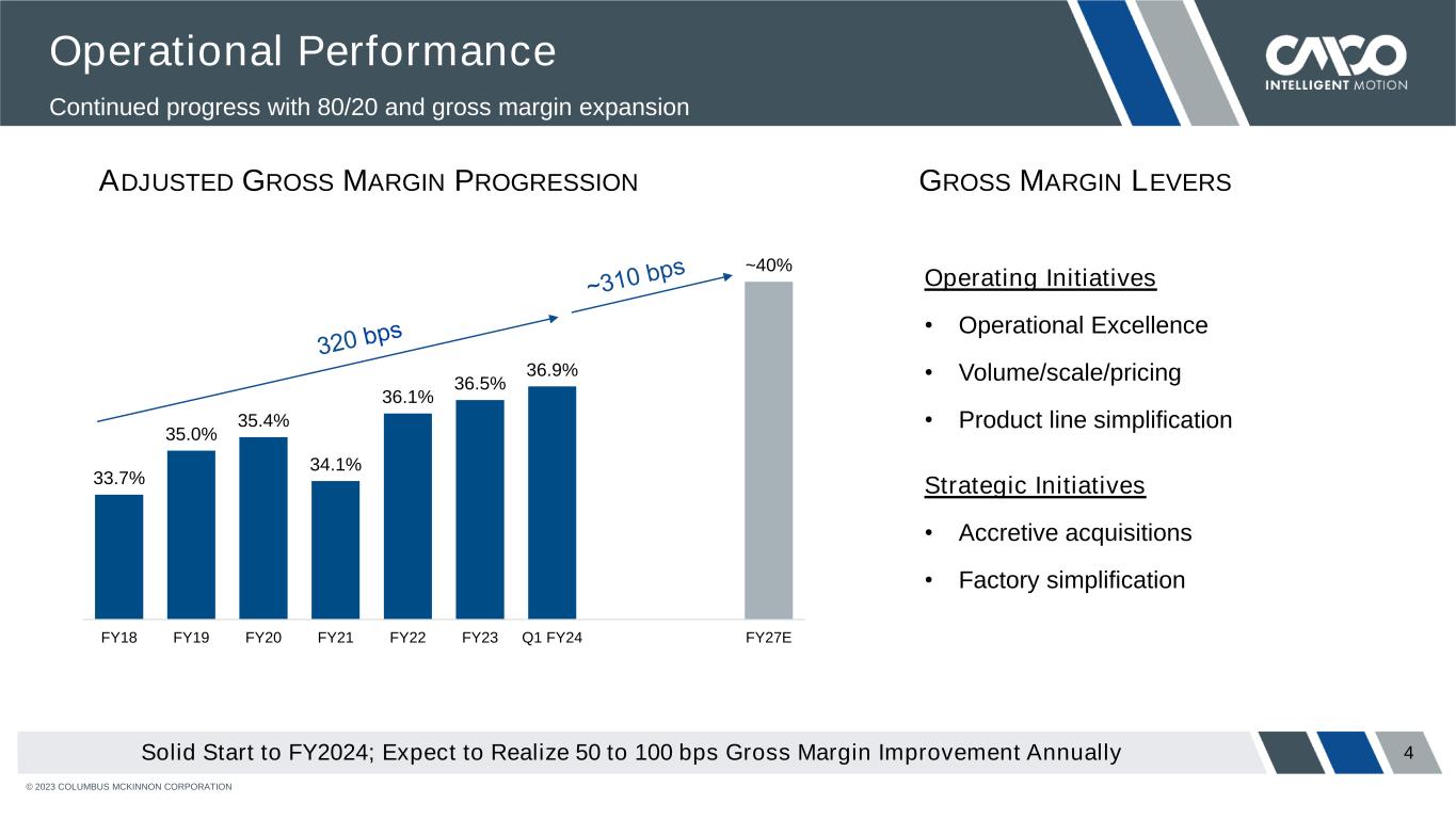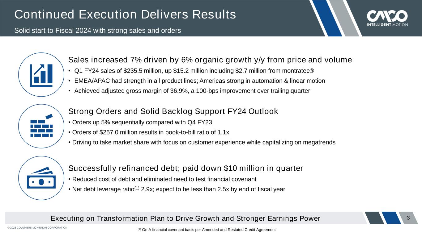 © 2023 COLUMBUS MCKINNON CORPORATION These slides, and the accompanying oral discussion (together, this “presentation”), contain “forward-looking statements” within the meaning of the Private Securities Litigation Reform Act of 1995. Such statements include, but are not limited to, statements concerning expected growth, future sales and EBITDA margins, and future potential to deliver results including revenue guidance, gross margin improvements, and reduction of RSG&A as a percent of revenue; the execution of its strategy and further transformation of the Company with stronger growth, less cyclicality and higher margins, and achievement of certain goals. These statements involve known and unknown risks, uncertainties and other factors that could cause the actual results of the Company to differ materially from the results expressed or implied by such statements, including the impact of supply chain challenges and inflation, the ability of the Company to scale the organization, achieve its financial targets including revenue and adjusted EBITDA margin, and to execute CMBS and the Core Growth Framework; global economic and business conditions affecting the industries served by the Company and its subsidiaries including COVID-19; the Company's customers and suppliers, competitor responses to the Company's products and services, the overall market acceptance of such products and services, the ability to expand into new markets and geographic regions, and other factors disclosed in the Company's periodic reports filed with the Securities and Exchange Commission. Consequently, such forward-looking statements should be regarded as current plans, estimates and beliefs. The Company assumes no obligation to update the forward-looking information contained in this presentation. Non-GAAP Financial Measures and Forward-looking Non-GAAP Measures This presentation will discuss some non-GAAP (“adjusted”) financial measures which we believe are useful in evaluating our performance. You should not consider the presentation of this additional information in isolation or as a substitute for results compared in accordance with GAAP. The non-GAAP (“adjusted”) measures are noted and reconciliations of comparable GAAP with non-GAAP measures can be found in tables included in the Supplemental Information portion of this presentation. Safe Harbor Statement 2