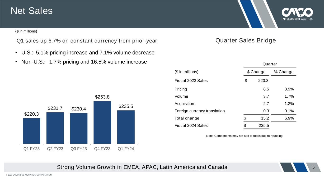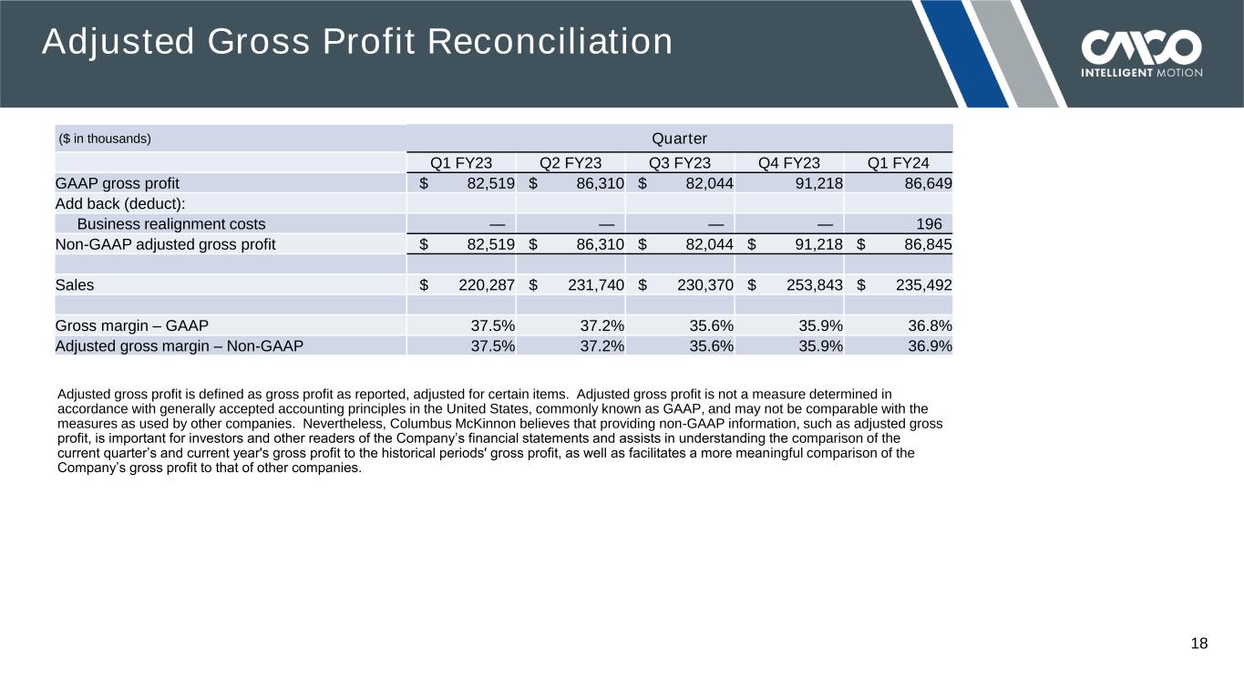 © 2023 COLUMBUS MCKINNON CORPORATION 22 Adjusted EBITDA Reconciliation Adjusted EBITDA is defined as net income before interest expense, income taxes, depreciation, amortization, and other adjustments. Adjusted EBITDA is not a measure determined in accordance with generally accepted accounting principles in the United States, commonly known as GAAP, and may not be comparable with the measures as used by other companies. Nevertheless, Columbus McKinnon believes that providing non-GAAP information, such as adjusted EBITDA, is important for investors and other readers of the Company’s financial statements. ($ in thousands) Quarter Fiscal Year TTM Q1 FY23 Q2 FY23 Q3 FY23 Q4 FY23 Q1 FY24 2022 2023 Q1 FY24 GAAP net income (loss) $ 8,391 $ 14,114 $ 12,029 $ 13,895 $ 9,275 $ 29,660 $ 48,429 $ 49,313 Add back (deduct): Income tax expense (benefit) 8,893 4,953 4,701 7,499 3,394 8,786 26,046 20,547 Interest and debt expense 6,203 6,768 7,303 7,668 8,625 20,126 27,942 30,364 Investment (income) loss 430 312 (574) (483) (543) (46) (315) (1,288) Foreign currency exchange (gain) loss 1,203 1,003 (3,359) (1,037) 483 1,574 (2,189) (2,910) Other (income) expense, net (2,303) 222 79 (73) 214 (1,122) (2,072) 442 Depreciation and amortization expense 10,469 10,424 10,487 10,567 10,890 41,924 41,947 42,368 Cost of debt refinancing — — — — — 14,803 — — Acquisition deal and integration costs 86 19 338 173 2,587 10,473 616 3,117 Acquisition inventory step-up expense — — — — — 5,042 — — Product liability settlement — — — — — 2,850 — — Business realignment costs 1,657 1,233 1,401 848 375 3,902 5,140 3,857 Acquisition amortization of backlog — — — — — 2,100 — — North American warehouse consolidation — — — — 117 — — 117 Garvey contingent consideration — — 1,230 — — — 1,230 1,230 Headquarter relocation costs — — 315 681 1,228 — 996 2,224 Non-GAAP adjusted EBITDA $ 35,029 $ 39,048 $ 33,950 $ 39,738 $ 36,645 $ 140,072 $ 147,770 $ 149,381 Sales $ 220,287 $ 231,740 $ 230,370 $ 253,843 $ 235,492 $ 906,555 $ 936,240 $ 951,445 Add back: Acquisition amortization of backlog — — — — — 2,100 - - Non-GAAP sales $ 220,287 $ 231,740 $ 230,370 $ 253,843 $ 235,492 $ 908,655 $ 936,240 $ 951,445 Net income (loss) margin – GAAP 3.8% 6.1% 5.2% 5.5% 3.9% 3.3% 5.2% 5.2% Adjusted EBITDA margin – Non-GAAP 15.9% 16.8% 14.7% 15.7% 15.6% 15.4% 15.8% 15.7%