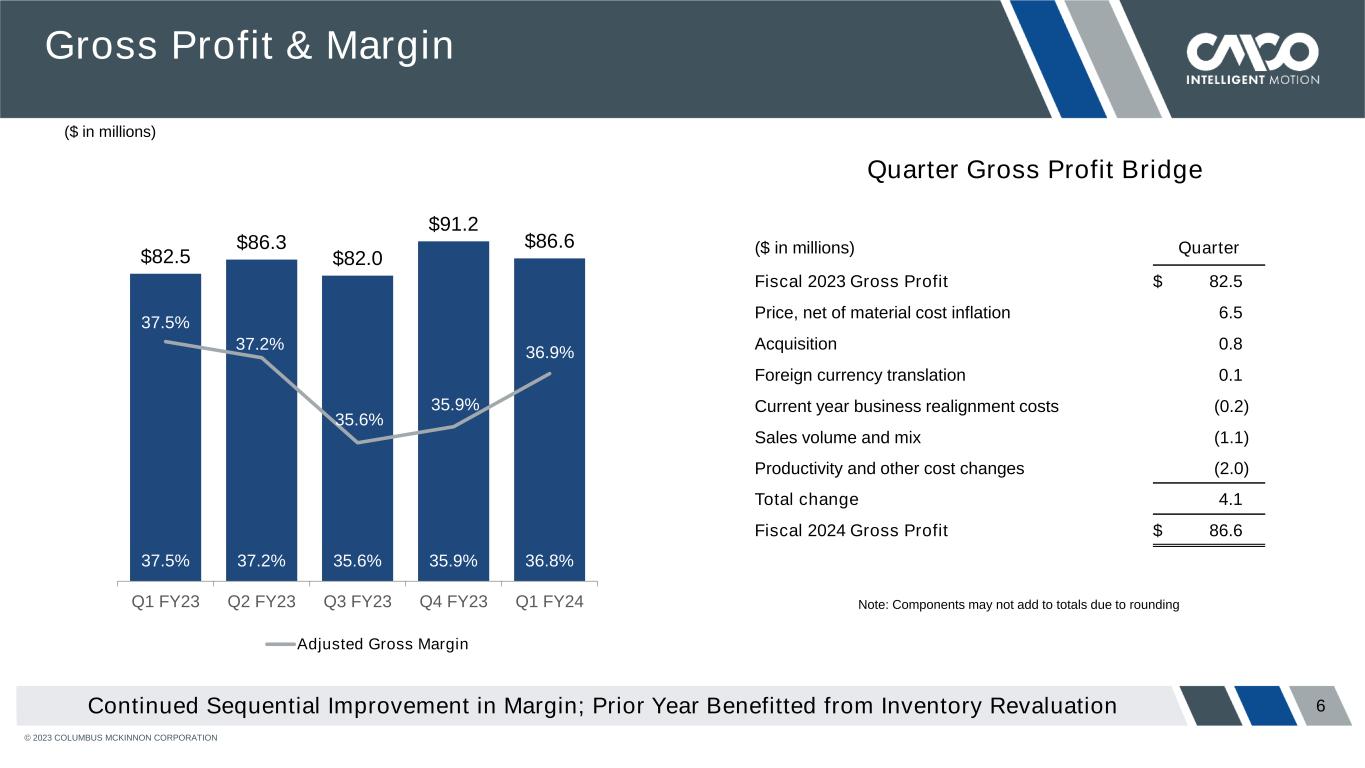 © 2023 COLUMBUS MCKINNON CORPORATION Net Sales Strong Volume Growth in EMEA, APAC, Latin America and Canada Quarter Sales Bridge • U.S.: 5.1% pricing increase and 7.1% volume decrease • Non-U.S.: 1.7% pricing and 16.5% volume increase 5 Q1 sales up 6.7% on constant currency from prior-year $220.3 $231.7 $230.4 $253.8 $235.5 Q1 FY23 Q2 FY23 Q3 FY23 Q4 FY23 Q1 FY24 ($ in millions) Note: Components may not add to totals due to rounding Quarter ($ in millions) $ Change % Change Fiscal 2023 Sales $ 220.3 Pricing 8.5 3.9% Volume 3.7 1.7% Acquisition 2.7 1.2% Foreign currency translation 0.3 0.1% Total change $ 15.2 6.9% Fiscal 2024 Sales $ 235.5