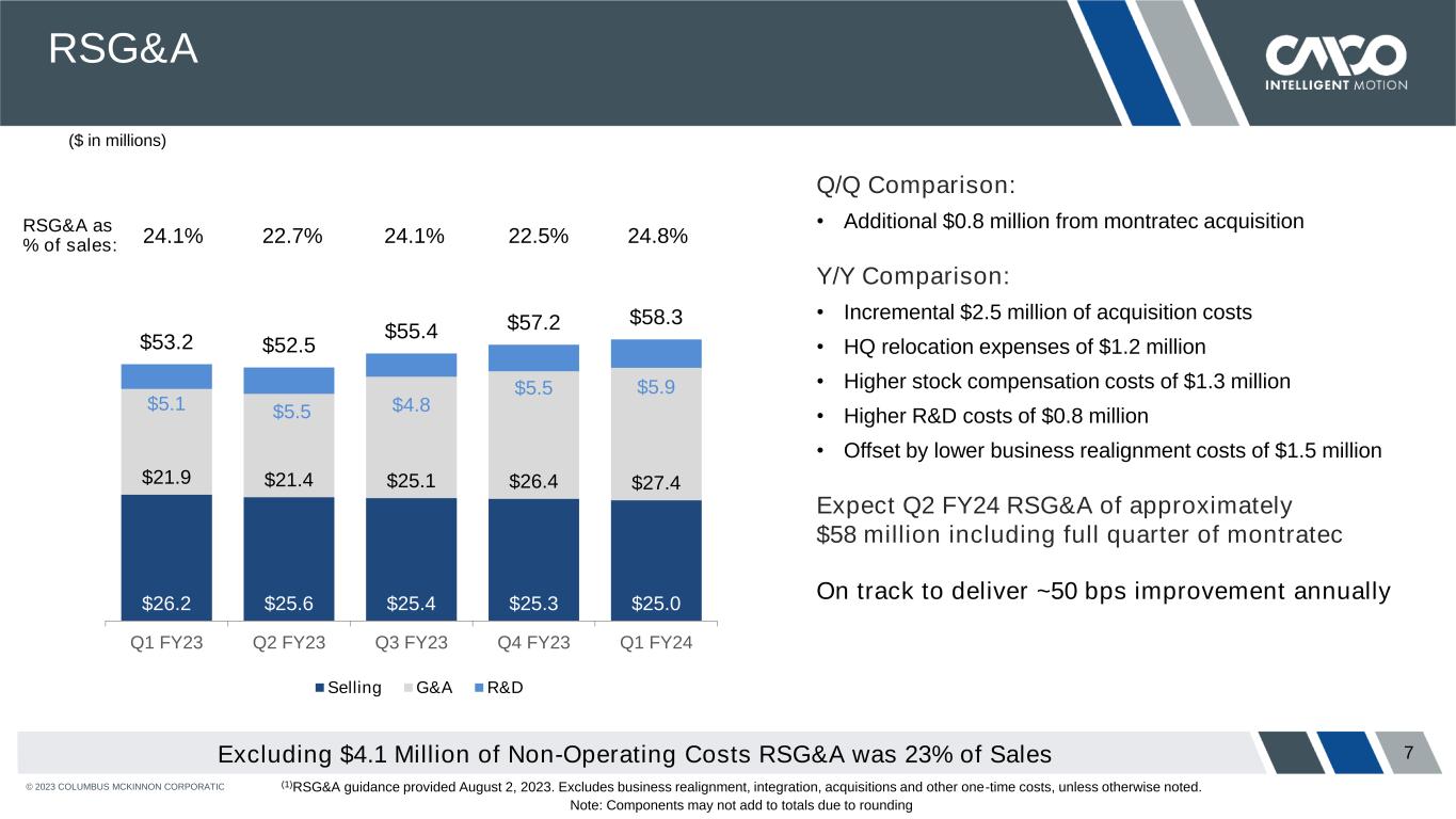 © 2023 COLUMBUS MCKINNON CORPORATION 6 Gross Profit & Margin Quarter Gross Profit Bridge Continued Sequential Improvement in Margin; Prior Year Benefitted from Inventory Revaluation $82.5 $86.3 $82.0 $91.2 $86.6 37.5% 37.2% 35.6% 35.9% 36.8% 37.5% 37.2% 35.6% 35.9% 36.9% Q1 FY23 Q2 FY23 Q3 FY23 Q4 FY23 Q1 FY24 Adjusted Gross Margin ($ in millions) Note: Components may not add to totals due to rounding ($ in millions) Quarter Fiscal 2023 Gross Profit $ 82.5 Price, net of material cost inflation 6.5 Acquisition 0.8 Foreign currency translation 0.1 Current year business realignment costs (0.2) Sales volume and mix (1.1) Productivity and other cost changes (2.0) Total change 4.1 Fiscal 2024 Gross Profit $ 86.6