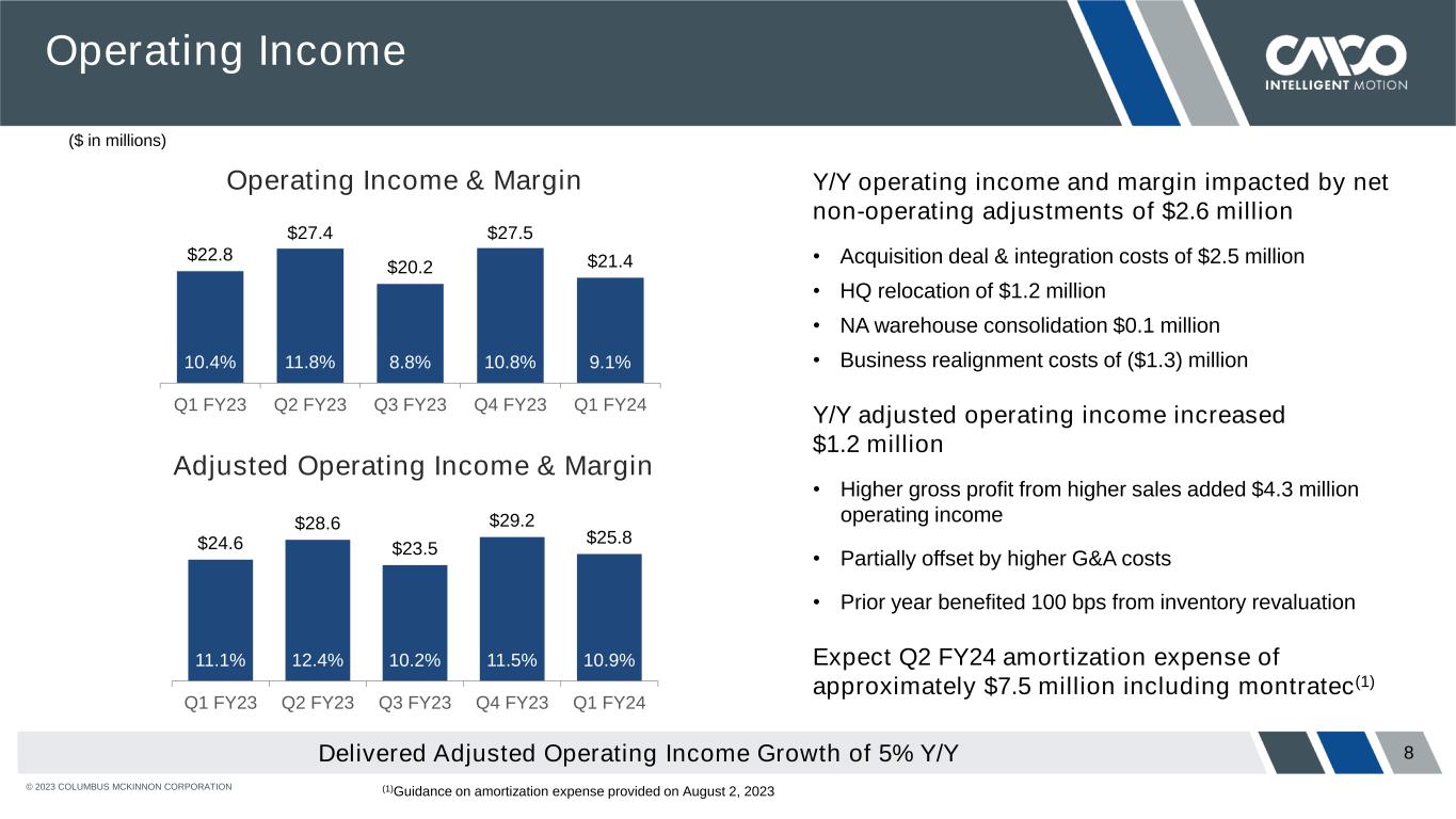 © 2023 COLUMBUS MCKINNON CORPORATION 7 RSG&A $26.2 $25.6 $25.4 $25.3 $25.0 $21.9 $21.4 $25.1 $26.4 $27.4 $5.1 $5.5 $4.8 $5.5 $5.9 $53.2 $52.5 $55.4 $57.2 $58.3 Q1 FY23 Q2 FY23 Q3 FY23 Q4 FY23 Q1 FY24 Selling G&A R&D Q/Q Comparison: • Additional $0.8 million from montratec acquisition Y/Y Comparison: • Incremental $2.5 million of acquisition costs • HQ relocation expenses of $1.2 million • Higher stock compensation costs of $1.3 million • Higher R&D costs of $0.8 million • Offset by lower business realignment costs of $1.5 million Expect Q2 FY24 RSG&A of approximately $58 million including full quarter of montratec On track to deliver ~50 bps improvement annually (1)RSG&A guidance provided August 2, 2023. Excludes business realignment, integration, acquisitions and other one-time costs, unless otherwise noted. Note: Components may not add to totals due to rounding RSG&A as % of sales: 24.8% Excluding $4.1 Million of Non-Operating Costs RSG&A was 23% of Sales ($ in millions) 24.1% 24.1% 22.5%22.7%