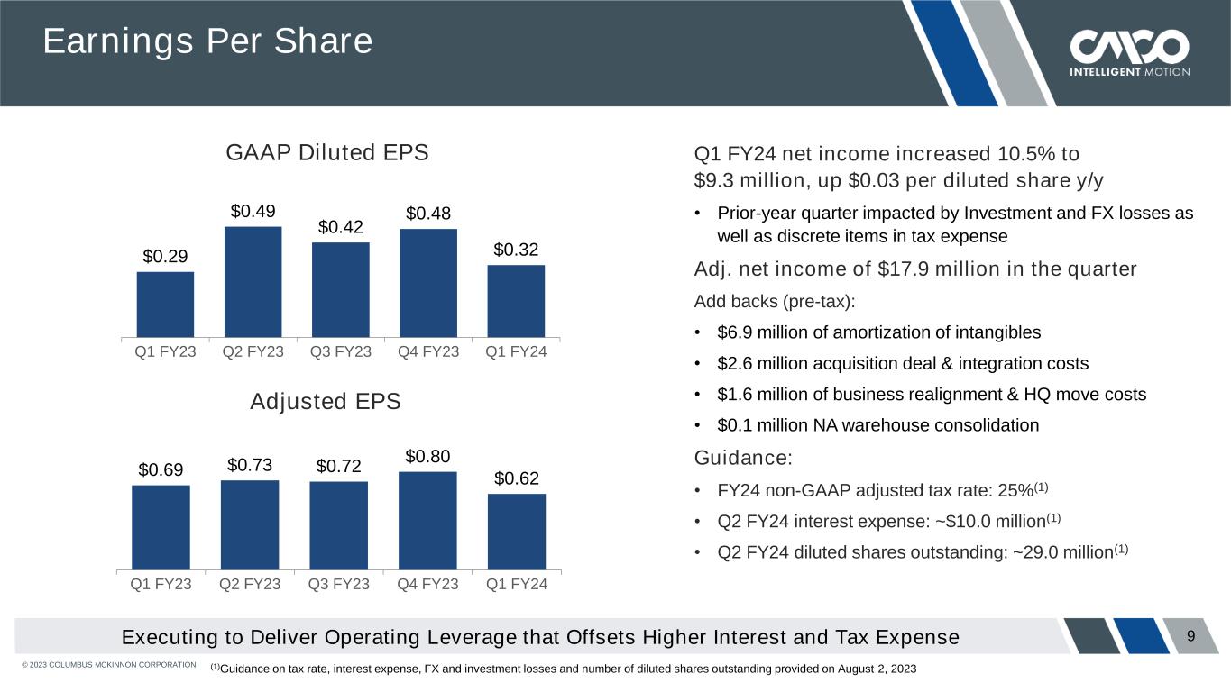© 2023 COLUMBUS MCKINNON CORPORATION 8 Operating Income Y/Y operating income and margin impacted by net non-operating adjustments of $2.6 million • Acquisition deal & integration costs of $2.5 million • HQ relocation of $1.2 million • NA warehouse consolidation $0.1 million • Business realignment costs of ($1.3) million Y/Y adjusted operating income increased $1.2 million • Higher gross profit from higher sales added $4.3 million operating income • Partially offset by higher G&A costs • Prior year benefited 100 bps from inventory revaluation Expect Q2 FY24 amortization expense of approximately $7.5 million including montratec(1) Delivered Adjusted Operating Income Growth of 5% Y/Y Operating Income & Margin Adjusted Operating Income & Margin $24.6 $28.6 $23.5 $29.2 $25.8 11.1% 12.4% 10.2% 11.5% 10.9% Q1 FY23 Q2 FY23 Q3 FY23 Q4 FY23 Q1 FY24 $22.8 $27.4 $20.2 $27.5 $21.4 10.4% 11.8% 8.8% 10.8% 9.1% Q1 FY23 Q2 FY23 Q3 FY23 Q4 FY23 Q1 FY24 ($ in millions) (1)Guidance on amortization expense provided on August 2, 2023