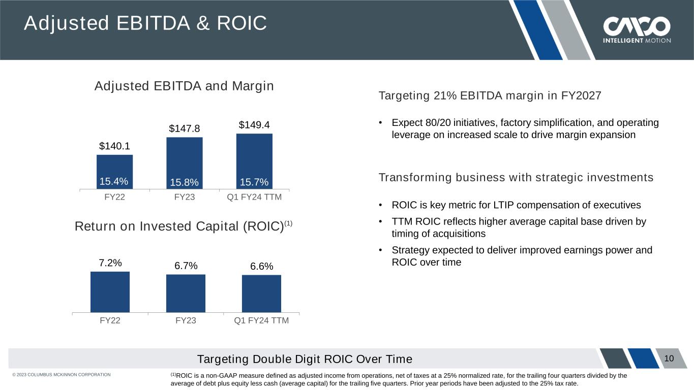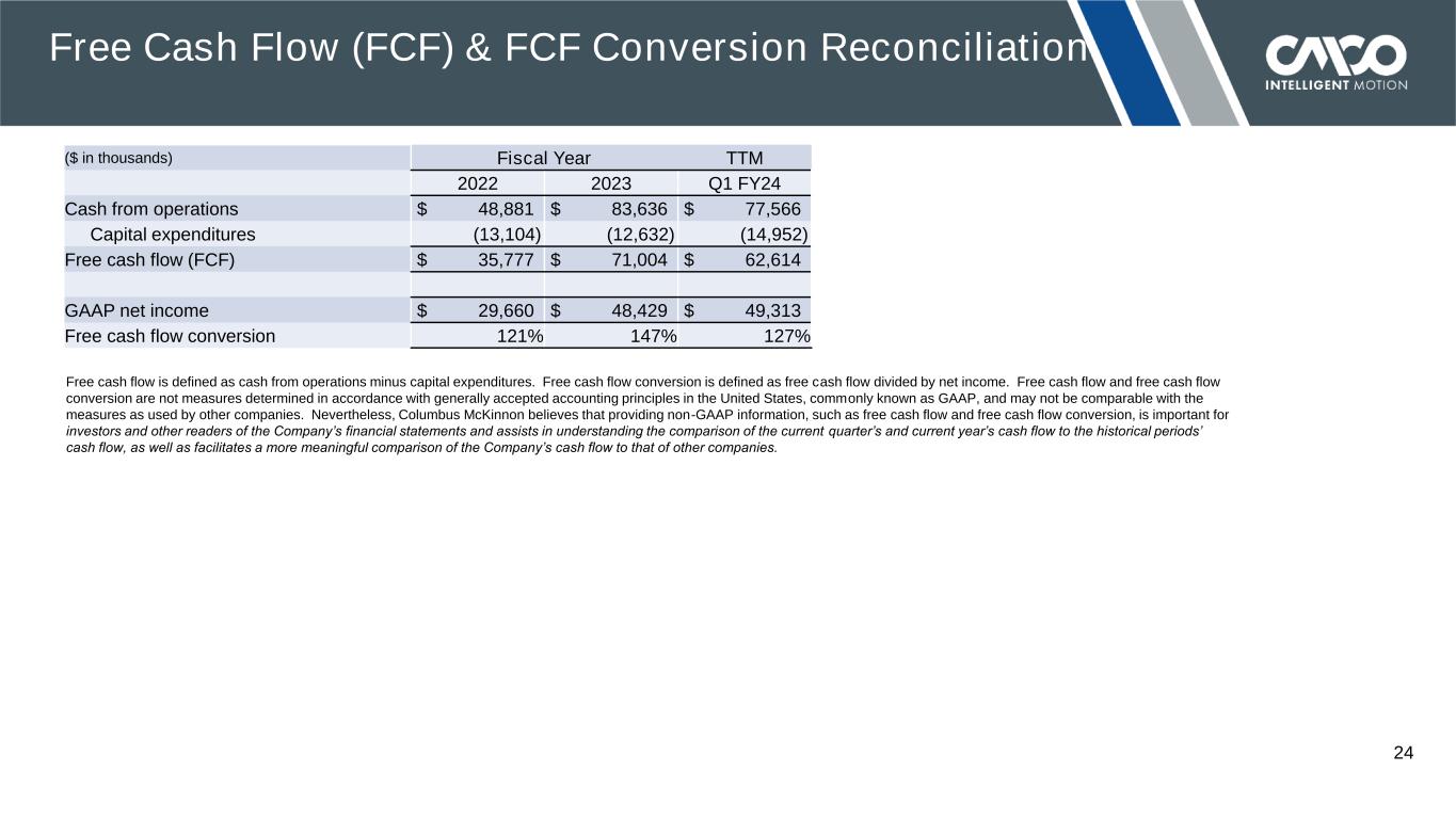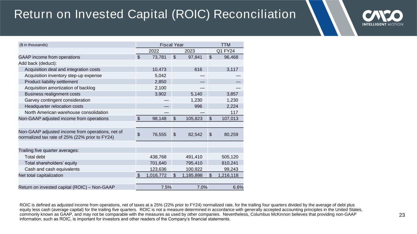 © 2023 COLUMBUS MCKINNON CORPORATION 23 Return on Invested Capital (ROIC) Reconciliation ROIC is defined as adjusted income from operations, net of taxes at a 25% (22% prior to FY24) normalized rate, for the trailing four quarters divided by the average of debt plus equity less cash (average capital) for the trailing five quarters. ROIC is not a measure determined in accordance with generally accepted accounting principles in the United States, commonly known as GAAP, and may not be comparable with the measures as used by other companies. Nevertheless, Columbus McKinnon believes that providing non-GAAP information, such as ROIC, is important for investors and other readers of the Company’s financial statements. ($ in thousands) Fiscal Year TTM 2022 2023 Q1 FY24 GAAP income from operations $ 73,781 $ 97,841 $ 96,468 Add back (deduct): Acquisition deal and integration costs 10,473 616 3,117 Acquisition inventory step-up expense 5,042 — — Product liability settlement 2,850 — — Acquisition amortization of backlog 2,100 — — Business realignment costs 3,902 5,140 3,857 Garvey contingent consideration — 1,230 1,230 Headquarter relocation costs — 996 2,224 North American warehouse consolidation — — 117 Non-GAAP adjusted income from operations $ 98,148 $ 105,823 $ 107,013 Non-GAAP adjusted income from operations, net of normalized tax rate of 25% (22% prior to FY24) $ 76,555 $ 82,542 $ 80,259 Trailing five quarter averages: Total debt 438,768 491,410 505,120 Total shareholders’ equity 701,640 795,410 810,241 Cash and cash equivalents 123,636 100,922 99,243 Net total capitalization $ 1,016,772 $ 1,185,898 $ 1,216,118 Return on invested capital (ROIC) – Non-GAAP 7.5% 7.0% 6.6%