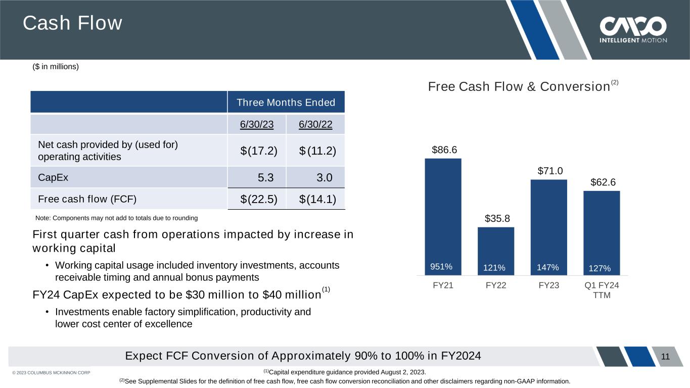 © 2023 COLUMBUS MCKINNON CORPORATION $140.1 $147.8 $149.4 15.4% 15.8% 15.7% FY22 FY23 Q1 FY24 TTM 10 Adjusted EBITDA & ROIC Return on Invested Capital (ROIC)(1) Adjusted EBITDA and Margin 7.2% 6.7% 6.6% FY22 FY23 Q1 FY24 TTM Targeting Double Digit ROIC Over Time (1)ROIC is a non-GAAP measure defined as adjusted income from operations, net of taxes at a 25% normalized rate, for the trailing four quarters divided by the average of debt plus equity less cash (average capital) for the trailing five quarters. Prior year periods have been adjusted to the 25% tax rate. Targeting 21% EBITDA margin in FY2027 • Expect 80/20 initiatives, factory simplification, and operating leverage on increased scale to drive margin expansion Transforming business with strategic investments • ROIC is key metric for LTIP compensation of executives • TTM ROIC reflects higher average capital base driven by timing of acquisitions • Strategy expected to deliver improved earnings power and ROIC over time