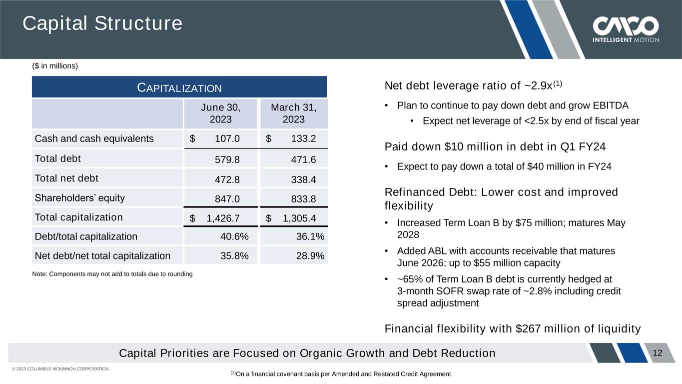 © 2023 COLUMBUS MCKINNON CORPORATION $86.6 $35.8 $71.0 $62.6 951% 121% 147% 127% FY21 FY22 FY23 Q1 FY24 TTM 11 Free Cash Flow & Conversion (2) Cash Flow Note: Components may not add to totals due to rounding Three Months Ended 6/30/23 6/30/22 Net cash provided by (used for) operating activities $ (17.2) $ (11.2) CapEx 5.3 3.0 Free cash flow (FCF) $ (22.5) $ (14.1) (1)Capital expenditure guidance provided August 2, 2023. (2)See Supplemental Slides for the definition of free cash flow, free cash flow conversion reconciliation and other disclaimers regarding non-GAAP information. First quarter cash from operations impacted by increase in working capital • Working capital usage included inventory investments, accounts receivable timing and annual bonus payments FY24 CapEx expected to be $30 million to $40 million (1) • Investments enable factory simplification, productivity and lower cost center of excellence Expect FCF Conversion of Approximately 90% to 100% in FY2024 ($ in millions)