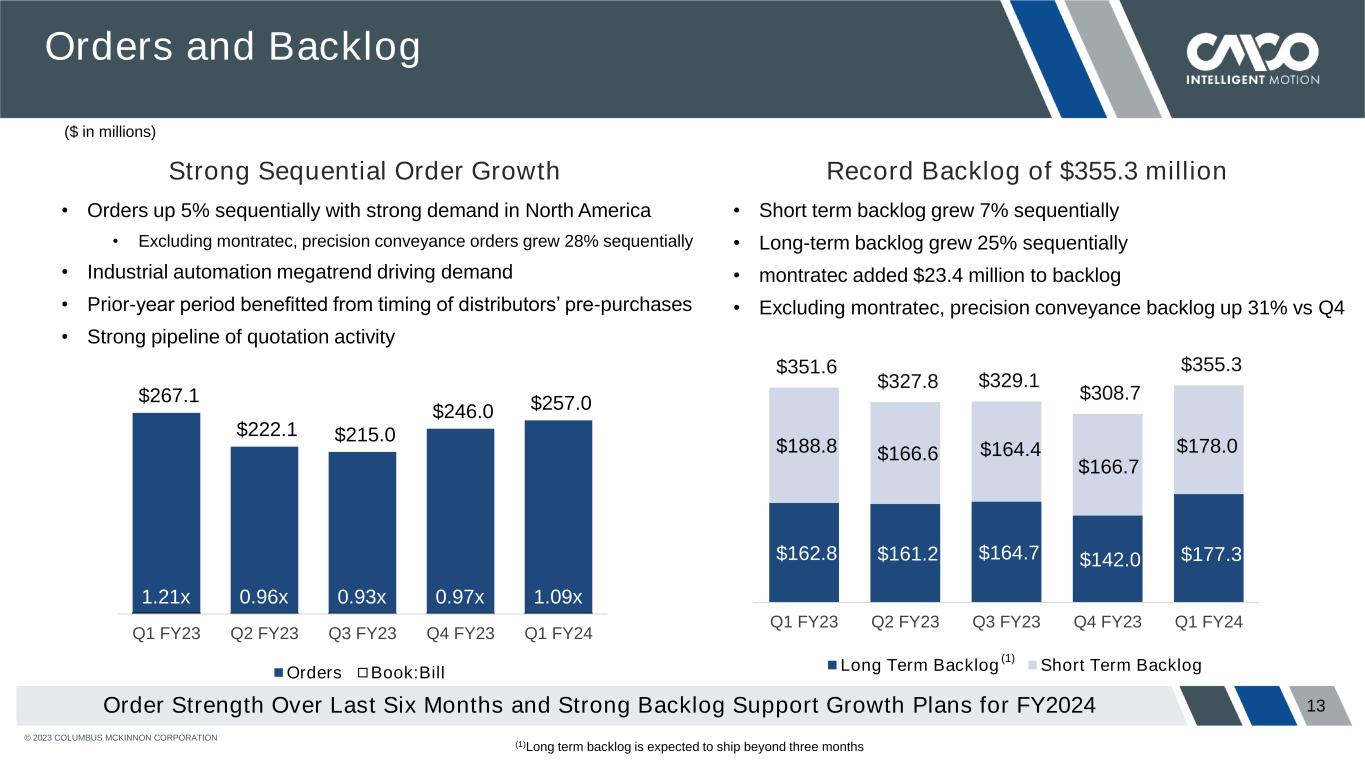 © 2023 COLUMBUS MCKINNON CORPORATION 12 Capital Structure Net debt leverage ratio of ~2.9x(1) • Plan to continue to pay down debt and grow EBITDA • Expect net leverage of <2.5x by end of fiscal year Paid down $10 million in debt in Q1 FY24 • Expect to pay down a total of $40 million in FY24 Refinanced Debt: Lower cost and improved flexibility • Increased Term Loan B by $75 million; matures May 2028 • Added ABL with accounts receivable that matures June 2026; up to $55 million capacity • ~65% of Term Loan B debt is currently hedged at 3-month SOFR swap rate of ~2.8% including credit spread adjustment Financial flexibility with $267 million of liquidity Capital Priorities are Focused on Organic Growth and Debt Reduction CAPITALIZATION June 30, 2023 March 31, 2023 Cash and cash equivalents $ 107.0 $ 133.2 Total debt 579.8 471.6 Total net debt 472.8 338.4 Shareholders’ equity 847.0 833.8 Total capitalization $ 1,426.7 $ 1,305.4 Debt/total capitalization 40.6% 36.1% Net debt/net total capitalization 35.8% 28.9% ($ in millions) Note: Components may not add to totals due to rounding (1)On a financial covenant basis per Amended and Restated Credit Agreement