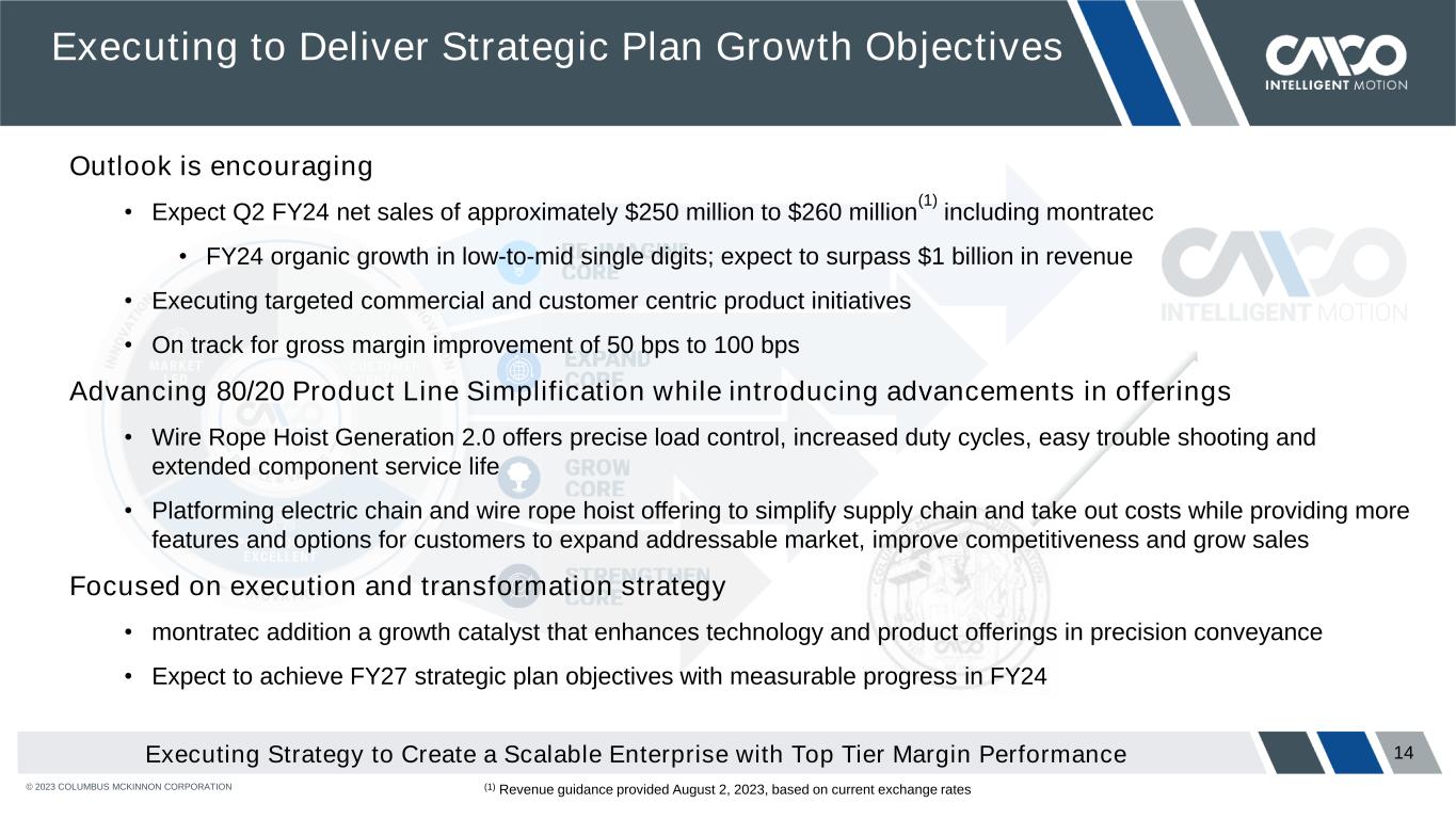 © 2023 COLUMBUS MCKINNON CORPORATION 13 Strong Sequential Order Growth Record Backlog of $355.3 million Orders and Backlog • Orders up 5% sequentially with strong demand in North America • Excluding montratec, precision conveyance orders grew 28% sequentially • Industrial automation megatrend driving demand • Prior-year period benefitted from timing of distributors’ pre-purchases • Strong pipeline of quotation activity $267.1 $222.1 $215.0 $246.0 $257.0 1.21x 0.96x 0.93x 0.97x 1.09x Q1 FY23 Q2 FY23 Q3 FY23 Q4 FY23 Q1 FY24 Orders Book:Bill (1)Long term backlog is expected to ship beyond three months $162.8 $161.2 $164.7 $142.0 $177.3 $188.8 $166.6 $164.4 $166.7 $178.0 $351.6 $327.8 $329.1 $308.7 $355.3 Q1 FY23 Q2 FY23 Q3 FY23 Q4 FY23 Q1 FY24 Long Term Backlog Short Term Backlog (1) ($ in millions) Order Strength Over Last Six Months and Strong Backlog Support Growth Plans for FY2024 • Short term backlog grew 7% sequentially • Long-term backlog grew 25% sequentially • montratec added $23.4 million to backlog • Excluding montratec, precision conveyance backlog up 31% vs Q4