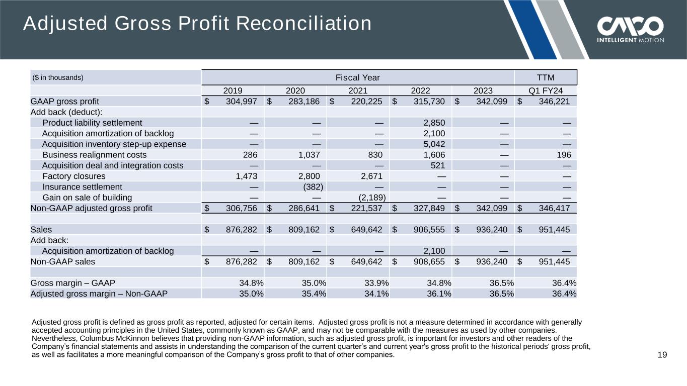 © 2023 COLUMBUS MCKINNON CORPORATION 18 Adjusted Gross Profit Reconciliation Adjusted gross profit is defined as gross profit as reported, adjusted for certain items. Adjusted gross profit is not a measure determined in accordance with generally accepted accounting principles in the United States, commonly known as GAAP, and may not be comparable with the measures as used by other companies. Nevertheless, Columbus McKinnon believes that providing non-GAAP information, such as adjusted gross profit, is important for investors and other readers of the Company’s financial statements and assists in understanding the comparison of the current quarter’s and current year's gross profit to the historical periods' gross profit, as well as facilitates a more meaningful comparison of the Company’s gross profit to that of other companies. ($ in thousands) Quarter Q1 FY23 Q2 FY23 Q3 FY23 Q4 FY23 Q1 FY24 GAAP gross profit $ 82,519 $ 86,310 $ 82,044 91,218 86,649 Add back (deduct): Business realignment costs — — — — 196 Non-GAAP adjusted gross profit $ 82,519 $ 86,310 $ 82,044 $ 91,218 $ 86,845 Sales $ 220,287 $ 231,740 $ 230,370 $ 253,843 $ 235,492 Gross margin – GAAP 37.5% 37.2% 35.6% 35.9% 36.8% Adjusted gross margin – Non-GAAP 37.5% 37.2% 35.6% 35.9% 36.9%