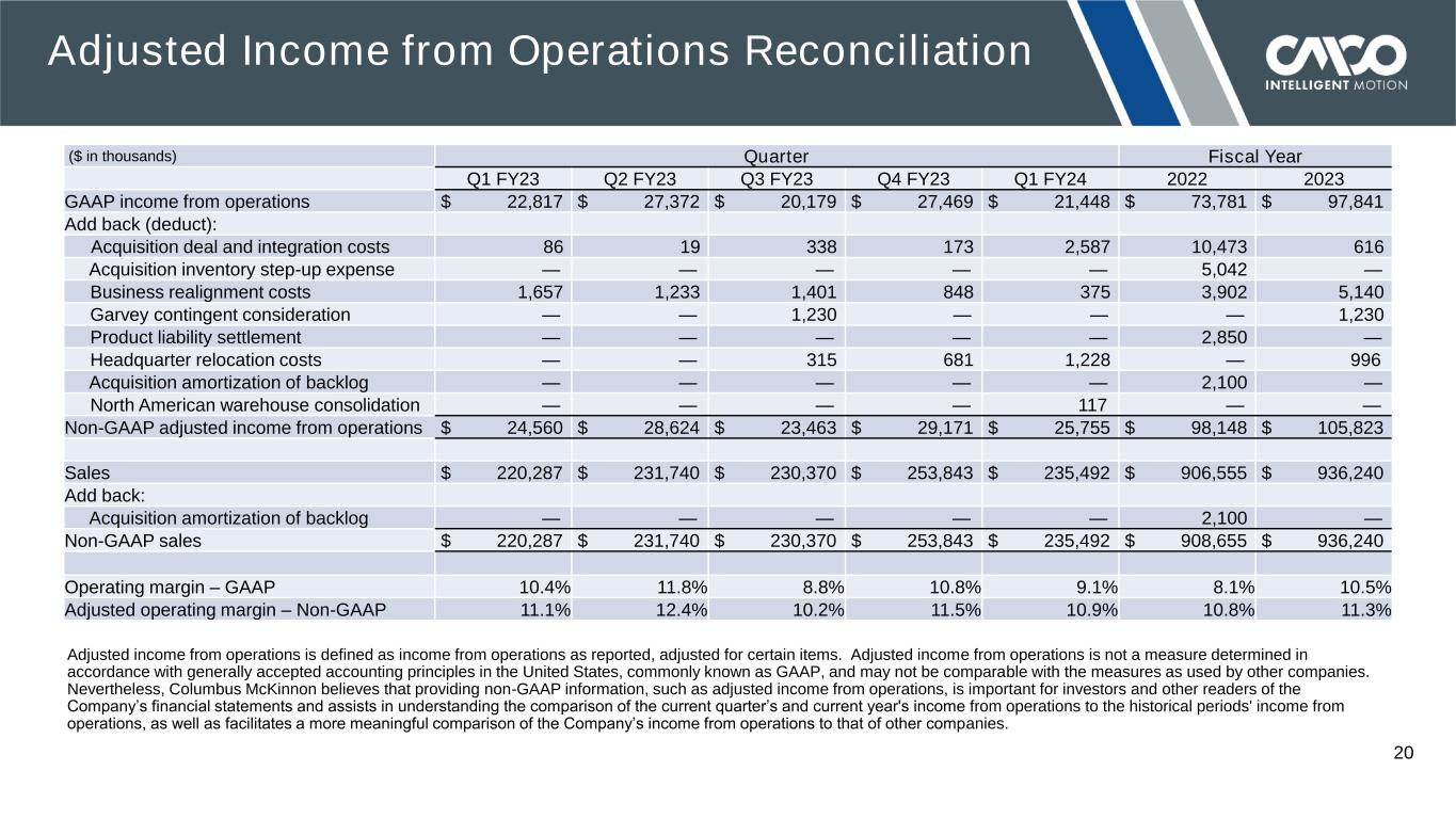 © 2023 COLUMBUS MCKINNON CORPORATION 19 Adjusted Gross Profit Reconciliation Adjusted gross profit is defined as gross profit as reported, adjusted for certain items. Adjusted gross profit is not a measure determined in accordance with generally accepted accounting principles in the United States, commonly known as GAAP, and may not be comparable with the measures as used by other companies. Nevertheless, Columbus McKinnon believes that providing non-GAAP information, such as adjusted gross profit, is important for investors and other readers of the Company’s financial statements and assists in understanding the comparison of the current quarter’s and current year's gross profit to the historical periods' gross profit, as well as facilitates a more meaningful comparison of the Company’s gross profit to that of other companies. ($ in thousands) Fiscal Year TTM 2019 2020 2021 2022 2023 Q1 FY24 GAAP gross profit $ 304,997 $ 283,186 $ 220,225 $ 315,730 $ 342,099 $ 346,221 Add back (deduct): Product liability settlement — — — 2,850 — — Acquisition amortization of backlog — — — 2,100 — — Acquisition inventory step-up expense — — — 5,042 — — Business realignment costs 286 1,037 830 1,606 — 196 Acquisition deal and integration costs — — — 521 — — Factory closures 1,473 2,800 2,671 — — — Insurance settlement — (382) — — — — Gain on sale of building — — (2,189) — — — Non-GAAP adjusted gross profit $ 306,756 $ 286,641 $ 221,537 $ 327,849 $ 342,099 $ 346,417 Sales $ 876,282 $ 809,162 $ 649,642 $ 906,555 $ 936,240 $ 951,445 Add back: Acquisition amortization of backlog — — — 2,100 — — Non-GAAP sales $ 876,282 $ 809,162 $ 649,642 $ 908,655 $ 936,240 $ 951,445 Gross margin – GAAP 34.8% 35.0% 33.9% 34.8% 36.5% 36.4% Adjusted gross margin – Non-GAAP 35.0% 35.4% 34.1% 36.1% 36.5% 36.4%