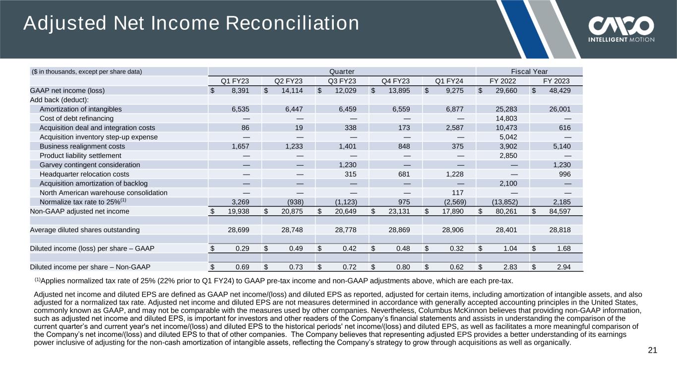 © 2023 COLUMBUS MCKINNON CORPORATION 20 Adjusted Income from Operations Reconciliation Adjusted income from operations is defined as income from operations as reported, adjusted for certain items. Adjusted income from operations is not a measure determined in accordance with generally accepted accounting principles in the United States, commonly known as GAAP, and may not be comparable with the measures as used by other companies. Nevertheless, Columbus McKinnon believes that providing non-GAAP information, such as adjusted income from operations, is important for investors and other readers of the Company’s financial statements and assists in understanding the comparison of the current quarter’s and current year's income from operations to the historical periods' income from operations, as well as facilitates a more meaningful comparison of the Company’s income from operations to that of other companies. ($ in thousands) Quarter Fiscal Year Q1 FY23 Q2 FY23 Q3 FY23 Q4 FY23 Q1 FY24 2022 2023 GAAP income from operations $ 22,817 $ 27,372 $ 20,179 $ 27,469 $ 21,448 $ 73,781 $ 97,841 Add back (deduct): Acquisition deal and integration costs 86 19 338 173 2,587 10,473 616 Acquisition inventory step-up expense — — — — — 5,042 — Business realignment costs 1,657 1,233 1,401 848 375 3,902 5,140 Garvey contingent consideration — — 1,230 — — — 1,230 Product liability settlement — — — — — 2,850 — Headquarter relocation costs — — 315 681 1,228 — 996 Acquisition amortization of backlog — — — — — 2,100 — North American warehouse consolidation — — — — 117 — — Non-GAAP adjusted income from operations $ 24,560 $ 28,624 $ 23,463 $ 29,171 $ 25,755 $ 98,148 $ 105,823 Sales $ 220,287 $ 231,740 $ 230,370 $ 253,843 $ 235,492 $ 906,555 $ 936,240 Add back: Acquisition amortization of backlog — — — — — 2,100 — Non-GAAP sales $ 220,287 $ 231,740 $ 230,370 $ 253,843 $ 235,492 $ 908,655 $ 936,240 Operating margin – GAAP 10.4% 11.8% 8.8% 10.8% 9.1% 8.1% 10.5% Adjusted operating margin – Non-GAAP 11.1% 12.4% 10.2% 11.5% 10.9% 10.8% 11.3%