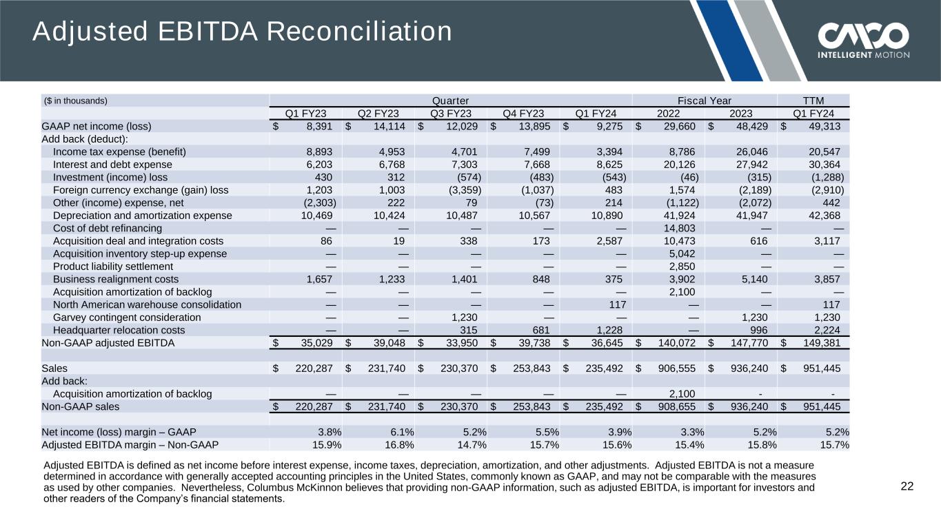 © 2023 COLUMBUS MCKINNON CORPORATION 21 Adjusted Net Income Reconciliation (1)Applies normalized tax rate of 25% (22% prior to Q1 FY24) to GAAP pre-tax income and non-GAAP adjustments above, which are each pre-tax. Adjusted net income and diluted EPS are defined as GAAP net income/(loss) and diluted EPS as reported, adjusted for certain items, including amortization of intangible assets, and also adjusted for a normalized tax rate. Adjusted net income and diluted EPS are not measures determined in accordance with generally accepted accounting principles in the United States, commonly known as GAAP, and may not be comparable with the measures used by other companies. Nevertheless, Columbus McKinnon believes that providing non-GAAP information, such as adjusted net income and diluted EPS, is important for investors and other readers of the Company’s financial statements and assists in understanding the comparison of the current quarter’s and current year's net income/(loss) and diluted EPS to the historical periods' net income/(loss) and diluted EPS, as well as facilitates a more meaningful comparison of the Company’s net income/(loss) and diluted EPS to that of other companies. The Company believes that representing adjusted EPS provides a better understanding of its earnings power inclusive of adjusting for the non-cash amortization of intangible assets, reflecting the Company’s strategy to grow through acquisitions as well as organically. ($ in thousands, except per share data) Quarter Fiscal Year Q1 FY23 Q2 FY23 Q3 FY23 Q4 FY23 Q1 FY24 FY 2022 FY 2023 GAAP net income (loss) $ 8,391 $ 14,114 $ 12,029 $ 13,895 $ 9,275 $ 29,660 $ 48,429 Add back (deduct): Amortization of intangibles 6,535 6,447 6,459 6,559 6,877 25,283 26,001 Cost of debt refinancing — — — — — 14,803 — Acquisition deal and integration costs 86 19 338 173 2,587 10,473 616 Acquisition inventory step-up expense — — — — — 5,042 — Business realignment costs 1,657 1,233 1,401 848 375 3,902 5,140 Product liability settlement — — — — — 2,850 — Garvey contingent consideration — — 1,230 — — — 1,230 Headquarter relocation costs — — 315 681 1,228 — 996 Acquisition amortization of backlog — — — — — 2,100 — North American warehouse consolidation — — — — 117 — — Normalize tax rate to 25%(1) 3,269 (938) (1,123) 975 (2,569) (13,852) 2,185 Non-GAAP adjusted net income $ 19,938 $ 20,875 $ 20,649 $ 23,131 $ 17,890 $ 80,261 $ 84,597 Average diluted shares outstanding 28,699 28,748 28,778 28,869 28,906 28,401 28,818 Diluted income (loss) per share – GAAP $ 0.29 $ 0.49 $ 0.42 $ 0.48 $ 0.32 $ 1.04 $ 1.68 Diluted income per share – Non-GAAP $ 0.69 $ 0.73 $ 0.72 $ 0.80 $ 0.62 $ 2.83 $ 2.94