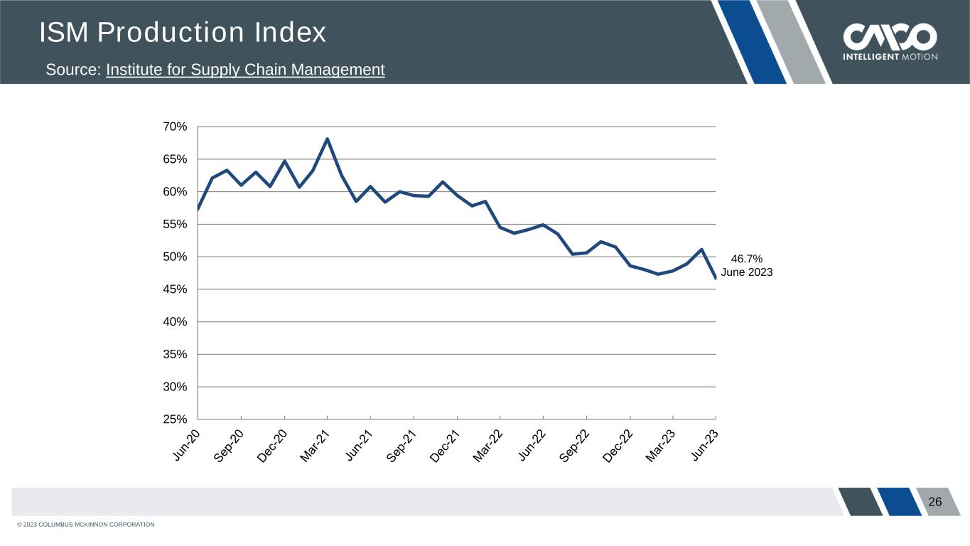 © 2023 COLUMBUS MCKINNON CORPORATION 26 ISM Production Index Source: Institute for Supply Chain Management 25% 30% 35% 40% 45% 50% 55% 60% 65% 70% 46.7% June 2023