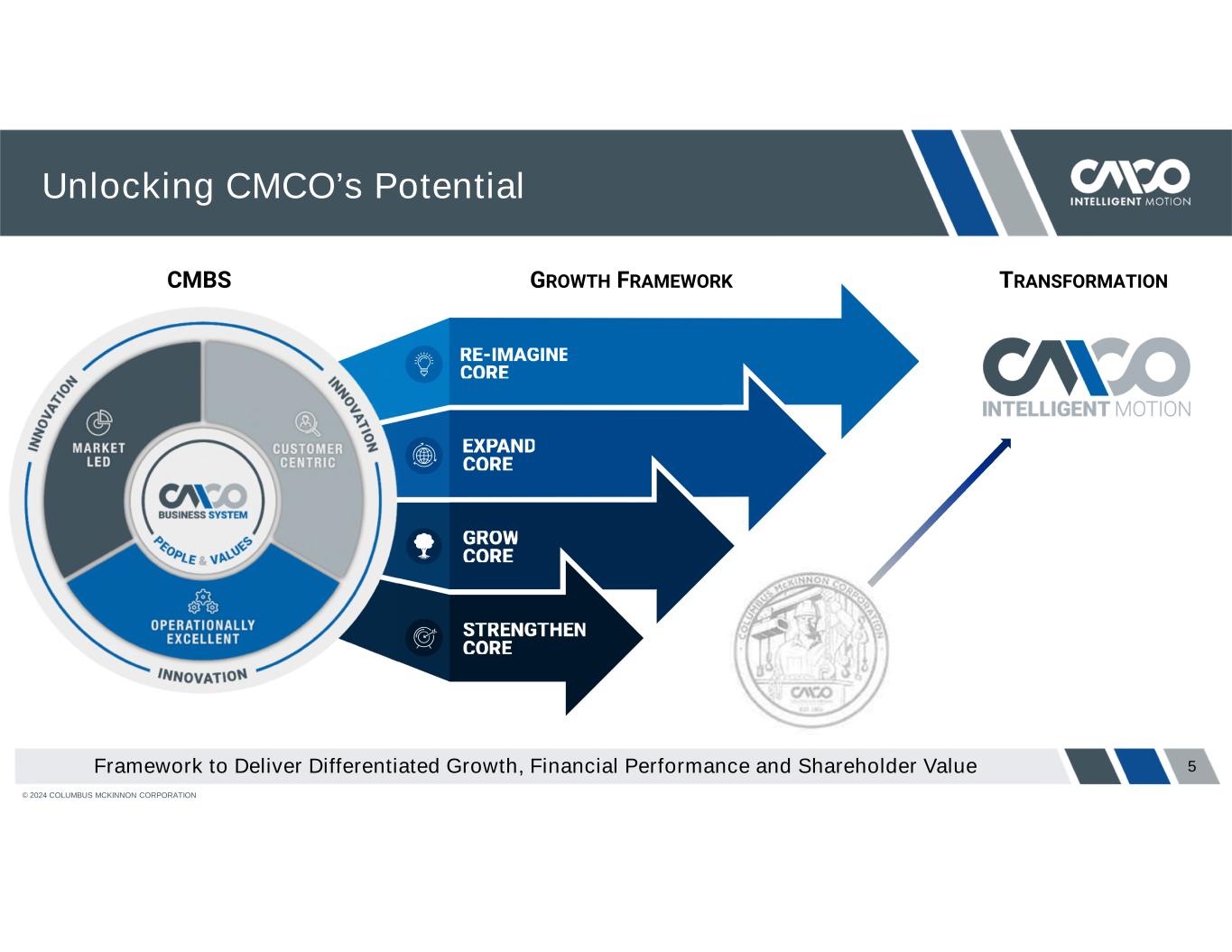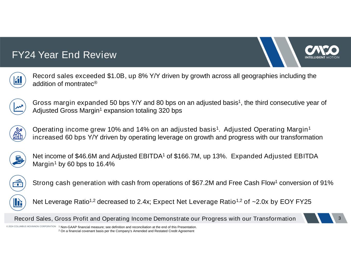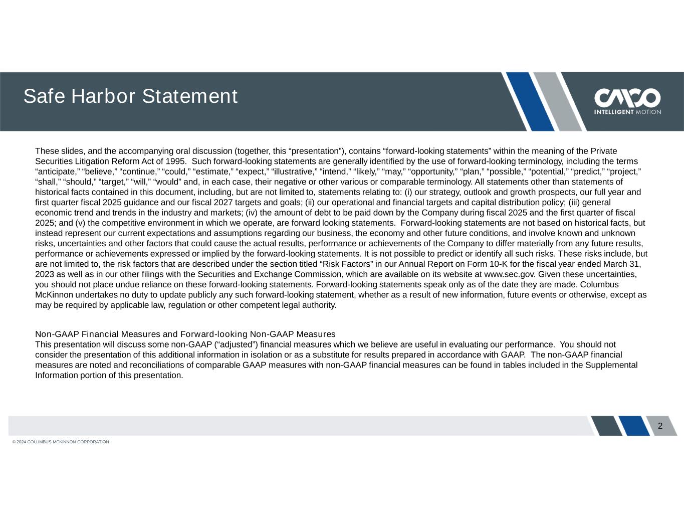 © 2024 COLUMBUS MCKINNON CORPORATION These slides, and the accompanying oral discussion (together, this “presentation”), contains “forward-looking statements” within the meaning of the Private Securities Litigation Reform Act of 1995. Such forward-looking statements are generally identified by the use of forward-looking terminology, including the terms “anticipate,” “believe,” “continue,” “could,” “estimate,” “expect,” “illustrative,” “intend,” “likely,” “may,” “opportunity,” “plan,” “possible,” “potential,” “predict,” “project,” “shall,” “should,” “target,” “will,” “would” and, in each case, their negative or other various or comparable terminology. All statements other than statements of historical facts contained in this document, including, but are not limited to, statements relating to: (i) our strategy, outlook and growth prospects, our full year and first quarter fiscal 2025 guidance and our fiscal 2027 targets and goals; (ii) our operational and financial targets and capital distribution policy; (iii) general economic trend and trends in the industry and markets; (iv) the amount of debt to be paid down by the Company during fiscal 2025 and the first quarter of fiscal 2025; and (v) the competitive environment in which we operate, are forward looking statements. Forward-looking statements are not based on historical facts, but instead represent our current expectations and assumptions regarding our business, the economy and other future conditions, and involve known and unknown risks, uncertainties and other factors that could cause the actual results, performance or achievements of the Company to differ materially from any future results, performance or achievements expressed or implied by the forward-looking statements. It is not possible to predict or identify all such risks. These risks include, but are not limited to, the risk factors that are described under the section titled “Risk Factors” in our Annual Report on Form 10-K for the fiscal year ended March 31, 2023 as well as in our other filings with the Securities and Exchange Commission, which are available on its website at www.sec.gov. Given these uncertainties, you should not place undue reliance on these forward-looking statements. Forward-looking statements speak only as of the date they are made. Columbus McKinnon undertakes no duty to update publicly any such forward-looking statement, whether as a result of new information, future events or otherwise, except as may be required by applicable law, regulation or other competent legal authority. Non-GAAP Financial Measures and Forward-looking Non-GAAP Measures This presentation will discuss some non-GAAP (“adjusted”) financial measures which we believe are useful in evaluating our performance. You should not consider the presentation of this additional information in isolation or as a substitute for results prepared in accordance with GAAP. The non-GAAP financial measures are noted and reconciliations of comparable GAAP measures with non-GAAP financial measures can be found in tables included in the Supplemental Information portion of this presentation. Safe Harbor Statement 2