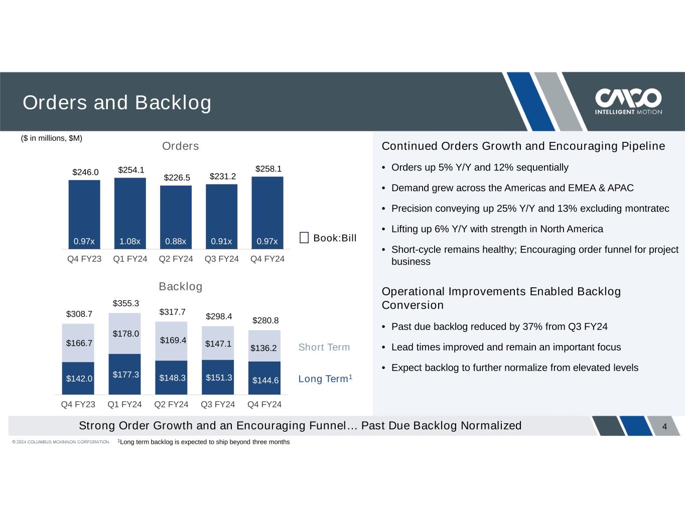 © 2024 COLUMBUS MCKINNON CORPORATION 3 FY24 Year End Review • Record sales exceeded $1.0B, up 8% Y/Y driven by growth across all geographies including the addition of montratec® • Gross margin expanded 50 bps Y/Y and 80 bps on an adjusted basis1, the third consecutive year of Adjusted Gross Margin1 expansion totaling 320 bps • Operating income grew 10% and 14% on an adjusted basis1. Adjusted Operating Margin1 increased 60 bps Y/Y driven by operating leverage on growth and progress with our transformation • Net income of $46.6M and Adjusted EBITDA1 of $166.7M, up 13%. Expanded Adjusted EBITDA Margin1 by 60 bps to 16.4% • Strong cash generation with cash from operations of $67.2M and Free Cash Flow1 conversion of 91% • Net Leverage Ratio1,2 decreased to 2.4x; Expect Net Leverage Ratio1,2 of ~2.0x by EOY FY25 Record Sales, Gross Profit and Operating Income Demonstrate our Progress with our Transformation 1 Non-GAAP financial measure; see definition and reconciliation at the end of this Presentation. 2 On a financial covenant basis per the Company’s Amended and Restated Credit Agreement
