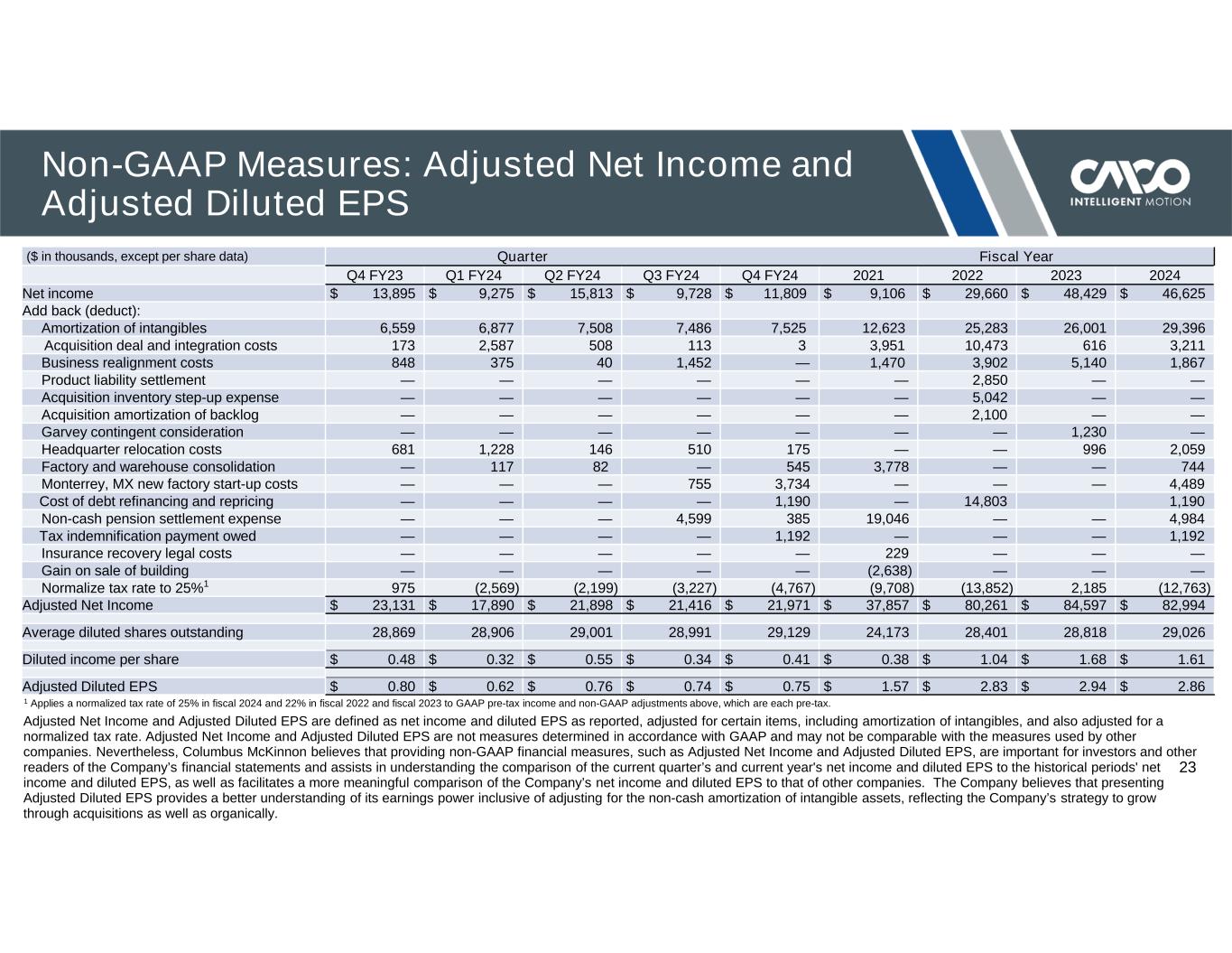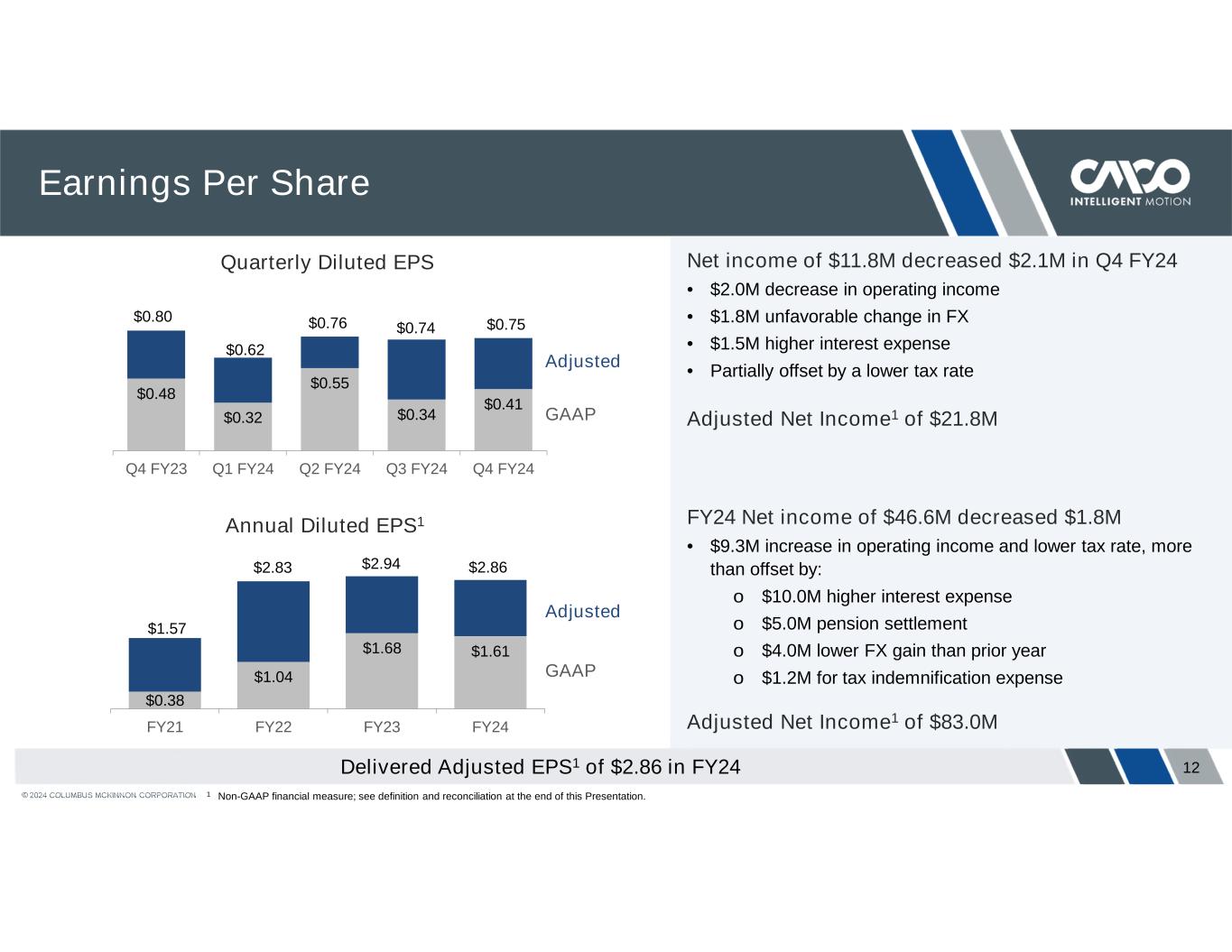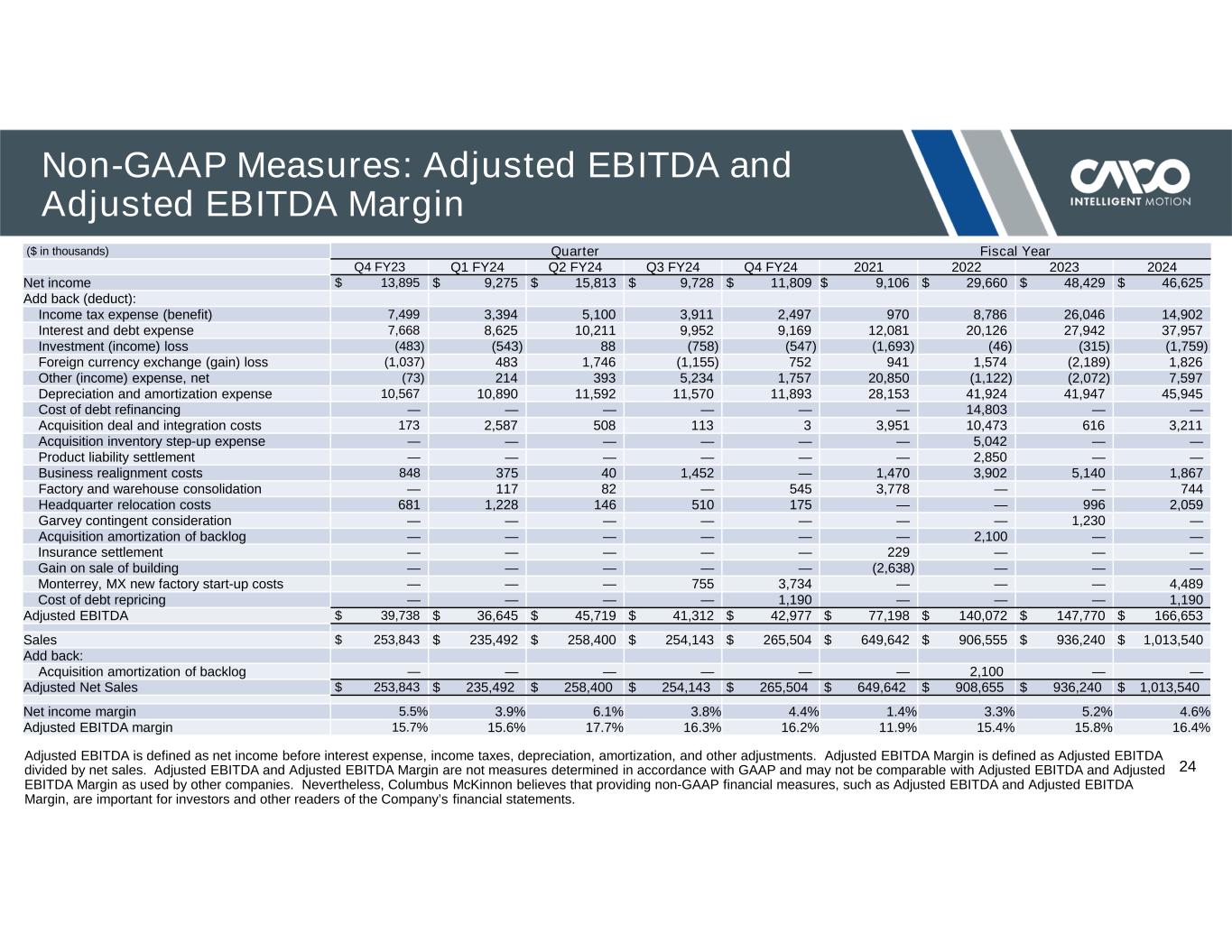 © 2024 COLUMBUS MCKINNON CORPORATION 23 1 Applies a normalized tax rate of 25% in fiscal 2024 and 22% in fiscal 2022 and fiscal 2023 to GAAP pre-tax income and non-GAAP adjustments above, which are each pre-tax. Adjusted Net Income and Adjusted Diluted EPS are defined as net income and diluted EPS as reported, adjusted for certain items, including amortization of intangibles, and also adjusted for a normalized tax rate. Adjusted Net Income and Adjusted Diluted EPS are not measures determined in accordance with GAAP and may not be comparable with the measures used by other companies. Nevertheless, Columbus McKinnon believes that providing non-GAAP financial measures, such as Adjusted Net Income and Adjusted Diluted EPS, are important for investors and other readers of the Company’s financial statements and assists in understanding the comparison of the current quarter’s and current year's net income and diluted EPS to the historical periods' net income and diluted EPS, as well as facilitates a more meaningful comparison of the Company’s net income and diluted EPS to that of other companies. The Company believes that presenting Adjusted Diluted EPS provides a better understanding of its earnings power inclusive of adjusting for the non-cash amortization of intangible assets, reflecting the Company’s strategy to grow through acquisitions as well as organically. Fiscal YearQuarter($ in thousands, except per share data) 2024202320222021Q4 FY24Q3 FY24Q2 FY24Q1 FY24Q4 FY23 $ 46,625$ 48,429 $ 29,660 $ 9,106 $ 11,809$ 9,728 $ 15,813 $ 9,275 $ 13,895 Net income Add back (deduct): 29,396 26,001 25,283 12,623 7,525 7,486 7,508 6,877 6,559 Amortization of intangibles 3,211616 10,4733,9513 113 508 2,587 173 Acquisition deal and integration costs 1,867 5,140 3,9021,470—1,452 40 375 848 Business realignment costs ——2,850——————Product liability settlement ——5,042——————Acquisition inventory step-up expense ——2,100——————Acquisition amortization of backlog —1,230 ———————Garvey contingent consideration 2,059 996 ——175510 146 1,228 681 Headquarter relocation costs 744 ——3,778545—82 117 —Factory and warehouse consolidation 4,489 ———3,734755 ———Monterrey, MX new factory start-up costs 1,19014,803—1,190————Cost of debt refinancing and repricing 4,984——19,046 385 4,599 ———Non-cash pension settlement expense 1,192———1,192————Tax indemnification payment owed ———229—————Insurance recovery legal costs ———(2,638)—————Gain on sale of building (12,763) 2,185 (13,852)(9,708) (4,767)(3,227)(2,199)(2,569)975 Normalize tax rate to 25%1 $ 82,994 $ 84,597 $ 80,261 $ 37,857 $ 21,971$ 21,416 $ 21,898 $ 17,890 $ 23,131 Adjusted Net Income 29,026 28,818 28,401 24,173 29,129 28,991 29,001 28,906 28,869 Average diluted shares outstanding $ 1.61 $ 1.68 $ 1.04 $ 0.38 $ 0.41 $ 0.34 $ 0.55 $ 0.32 $ 0.48 Diluted income per share $ 2.86 $ 2.94 $ 2.83 $ 1.57 $ 0.75 $ 0.74 $ 0.76 $ 0.62 $ 0.80 Adjusted Diluted EPS Non-GAAP Measures: Adjusted Net Income and Adjusted Diluted EPS