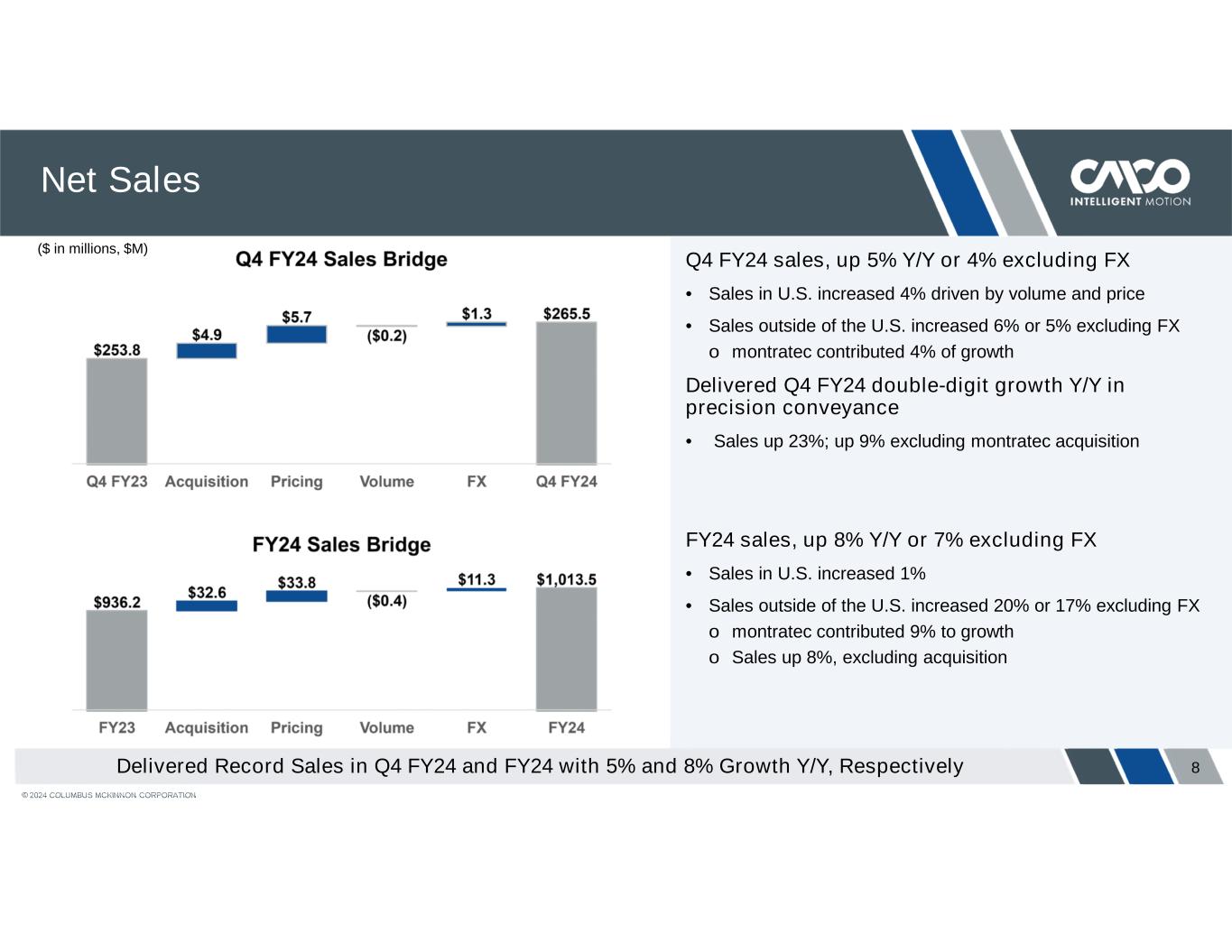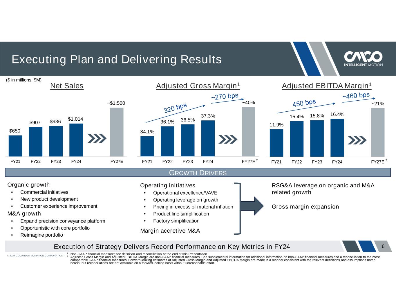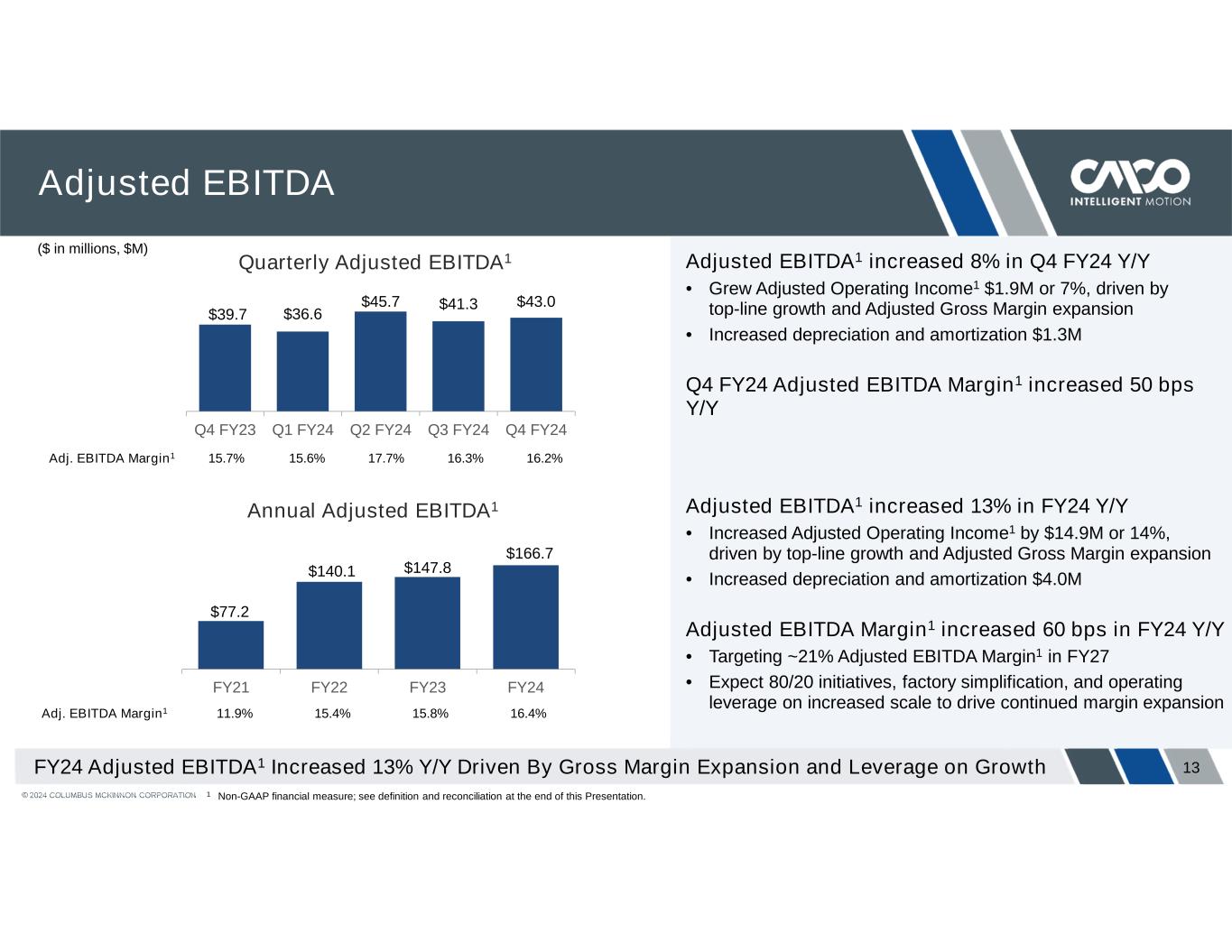 © 2024 COLUMBUS MCKINNON CORPORATION 23 1 Applies a normalized tax rate of 25% in fiscal 2024 and 22% in fiscal 2022 and fiscal 2023 to GAAP pre-tax income and non-GAAP adjustments above, which are each pre-tax. Adjusted Net Income and Adjusted Diluted EPS are defined as net income and diluted EPS as reported, adjusted for certain items, including amortization of intangibles, and also adjusted for a normalized tax rate. Adjusted Net Income and Adjusted Diluted EPS are not measures determined in accordance with GAAP and may not be comparable with the measures used by other companies. Nevertheless, Columbus McKinnon believes that providing non-GAAP financial measures, such as Adjusted Net Income and Adjusted Diluted EPS, are important for investors and other readers of the Company’s financial statements and assists in understanding the comparison of the current quarter’s and current year's net income and diluted EPS to the historical periods' net income and diluted EPS, as well as facilitates a more meaningful comparison of the Company’s net income and diluted EPS to that of other companies. The Company believes that presenting Adjusted Diluted EPS provides a better understanding of its earnings power inclusive of adjusting for the non-cash amortization of intangible assets, reflecting the Company’s strategy to grow through acquisitions as well as organically. Fiscal YearQuarter($ in thousands, except per share data) 2024202320222021Q4 FY24Q3 FY24Q2 FY24Q1 FY24Q4 FY23 $ 46,625$ 48,429 $ 29,660 $ 9,106 $ 11,809$ 9,728 $ 15,813 $ 9,275 $ 13,895 Net income Add back (deduct): 29,396 26,001 25,283 12,623 7,525 7,486 7,508 6,877 6,559 Amortization of intangibles 3,211616 10,4733,9513 113 508 2,587 173 Acquisition deal and integration costs 1,867 5,140 3,9021,470—1,452 40 375 848 Business realignment costs ——2,850——————Product liability settlement ——5,042——————Acquisition inventory step-up expense ——2,100——————Acquisition amortization of backlog —1,230 ———————Garvey contingent consideration 2,059 996 ——175510 146 1,228 681 Headquarter relocation costs 744 ——3,778545—82 117 —Factory and warehouse consolidation 4,489 ———3,734755 ———Monterrey, MX new factory start-up costs 1,19014,803—1,190————Cost of debt refinancing and repricing 4,984——19,046 385 4,599 ———Non-cash pension settlement expense 1,192———1,192————Tax indemnification payment owed ———229—————Insurance recovery legal costs ———(2,638)—————Gain on sale of building (12,763) 2,185 (13,852)(9,708) (4,767)(3,227)(2,199)(2,569)975 Normalize tax rate to 25%1 $ 82,994 $ 84,597 $ 80,261 $ 37,857 $ 21,971$ 21,416 $ 21,898 $ 17,890 $ 23,131 Adjusted Net Income 29,026 28,818 28,401 24,173 29,129 28,991 29,001 28,906 28,869 Average diluted shares outstanding $ 1.61 $ 1.68 $ 1.04 $ 0.38 $ 0.41 $ 0.34 $ 0.55 $ 0.32 $ 0.48 Diluted income per share $ 2.86 $ 2.94 $ 2.83 $ 1.57 $ 0.75 $ 0.74 $ 0.76 $ 0.62 $ 0.80 Adjusted Diluted EPS Non-GAAP Measures: Adjusted Net Income and Adjusted Diluted EPS
